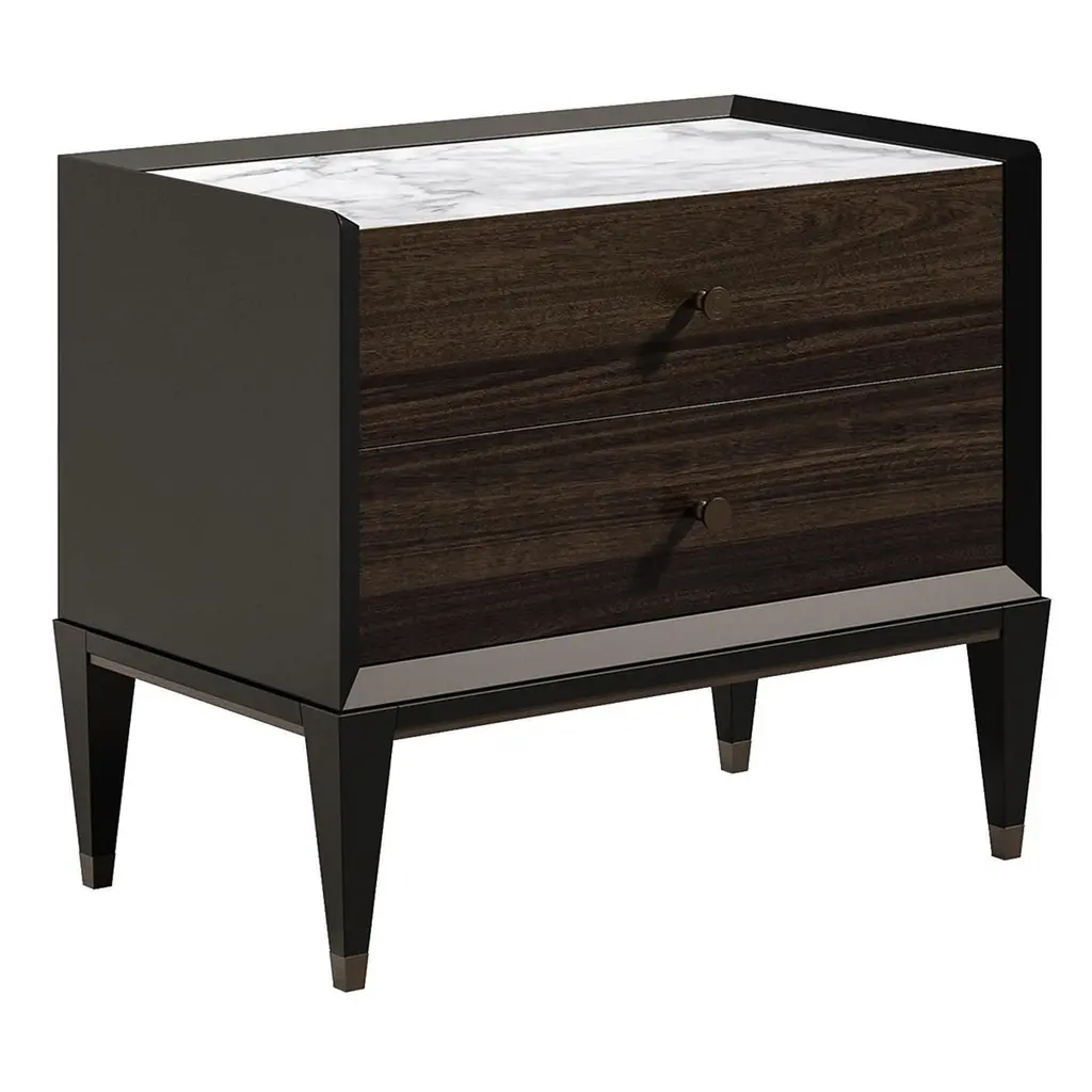Part of the Eclipse collection, the austere frame of this modern nightstand is finished in black with a velvet-like effect. The encased, two-drawer unit features brown veneered front panels with round metal handles and a striking white marble top. Paired with a twin to accent the sides of the Eclipse bedframe, this sophisticated two-tone piece will be a statement in the bedroom, but could also serve as a functional and eye-catching side table in a modern and Minimalist decor.