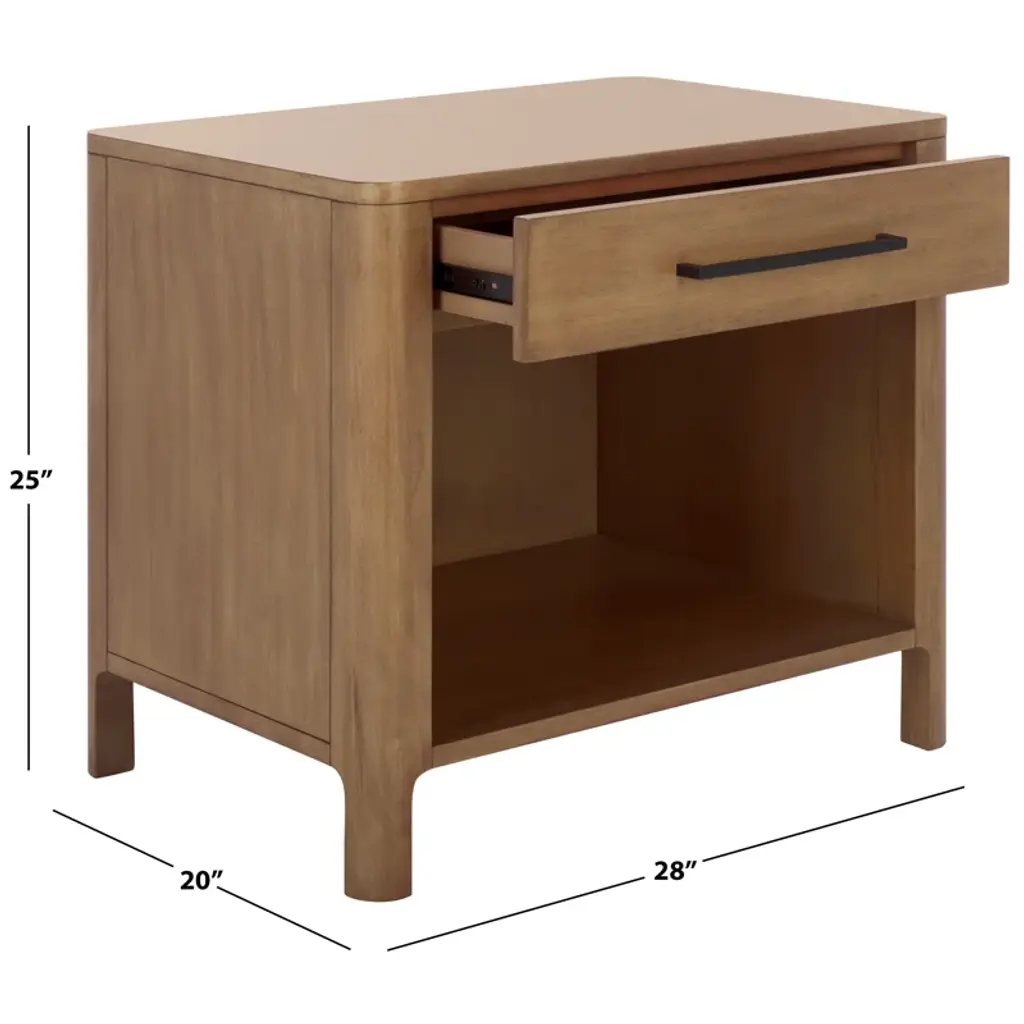Experience elegance and functionality combined with the Edgeworth 1 Drawer Wood Nightstand. Sporting a rich, black finish over its stunning mahogany veneer, this nightstand is an exemplary choice for those who love the distinct beauty of luxurious mahogany. A classic design is artistically blended with the strength of iron to increase stability and resilience. It's not just an essential piece of furniture; it's a silent world where you store your secrets, dreams, and memories. Be ready to upgrade your bedroom decor with the exquisite Edgeworth 1 Drawer Wood Nightstand. Made for those with an eye for design perfection.
