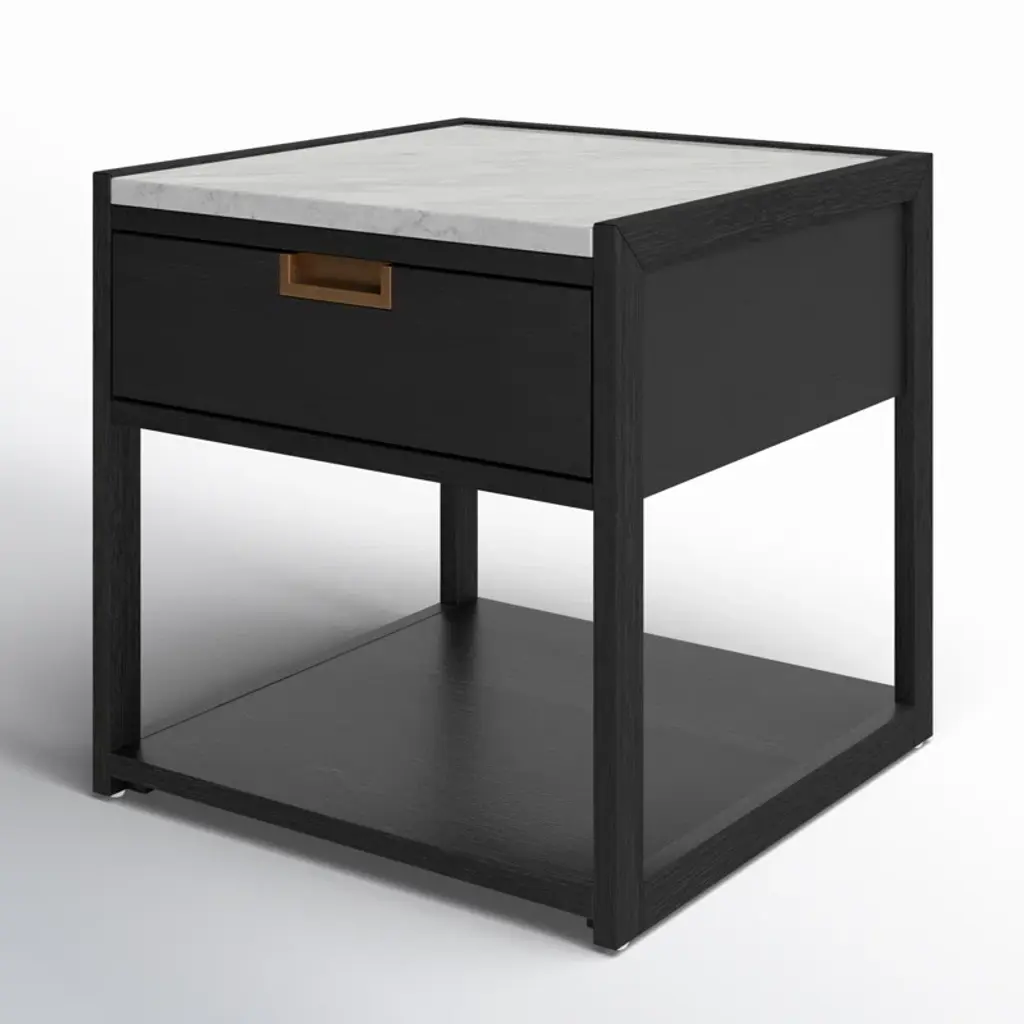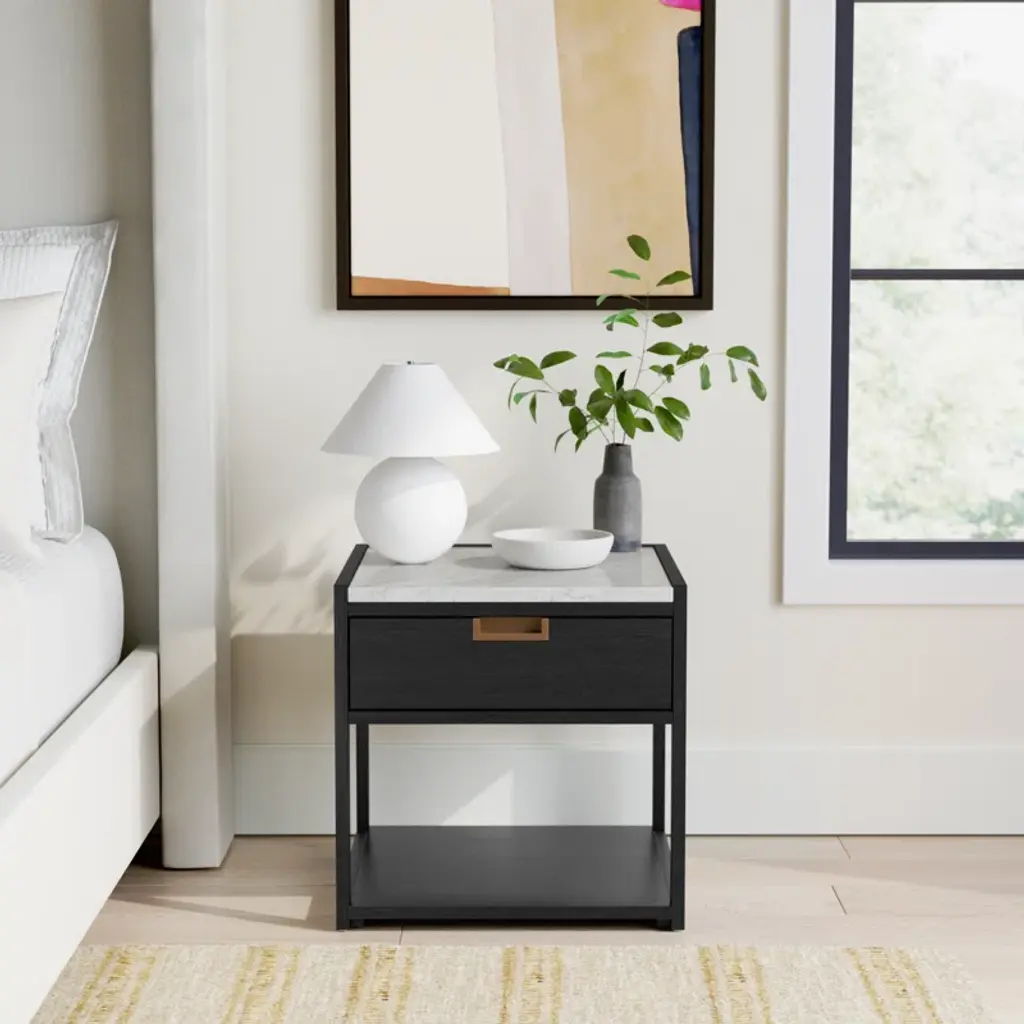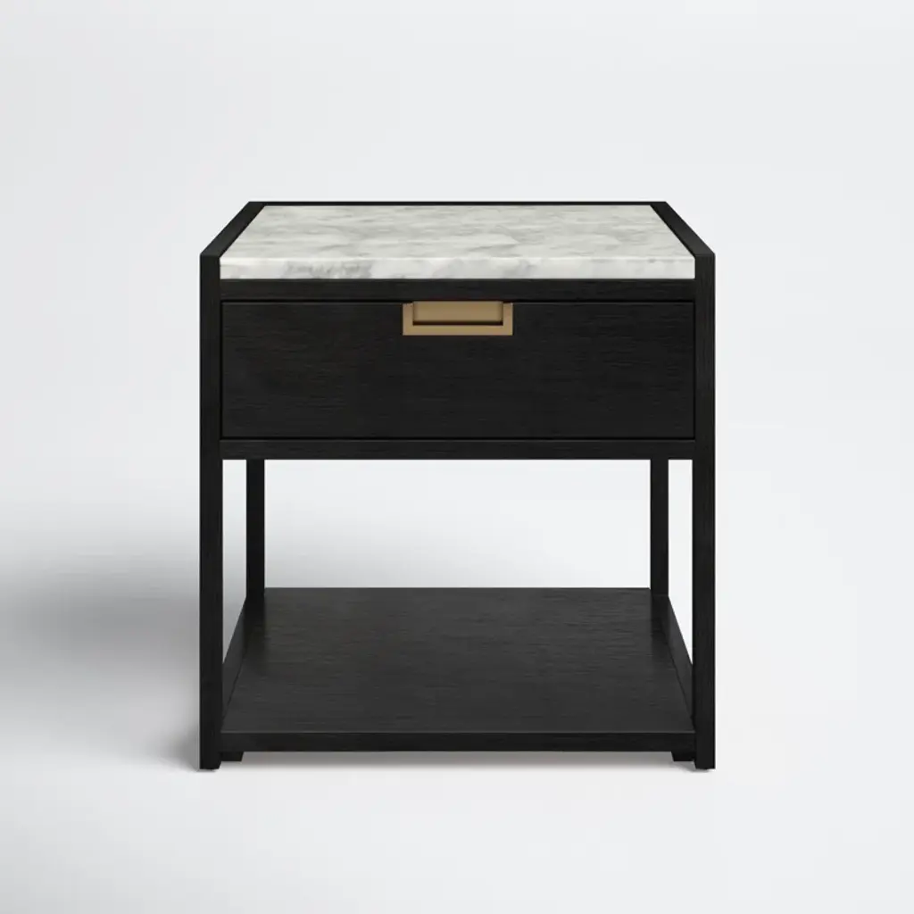 Get the look and feel of a 5-star suite every night as you fall asleep next to this distinguished nightstand. Made from solid and engineered wood with a dark chocolate finish, it has an authentic white marble top and antique brass metal handles. Its single soft-close drawers provide out-of-sight storage for nighttime essentials, plus a lower shelf for extra storage or even a small display. And, with a narrow height and width just below 20”, it’s easily at-home in small spaces or next to shorter beds.