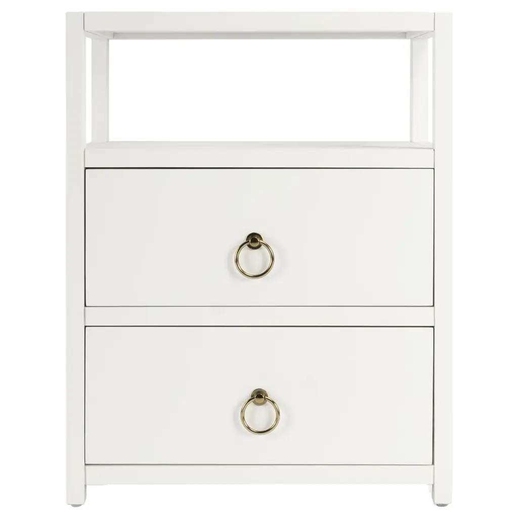 The minimalist design of this oversized nightstand makes it an ideal addition to most contemporary spaces. Expertly crafted from acacia wood solids and engineered wood products, it features two spacious drawers with ball bearing glides for easy opening and closing and metal ring pulls in a gorgeous finish. Just beneath the top is an open shelf for keeping essentials organized and within reach - it is a great spot to charge a phone or other device. It can also be used as an end table and is available in a choice of finish colors.
