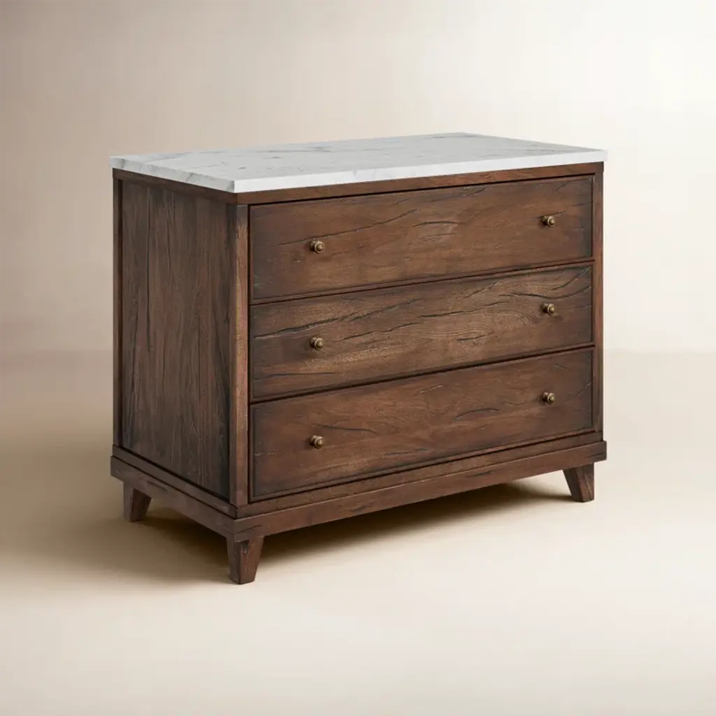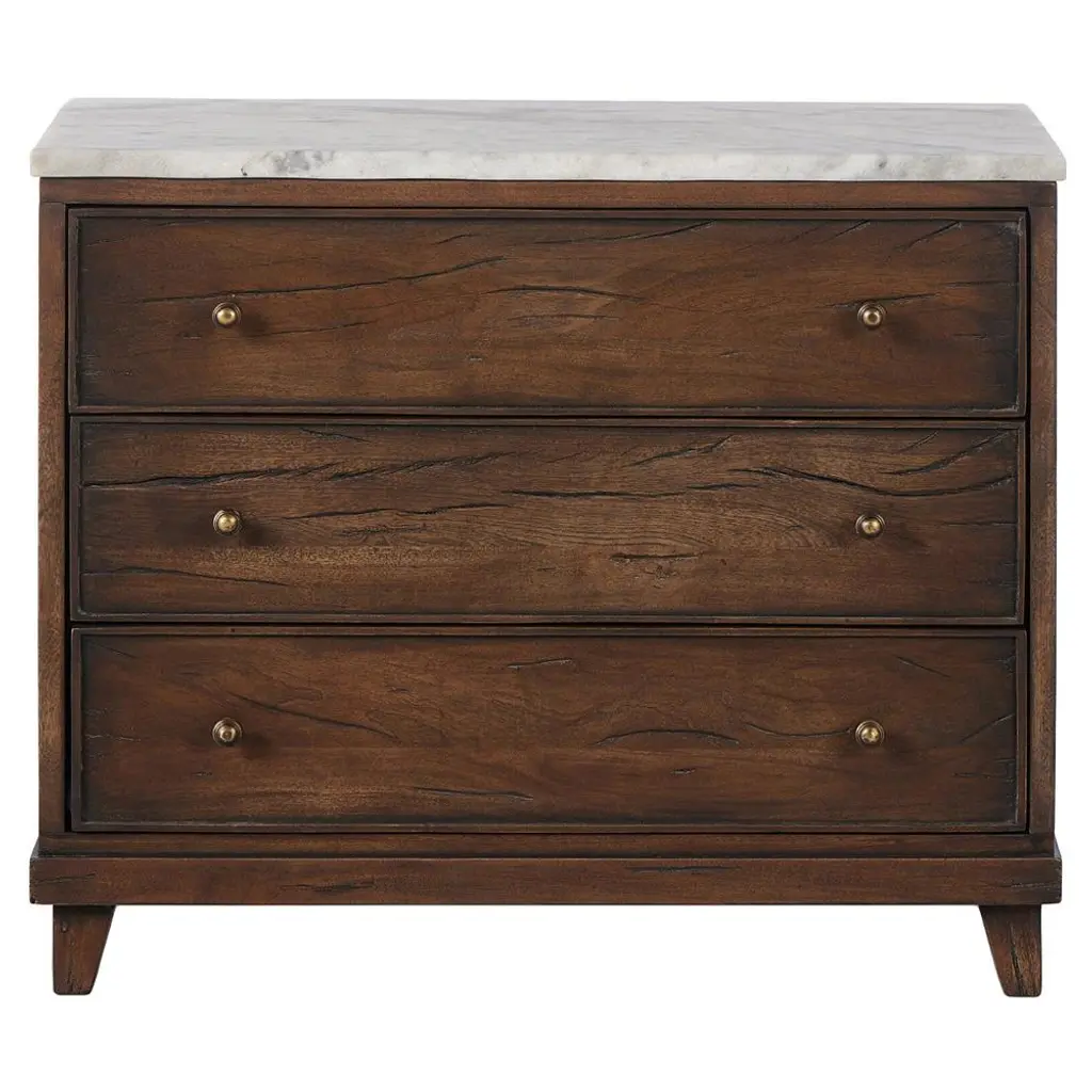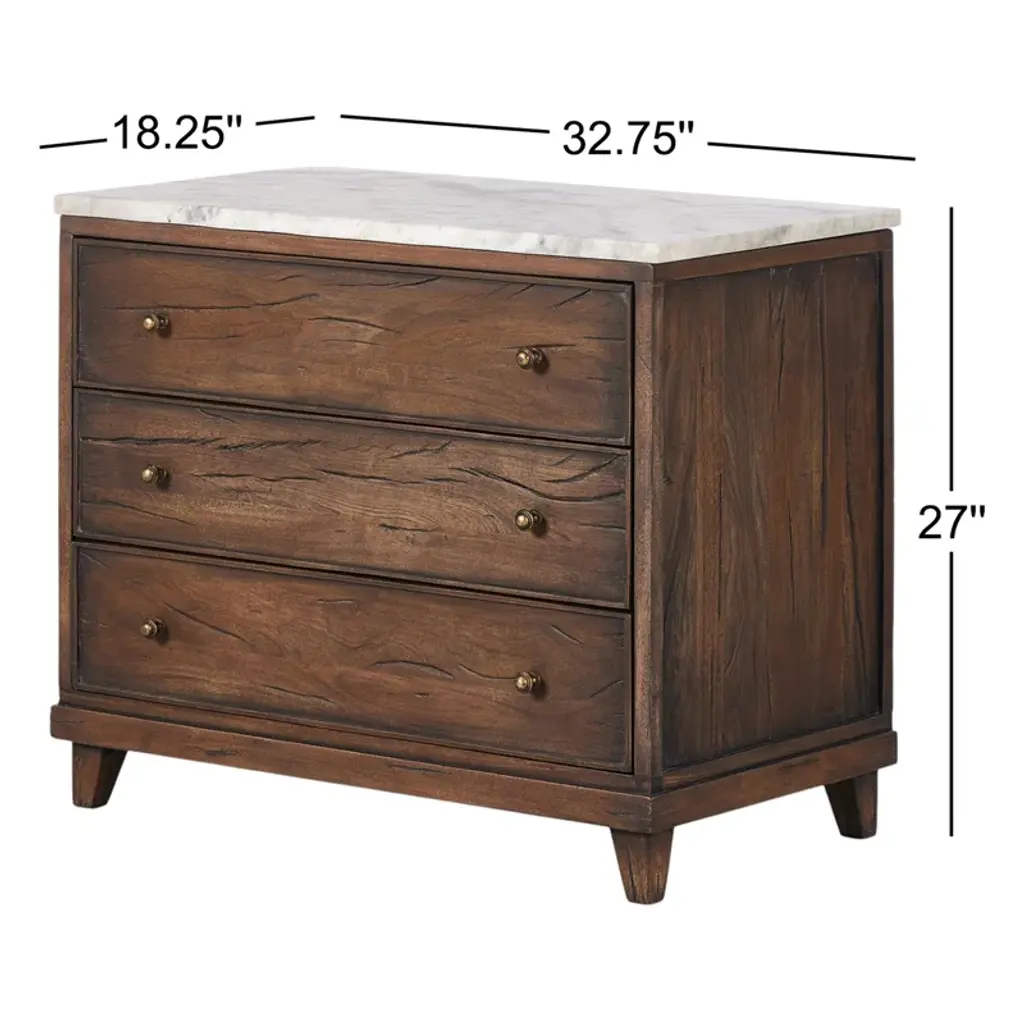Capturing the charm of vintage French storage, this solid mango wood nightstand stands tall with a polished marble top and softened ogee edges. Three spacious drawers are fitted with classic brass-button hardware. Natural marks and cracks are characteristic of the reclaimed wood.