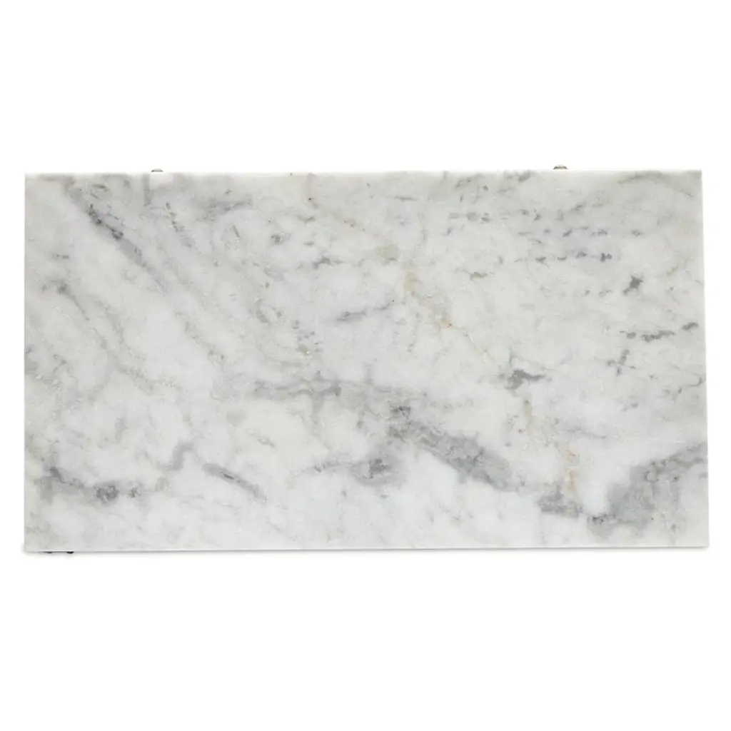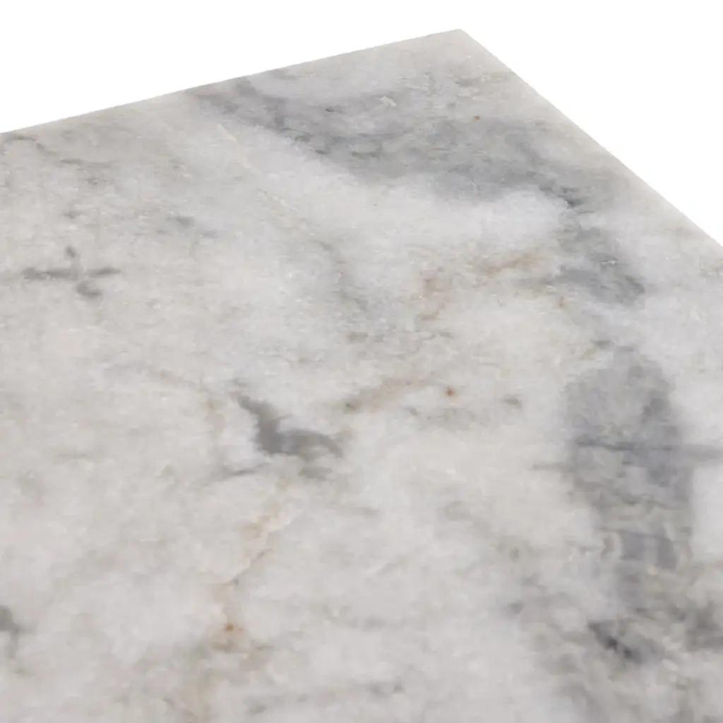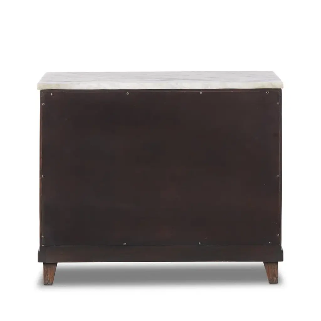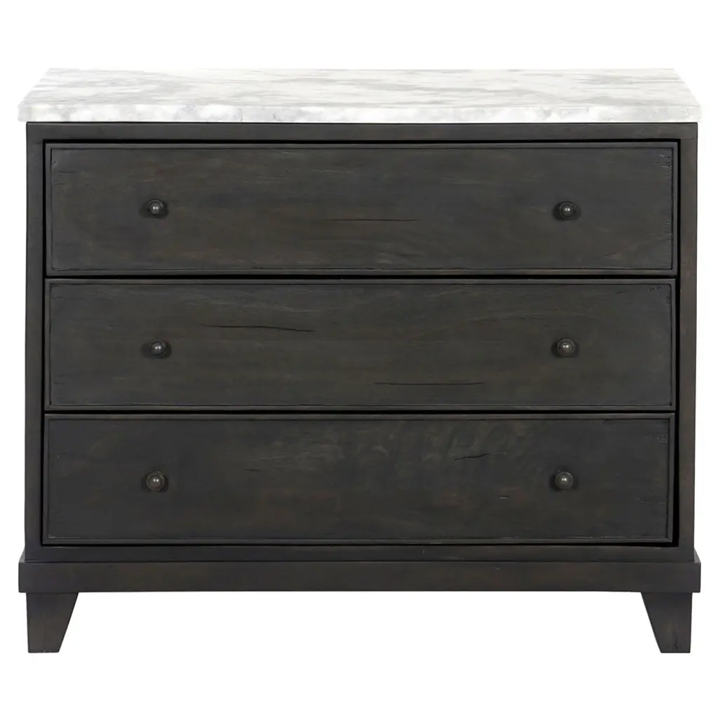 Capturing the charm of vintage French storage, this solid mango wood nightstand stands tall with a polished marble top and softened ogee edges. Three spacious drawers are fitted with classic brass-button hardware. Natural marks and cracks are characteristic of the reclaimed wood.