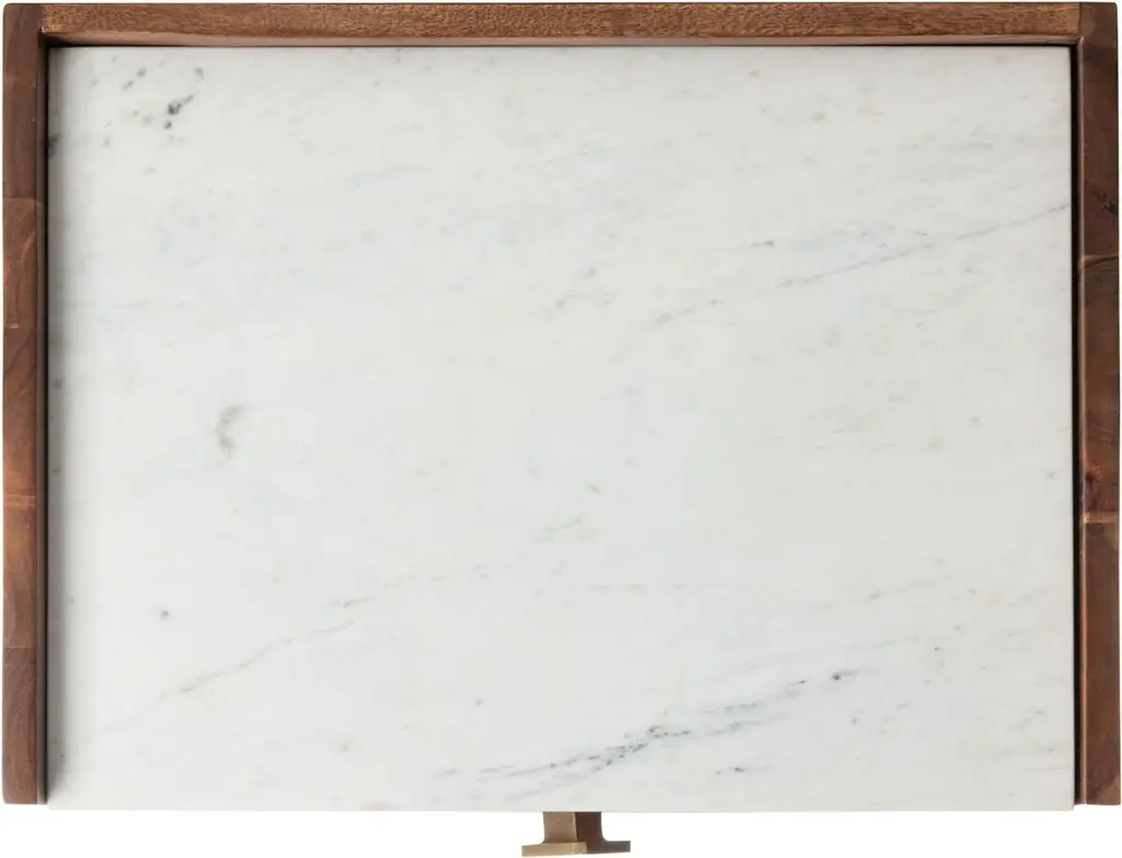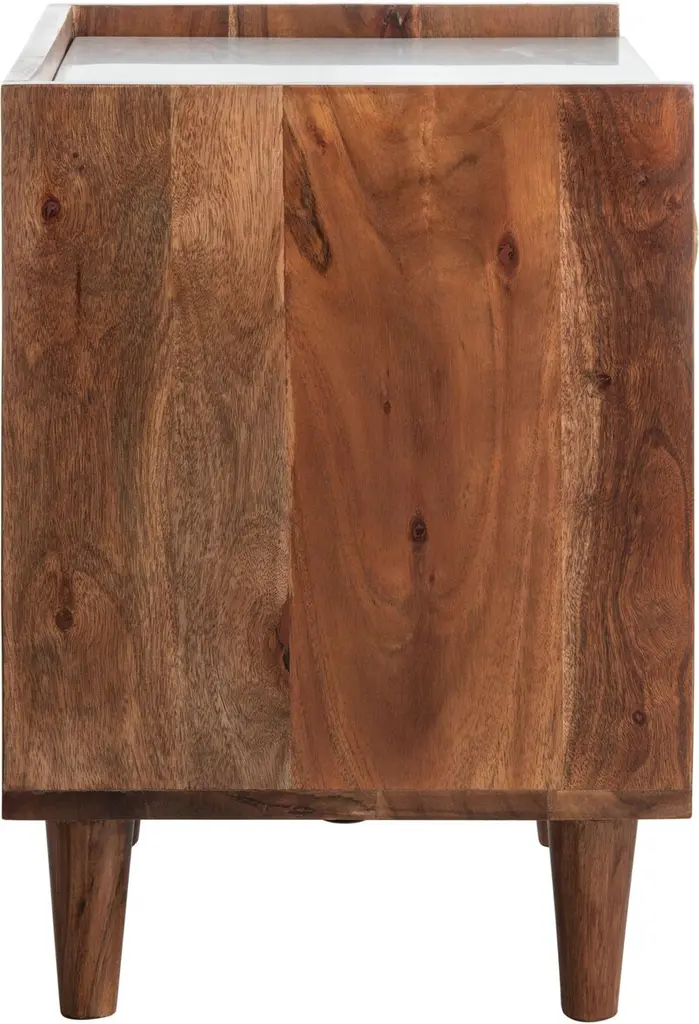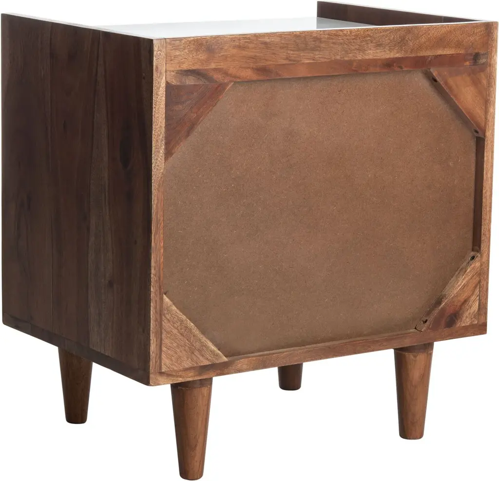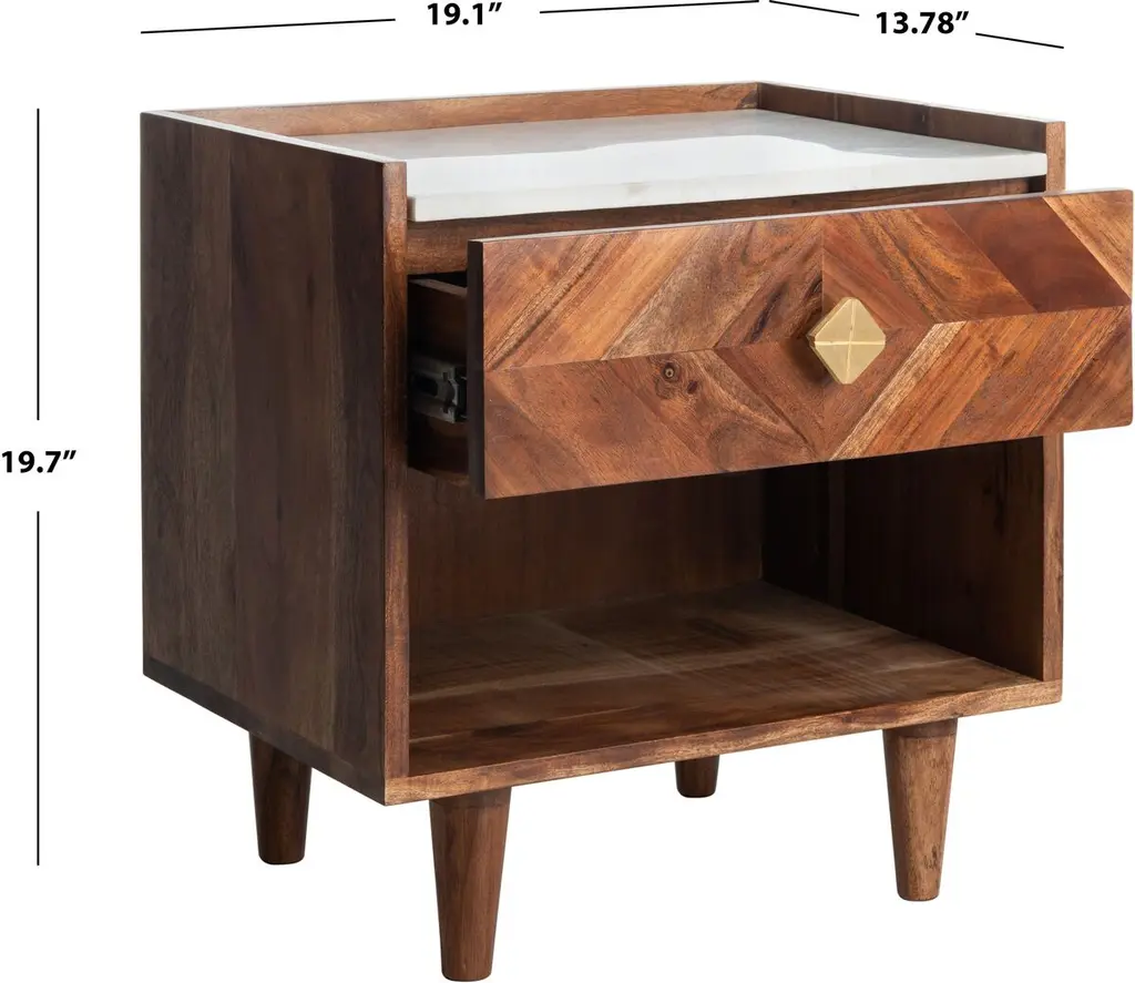 Planks of durable, lavishly figured acacia are placed in a diamond pattern on this nightstand's drawer front, giving it artisanal allure. The faux-marble top provides a sleek contrast to the wood's finish. A shelf beneath the drawer offers additional storage space.