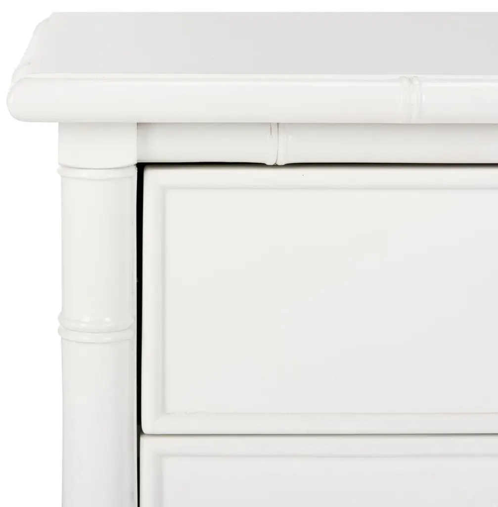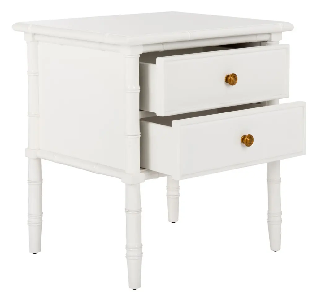 Bamboo-like carvings lend this two-drawer nightstand a hint of Chinese Chippendale charm. Beveled zinc hardware completes the design.