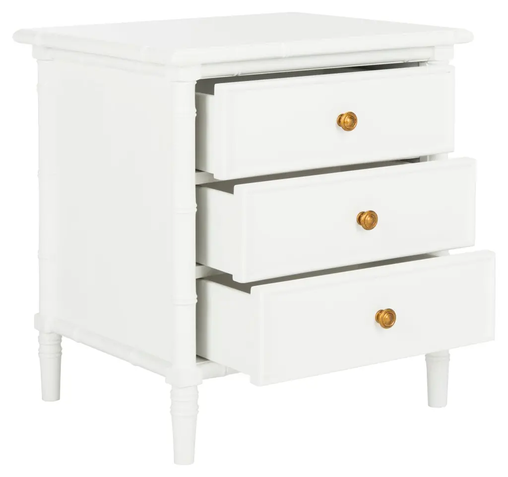This nightstand exudes a hint of Chinese Chippendale charm with its bamboo-like carvings. It features three drawers for convenient bedside storage, complemented by elegant hardware that completes the design.