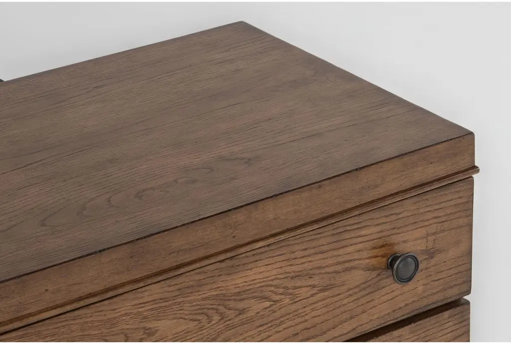 Nate + Jeremiah’s Estate 3-drawer nightstand offers a seamless blend of classic and contemporary elements inspired by Napa Country estate-style living. Clean lines paired with a rich patina and antique details create a warm yet refined design. Featuring solid hardwood and knotty white oak veneer with subtle distressing, this piece showcases exquisite craftsmanship. Drawers operate smoothly with dovetail joinery and side-mount ball-bearing guides. A felt-lined top drawer and cedar-lined bottom drawer elevate the quality, while USB charging adds ease and convenience. It is also available in black pine.