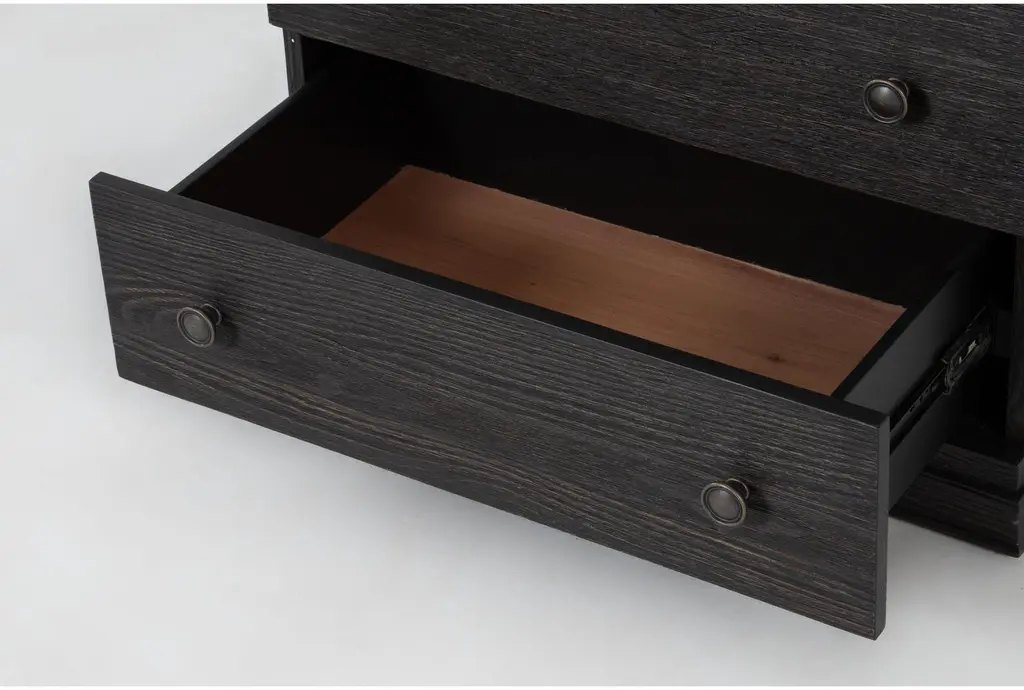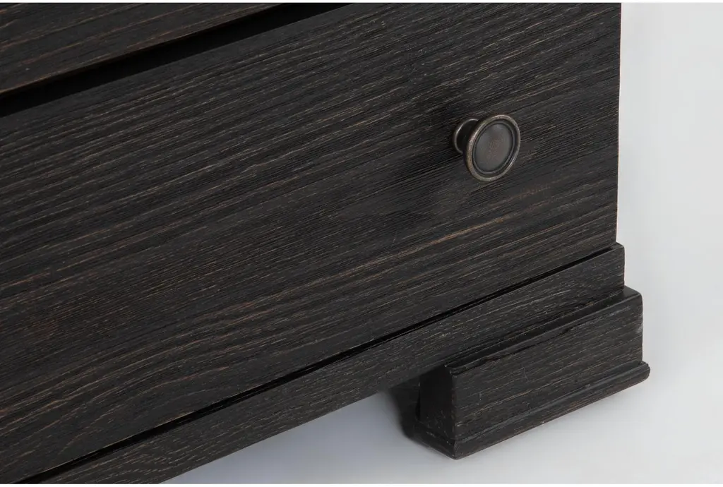 Nate + Jeremiah’s Estate Black 3-drawer nightstand offers a seamless blend of classic and contemporary elements inspired by Napa Country estate-style living. Clean lines paired with antique details create a warm yet refined design. Featuring solid pine in a wire-brushed black finish, this piece showcases exquisite craftsmanship. Drawers operate smoothly with dovetail joinery and side-mount ball-bearing guides, while a felt-lined top drawer and cedar-lined bottom drawer elevate the quality. USB charging adds ease and convenience. It is also available in patina oak.