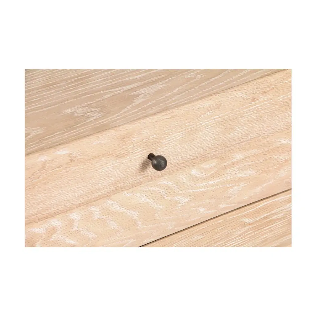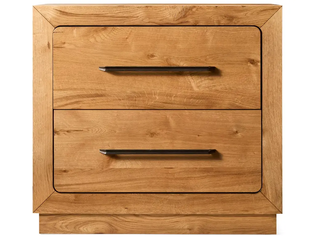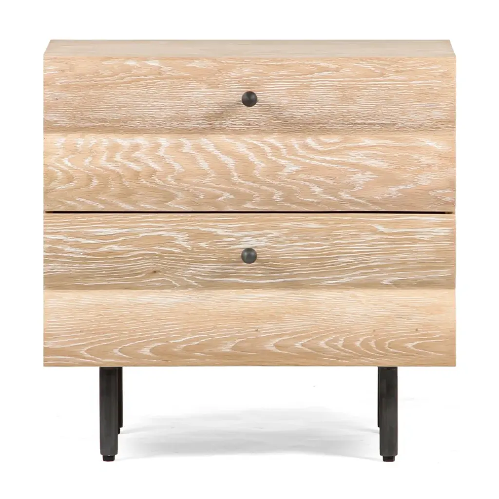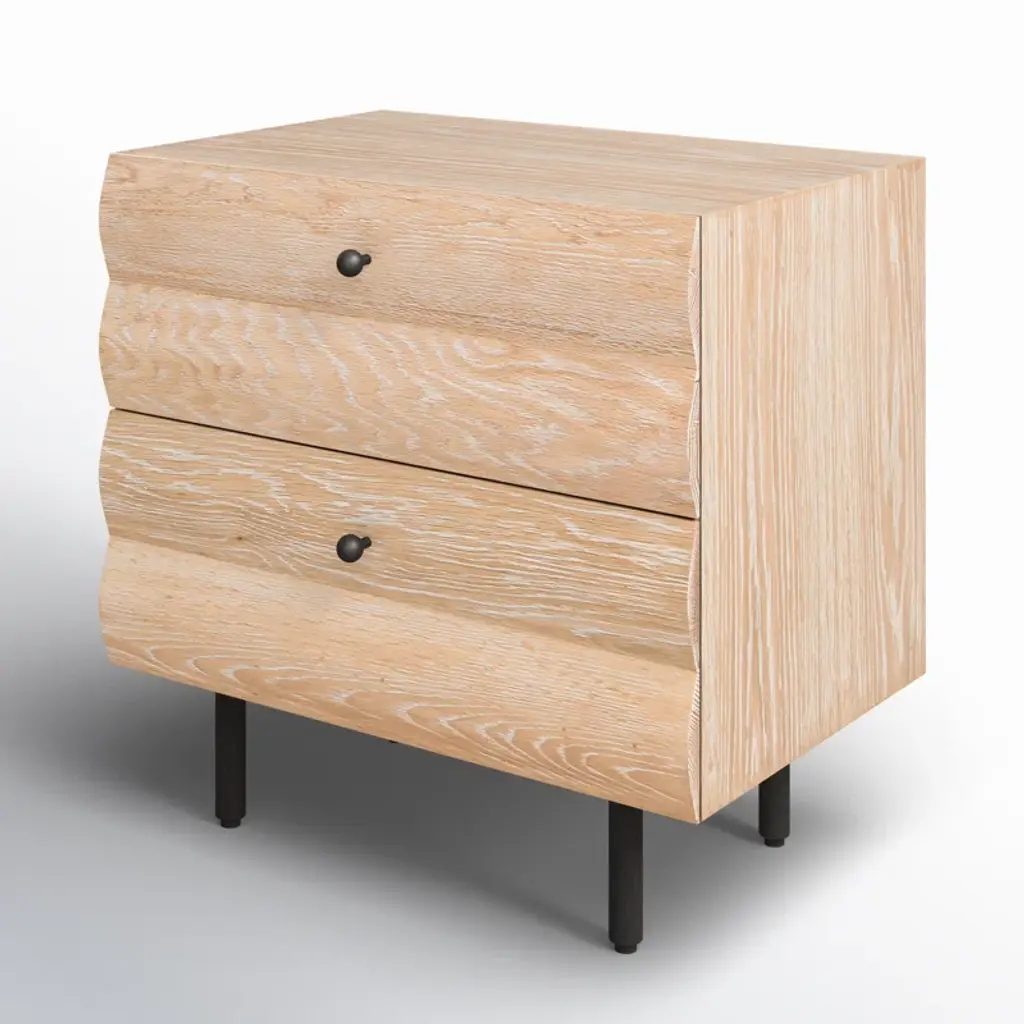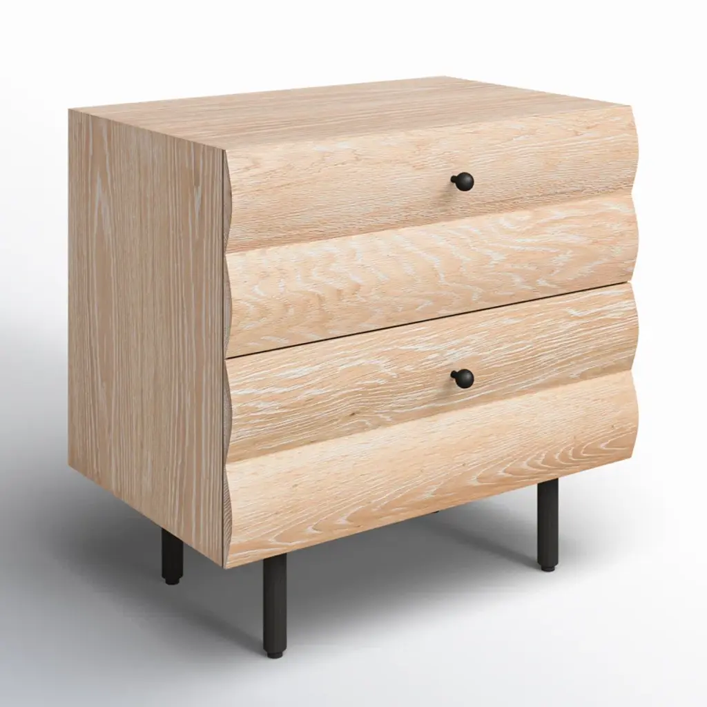 The Estelle Nightstand combines soft, geometric forms with warm, modern materiality. 2 undulating, solid FSC certified Oak drawer fronts conceal generous storage drawers with a cerused finish. Sturdy steel legs and drawer hardware complement the modern organic styling of this piece.