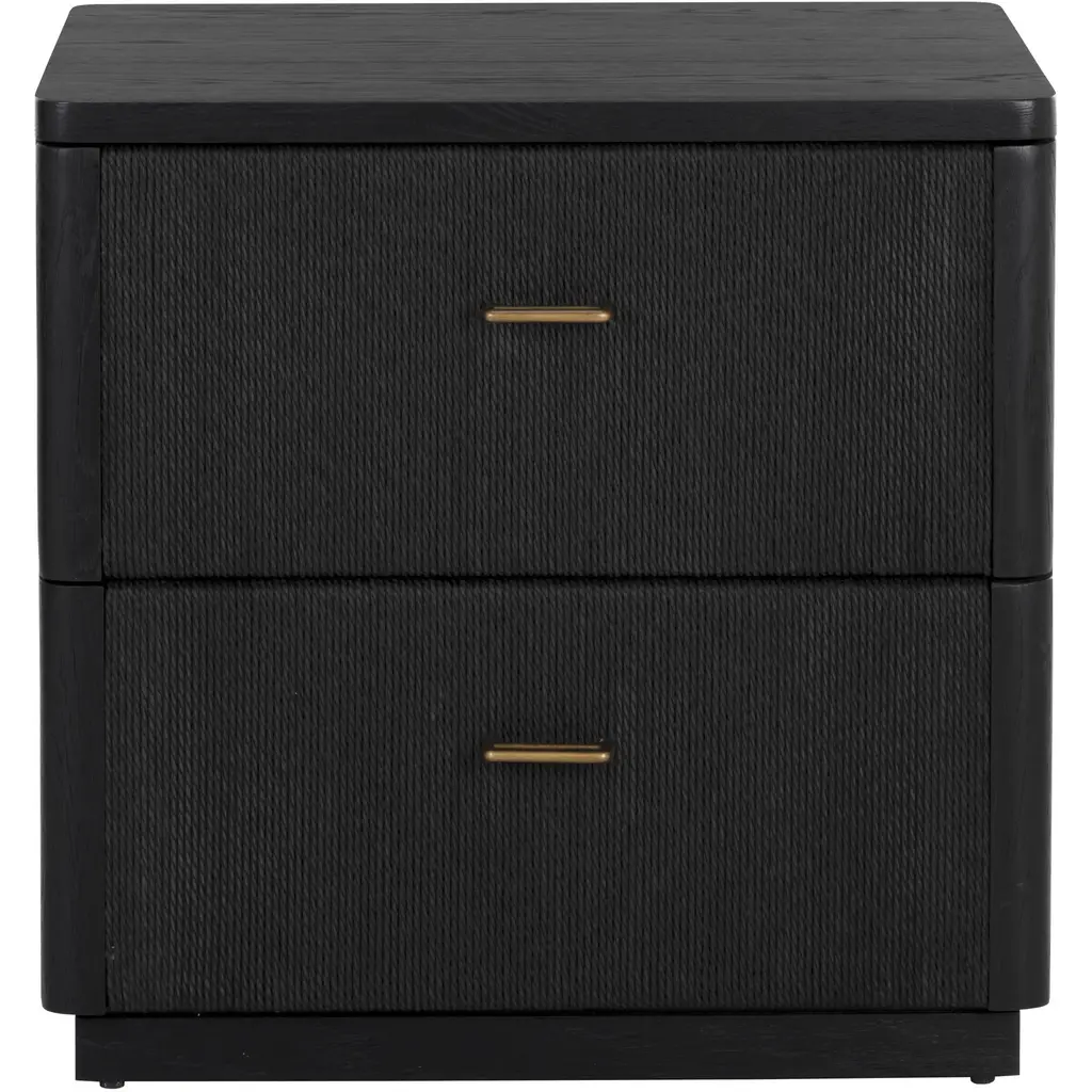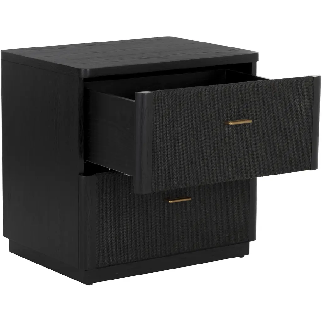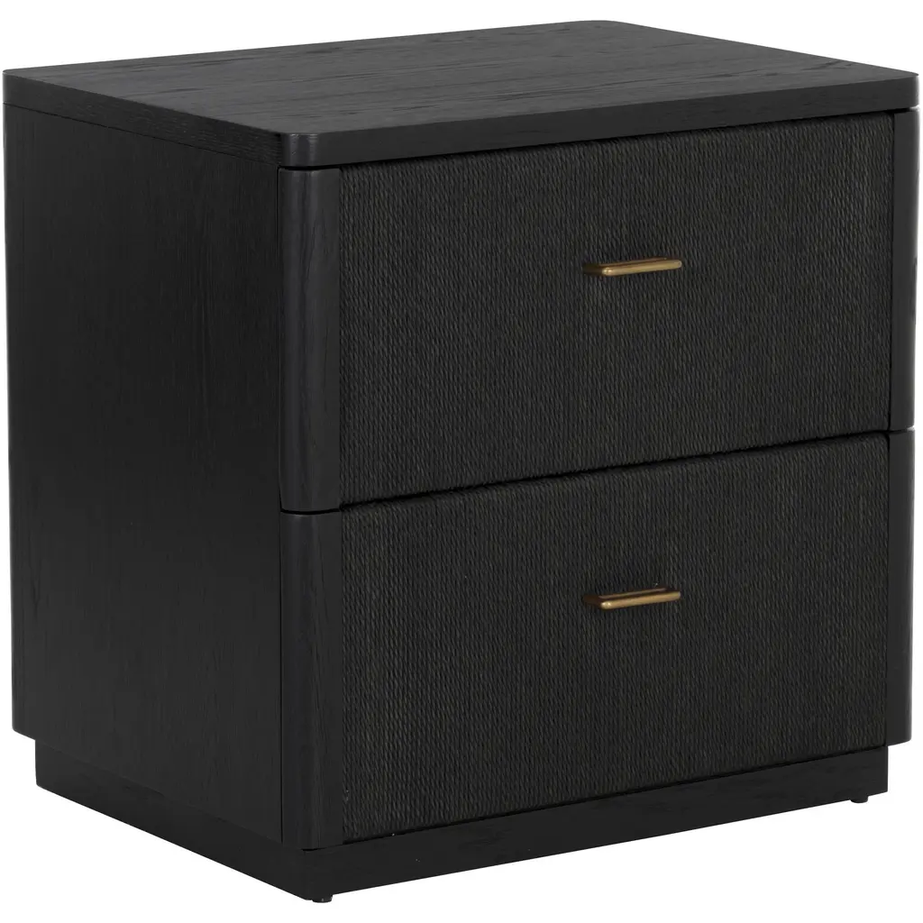 The Etienne Nightstand boasts a linear profile with a moody design. Constructed from a black oak veneer with solid black oak wood legs and a matching rope covering on the doors. Antique brass aluminium handles complement the piece. As wood is an organic, porous material, these pieces will contain natural variation of texture and may also exhibit fine indentations and cracks. Wood pieces will also display a disparity of colour and grain, and visible knots and burls that add to the character of each piece.