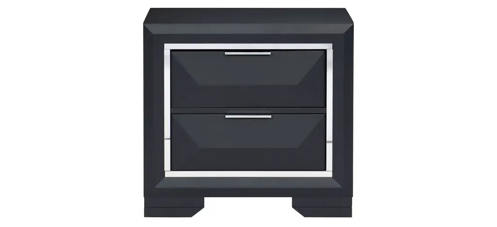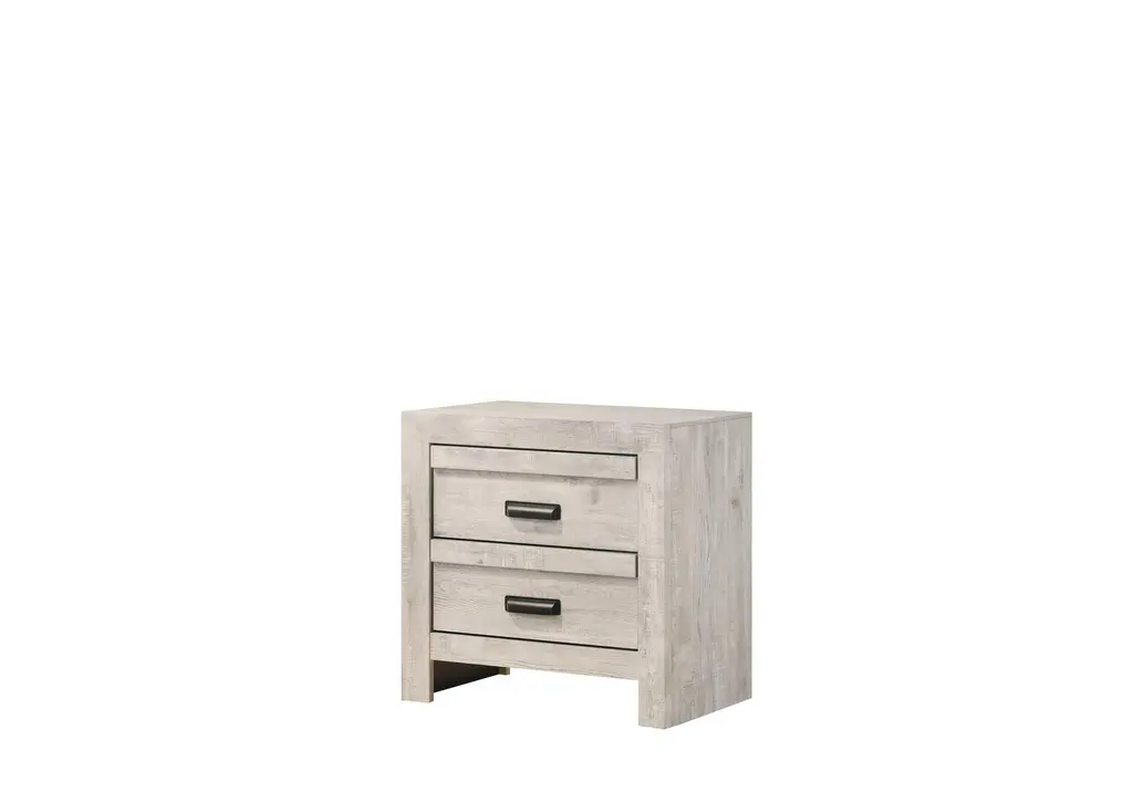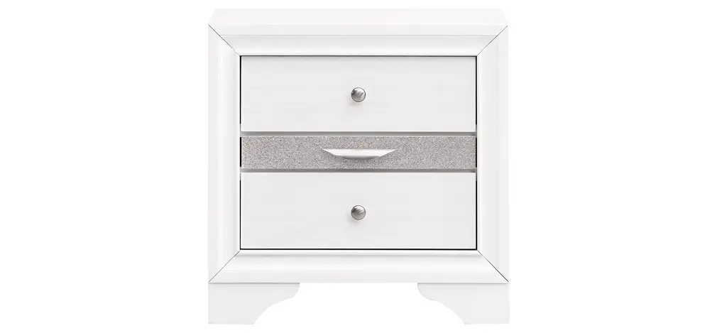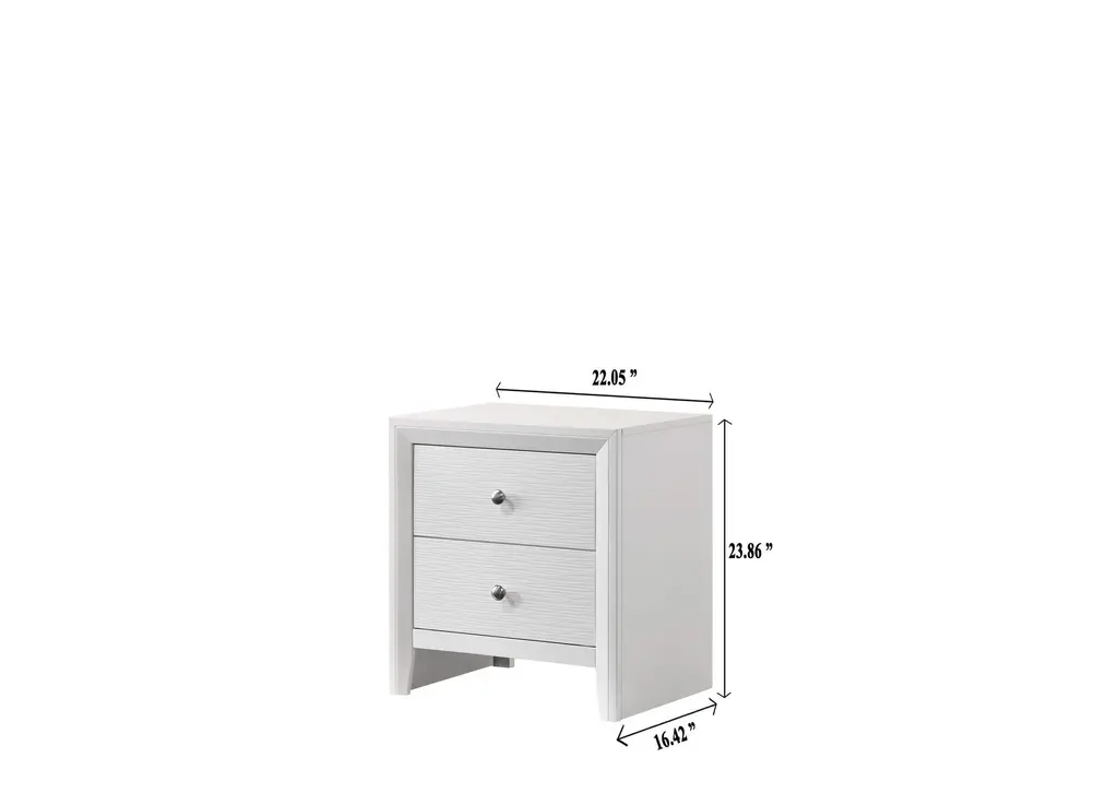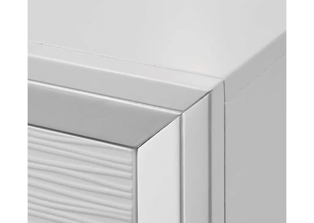 This inviting bedroom set features a refreshing white finish with subtle textural details that add a touch of modernity. The clean-lined bed boasts a distinctive headboard with horizontal slats that create an airy, open feel, promoting relaxation. Complementing the bed is a practical two-drawer nightstand and a taller, multi-drawer chest, both offering ample storage and maintaining the set's sleek look. The spacious dresser, equipped with a variety of drawers, meets all your storage needs and is topped with a large, square mirror that reflects light and adds to the sense of space. This collection is perfect for those looking to brighten up their bedroom with pieces that combine contemporary styling with everyday functionality. Weight 38.500 lbs. (17.33kgs.)