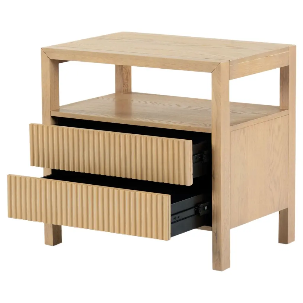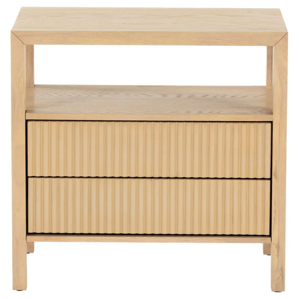 Transform your bedroom with the stunning Evarett 2 Drawer Reeded Nightstand. This elegant piece blends timeless charm with modern functionality. Crafted from quality wood, it features reeded drawer fronts made from durable polyester resin, creating a captivating texture that complements any decor. With two spacious drawers, it offers ample storage for your bedside essentials, helping you keep your space organized and clutter-free. Whether placed by your bed or used as an accent piece, the Evarett Nightstand is designed to seamlessly blend with your home interior. Elevate your bedroom aesthetics with this stylish and functional furniture piece and enjoy the perfect fusion of design and utility.