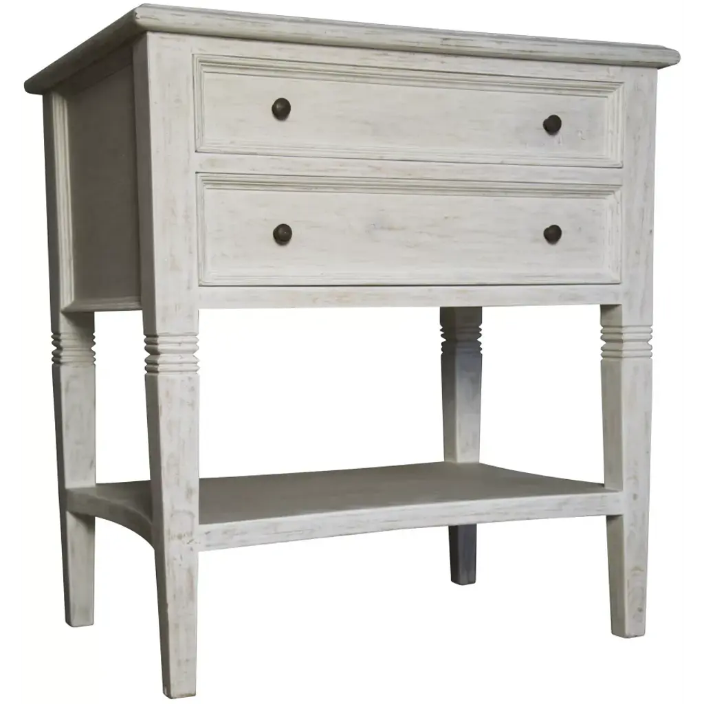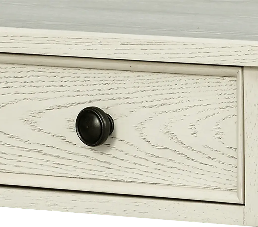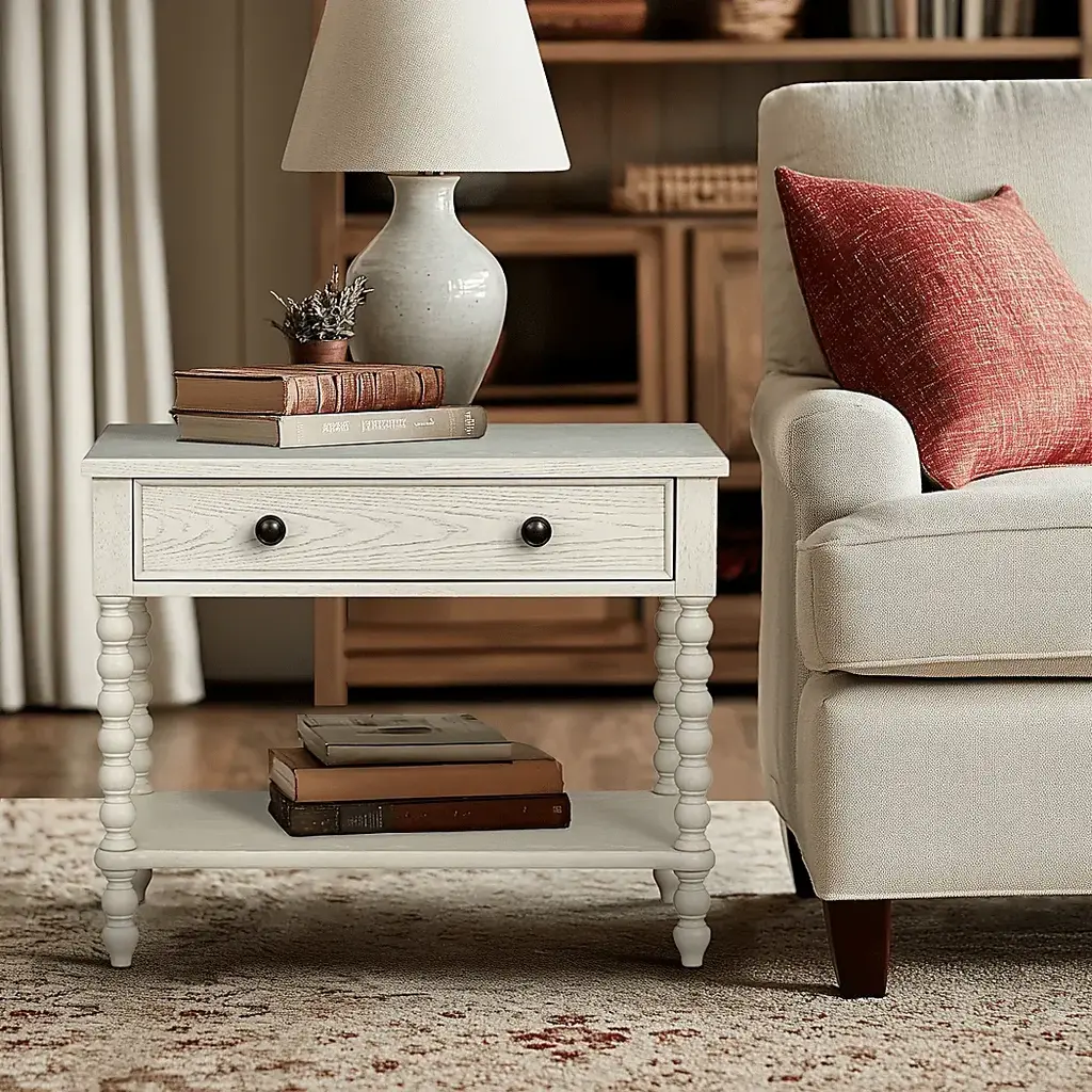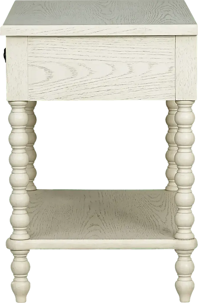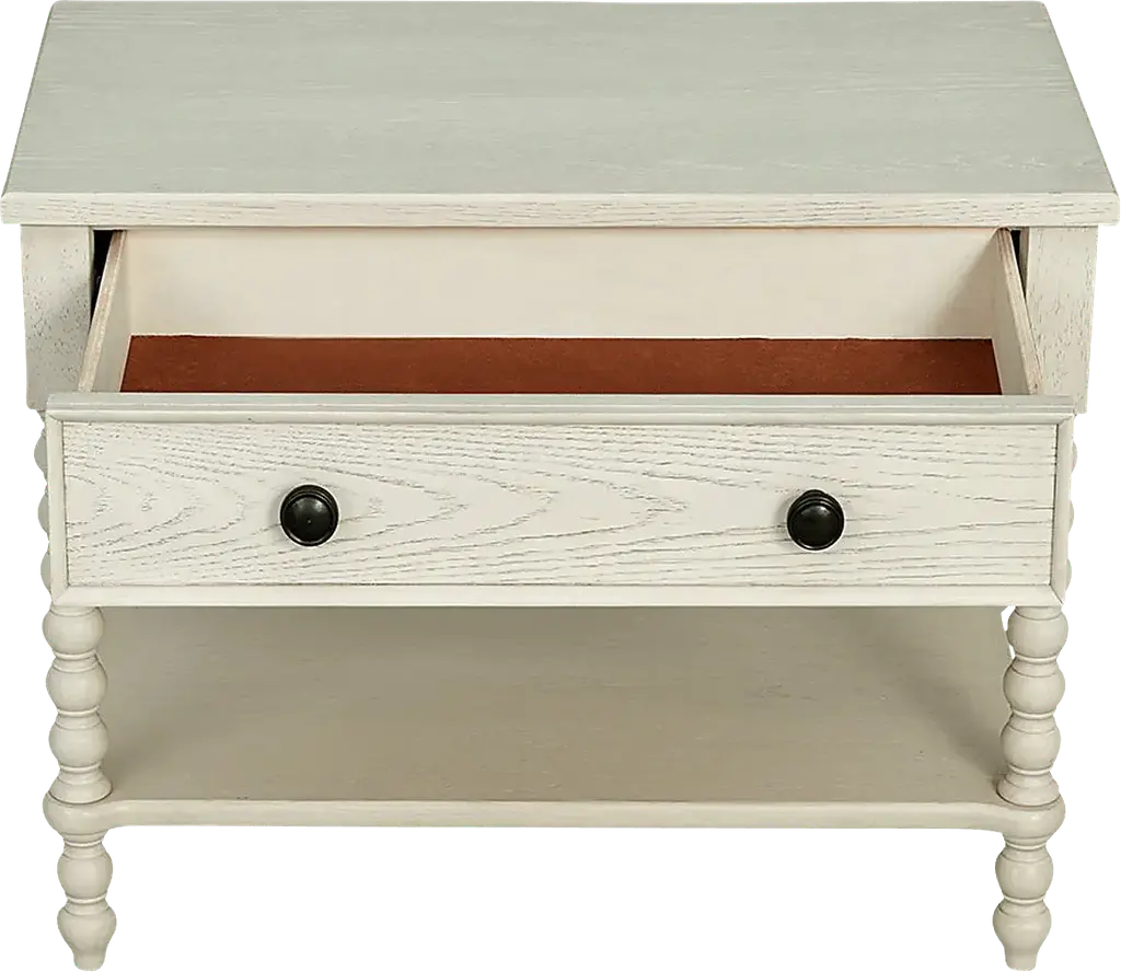 The Fairiprises cream nightstand offers more surface space and storage while maintaining its classic charm. Crafted from solid and engineered wood, it features a spacious drawer with two knobs for smoother operation and an open shelf to keep essentials within reach. Perfectly scaled for king and California king beds, it also works beautifully as a side table next to a sofa or in an entryway. With its timeless spindle-leg design, this versatile piece brings elegance and function to any space. Customer assembly is required.