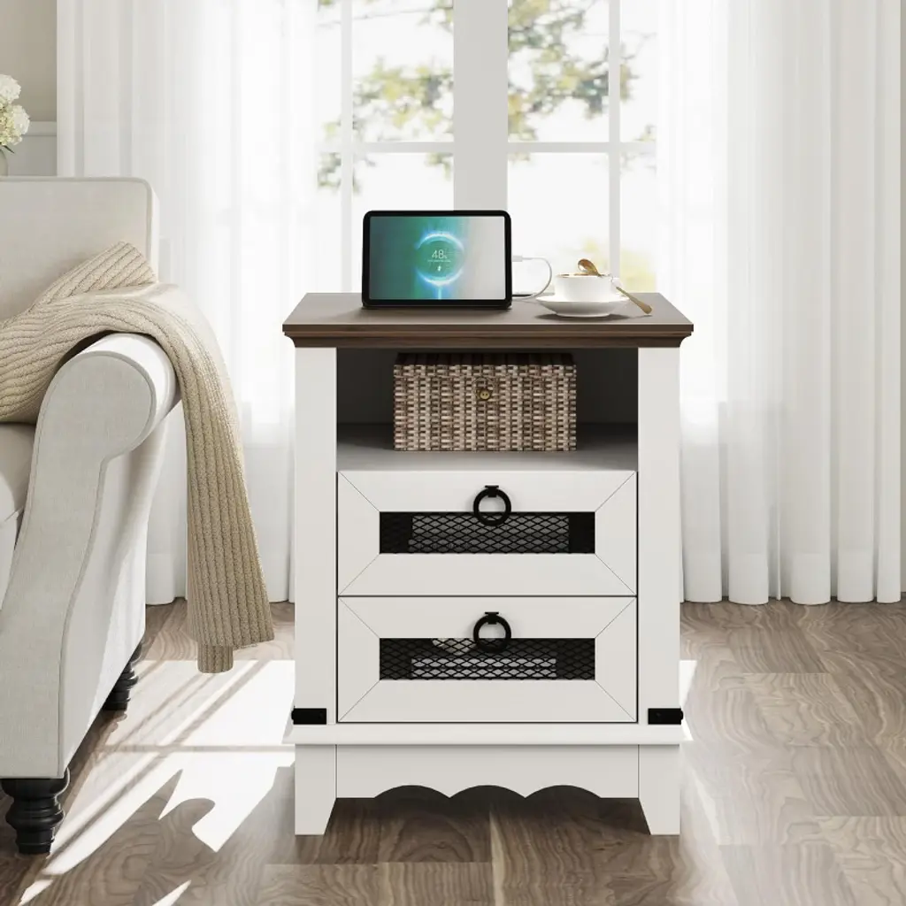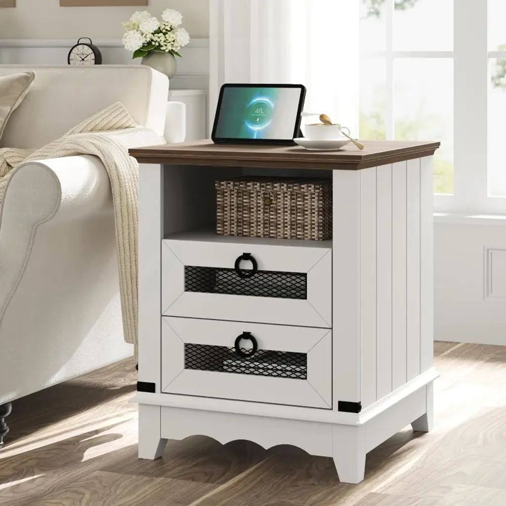 Farmhouse Industrial End Table W/ Charging Station - 24" Nightstand W/ 2 Drawers & Open Cubby, Multi-function For Bedroom, Living Room