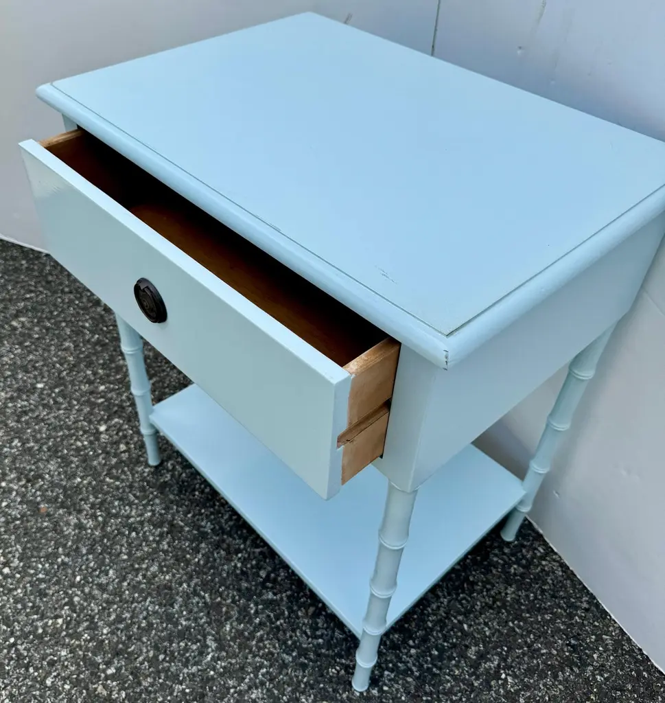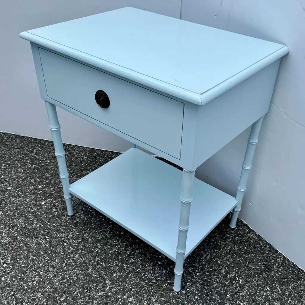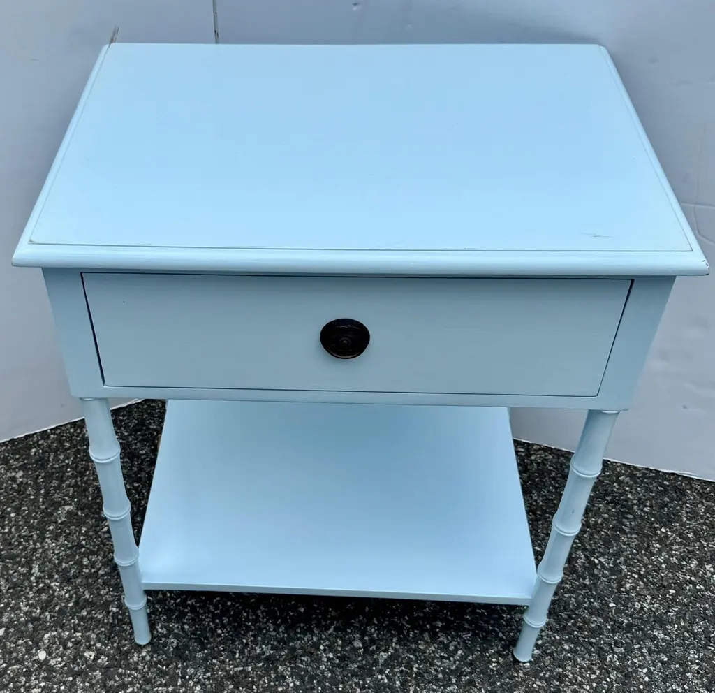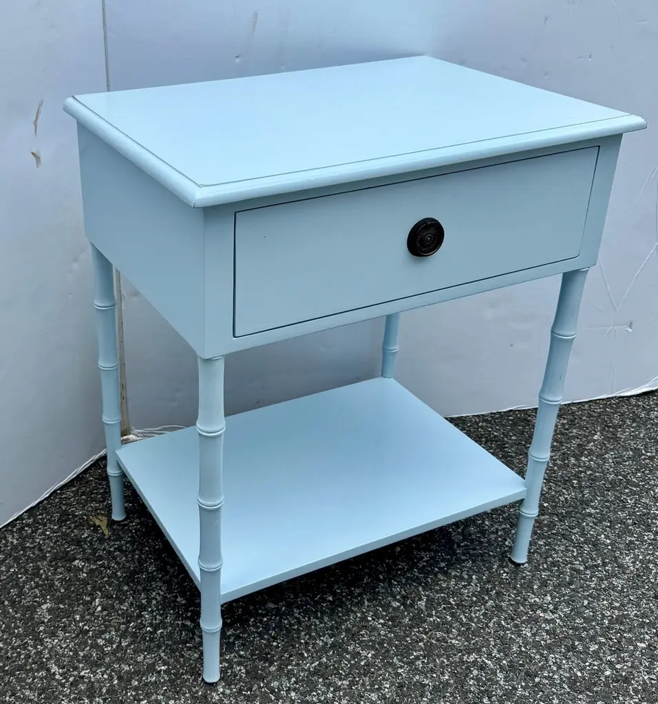 This bamboo style side table features one drawer and one bottom shelf. This very sturdy solid wood bedside table has been hand painted using lacquer paint. There are classic details throughout including bronzed ring hardware. This piece certainly brings vintage old-world charm with a up to date paint finish to any formal or informal living or bedroom setting.