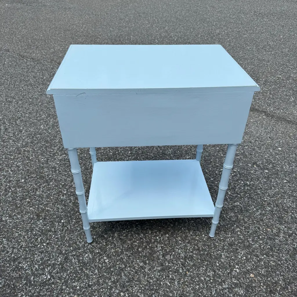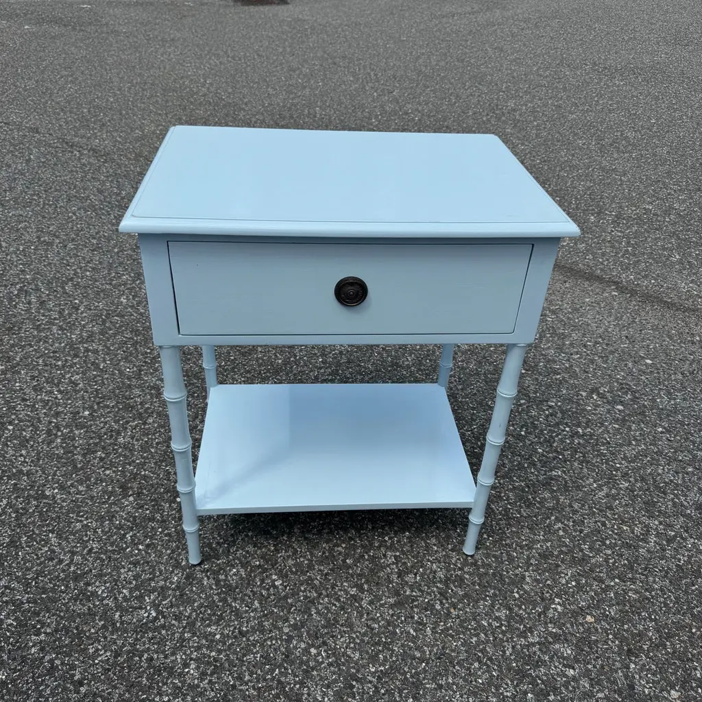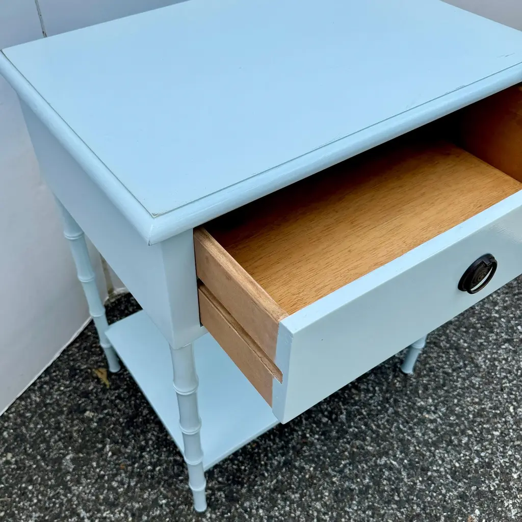 This bamboo style side table features one drawer and one bottom shelf. This very sturdy solid wood bedside table has been hand painted using lacquer paint. There are classic details throughout including bronzed ring hardware. This piece certainly brings vintage old-world charm with a up to date paint finish to any formal or informal living or bedroom setting.