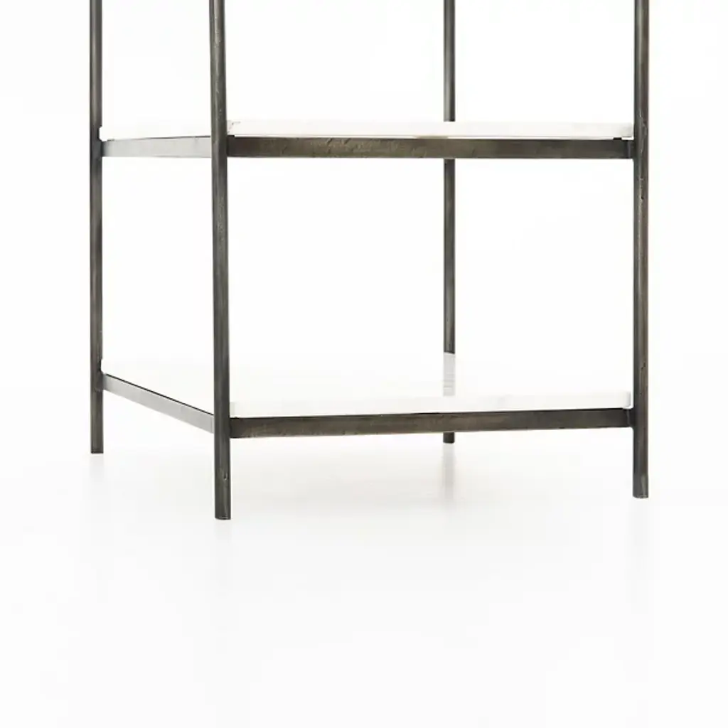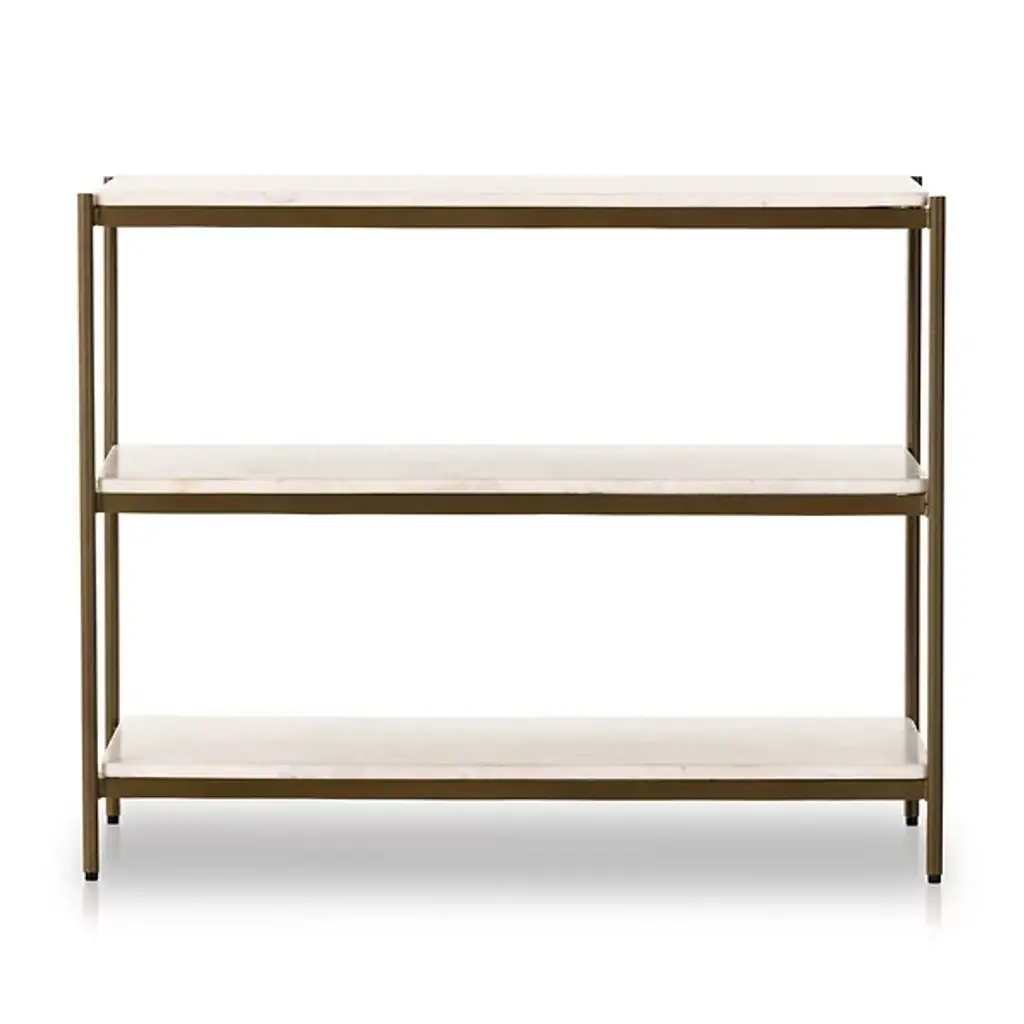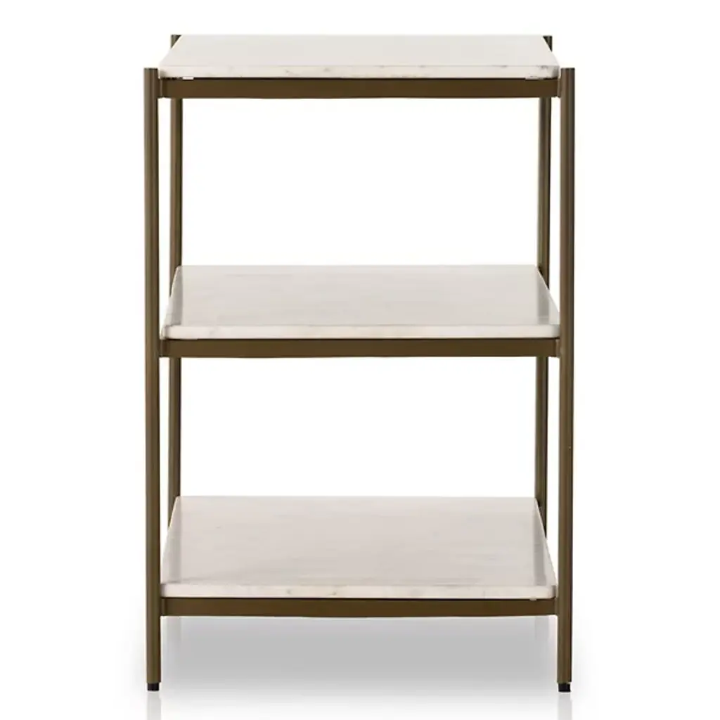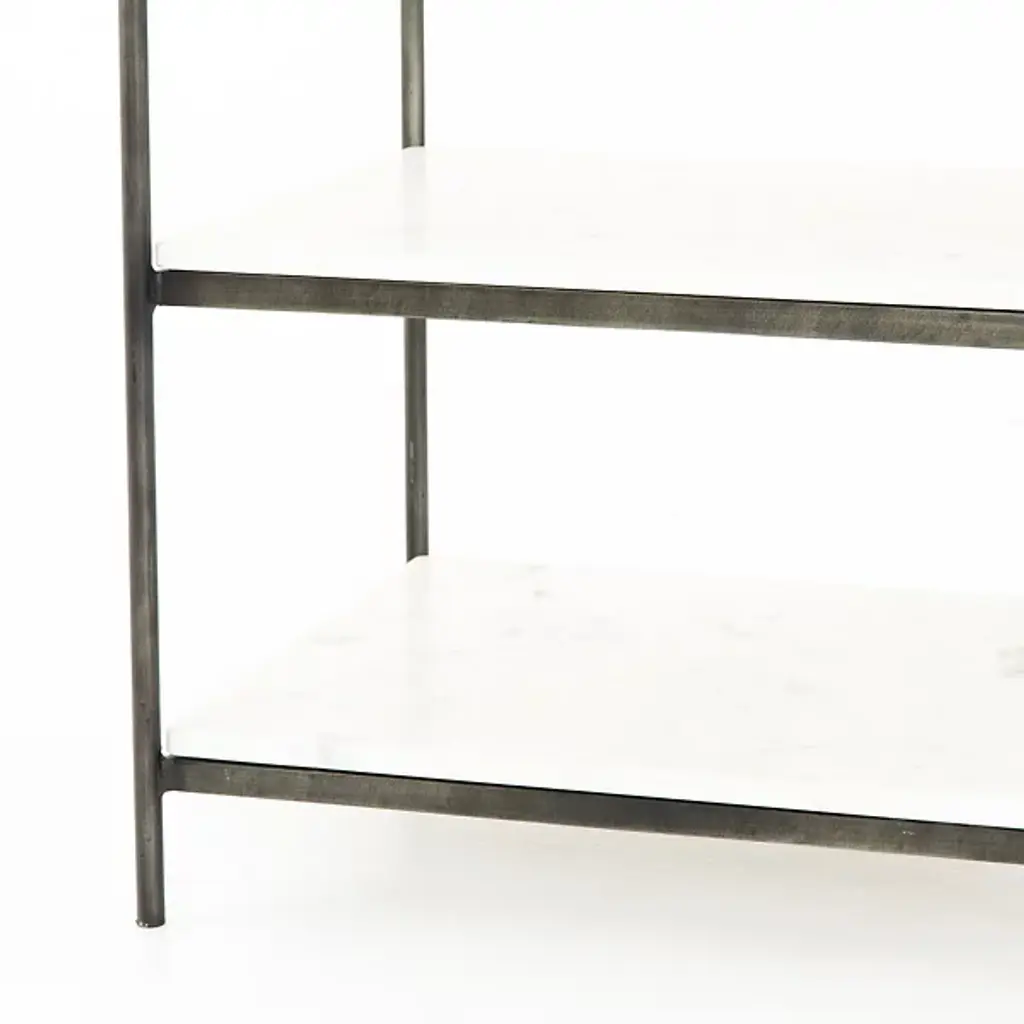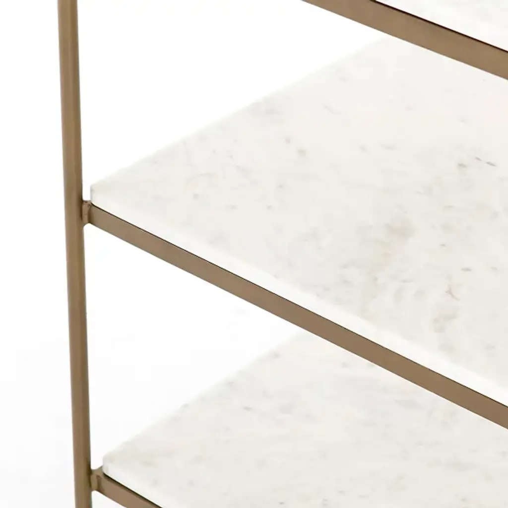 Bring functional luxury to any space with the refined design of the Felix Nightstand from Four Hands. This elegant piece features three tiers of classic marble shelving, offering ample storage while highlighting the unique natural patterns of the stone. The angular iron frame adds a sophisticated contrast, lending a feminine touch to the otherwise minimalist aesthetic, and offering plenty of storage space. A great choice for those who seek a balance of functionality and understated elegance in their decor.