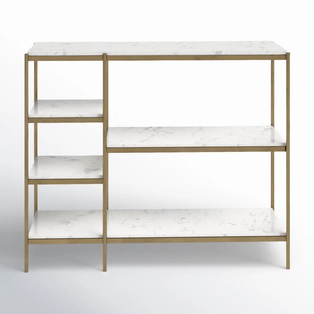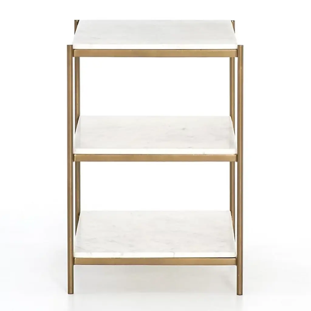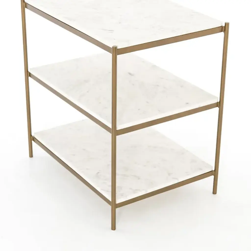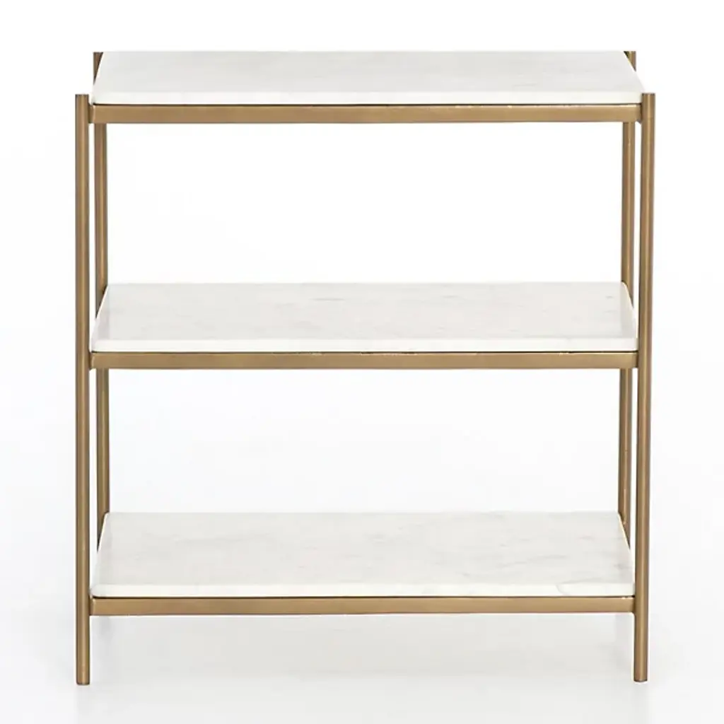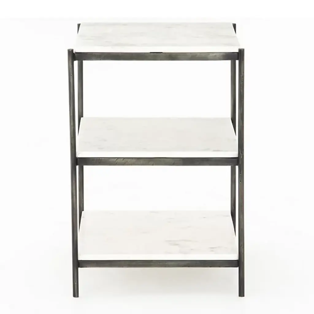 Bring functional luxury to any space with the refined design of the Felix Nightstand from Four Hands. This elegant piece features three tiers of classic marble shelving, offering ample storage while highlighting the unique natural patterns of the stone. The angular iron frame adds a sophisticated contrast, lending a feminine touch to the otherwise minimalist aesthetic, and offering plenty of storage space. A great choice for those who seek a balance of functionality and understated elegance in their decor.