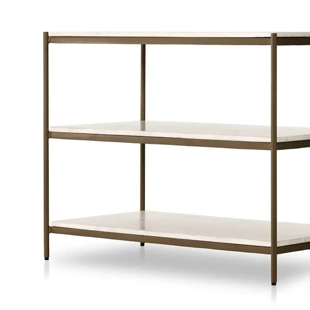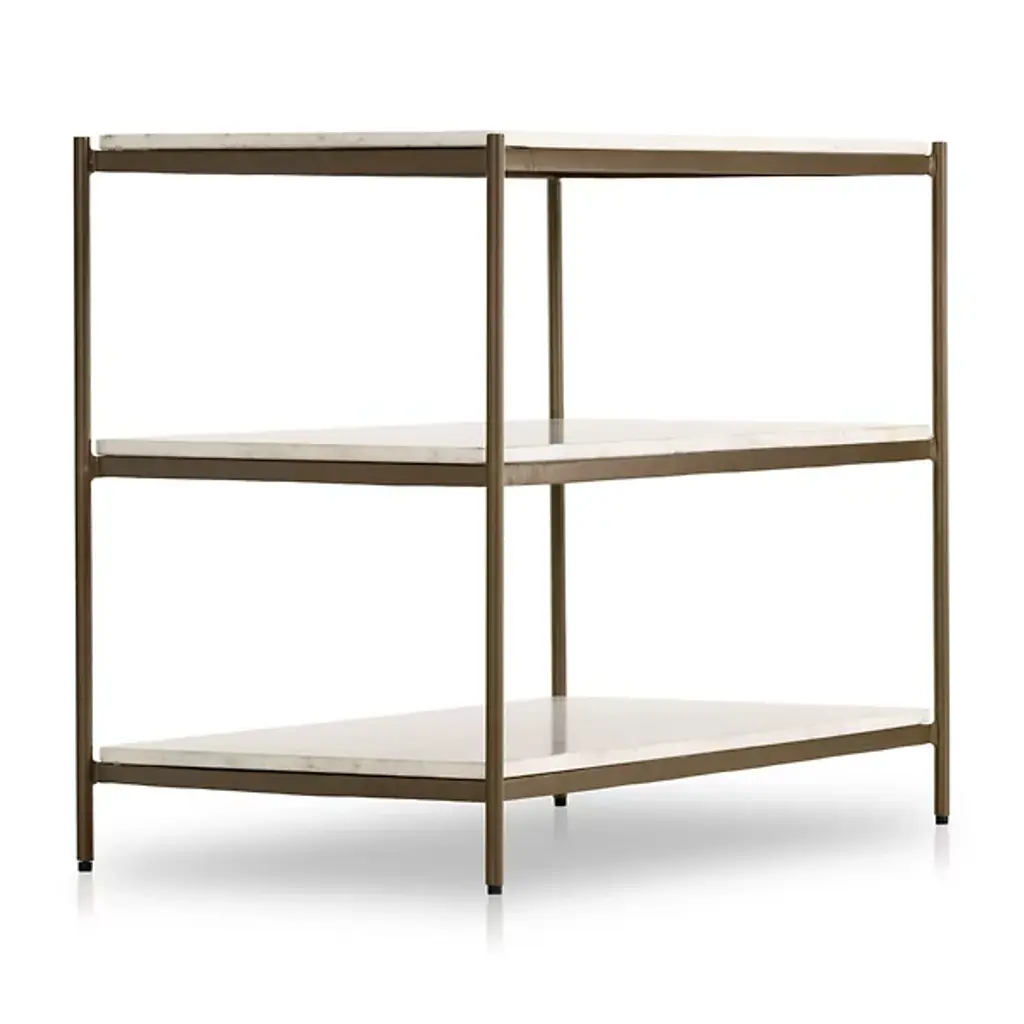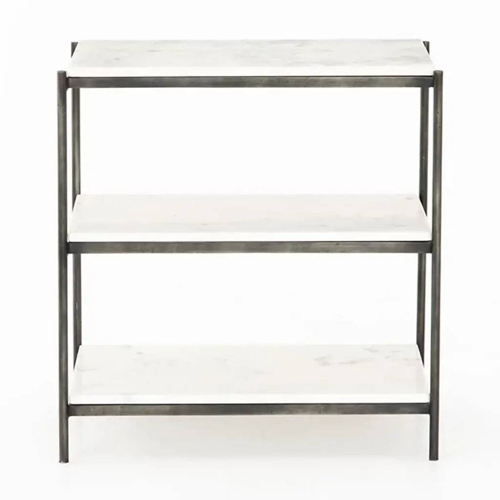 Bring functional luxury to any space with the refined design of the Felix Nightstand from Four Hands. This elegant piece features three tiers of classic marble shelving, offering ample storage while highlighting the unique natural patterns of the stone. The angular iron frame adds a sophisticated contrast, lending a feminine touch to the otherwise minimalist aesthetic, and offering plenty of storage space. A great choice for those who seek a balance of functionality and understated elegance in their decor.