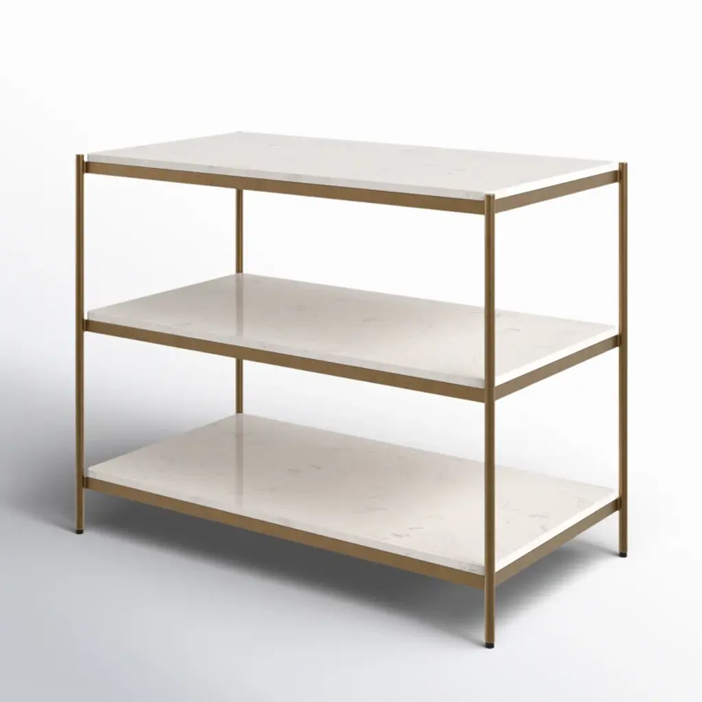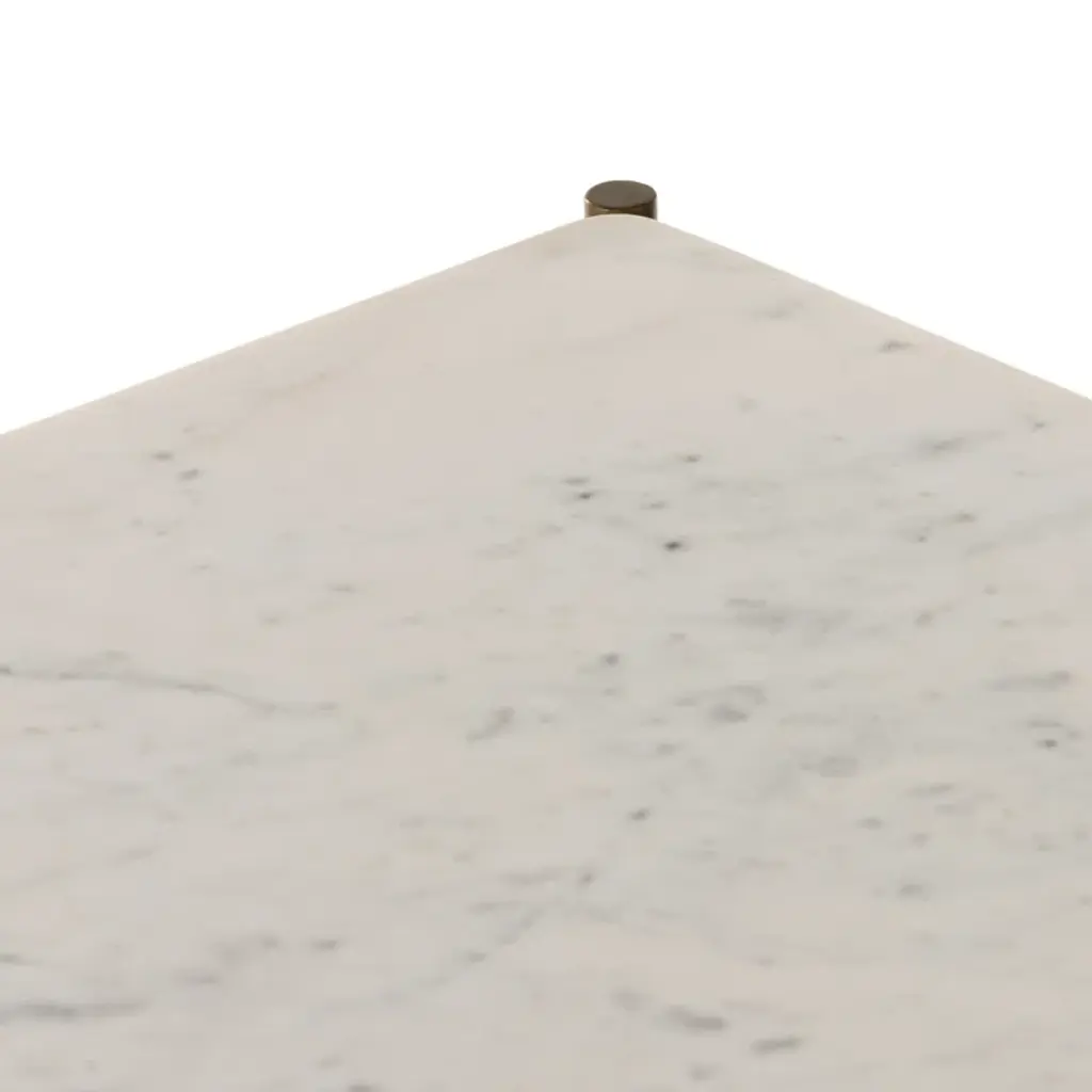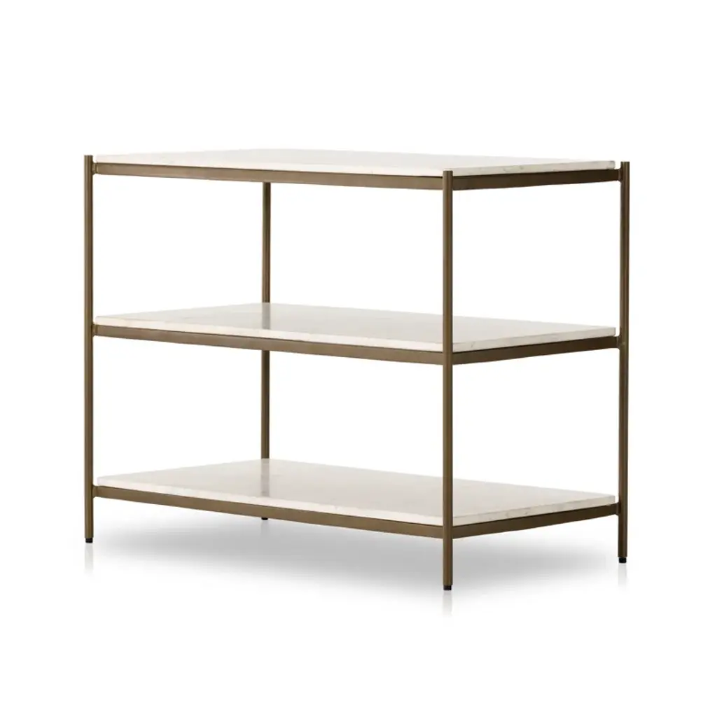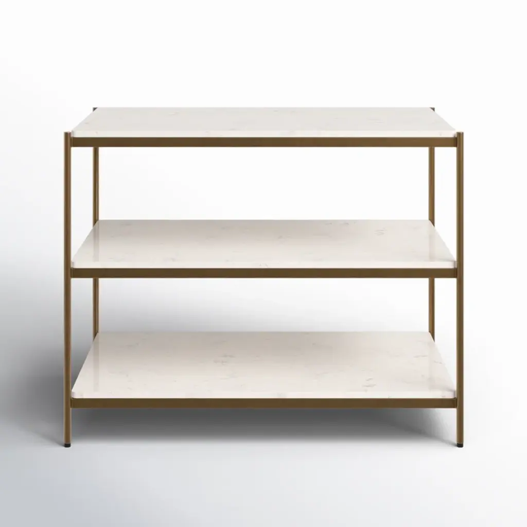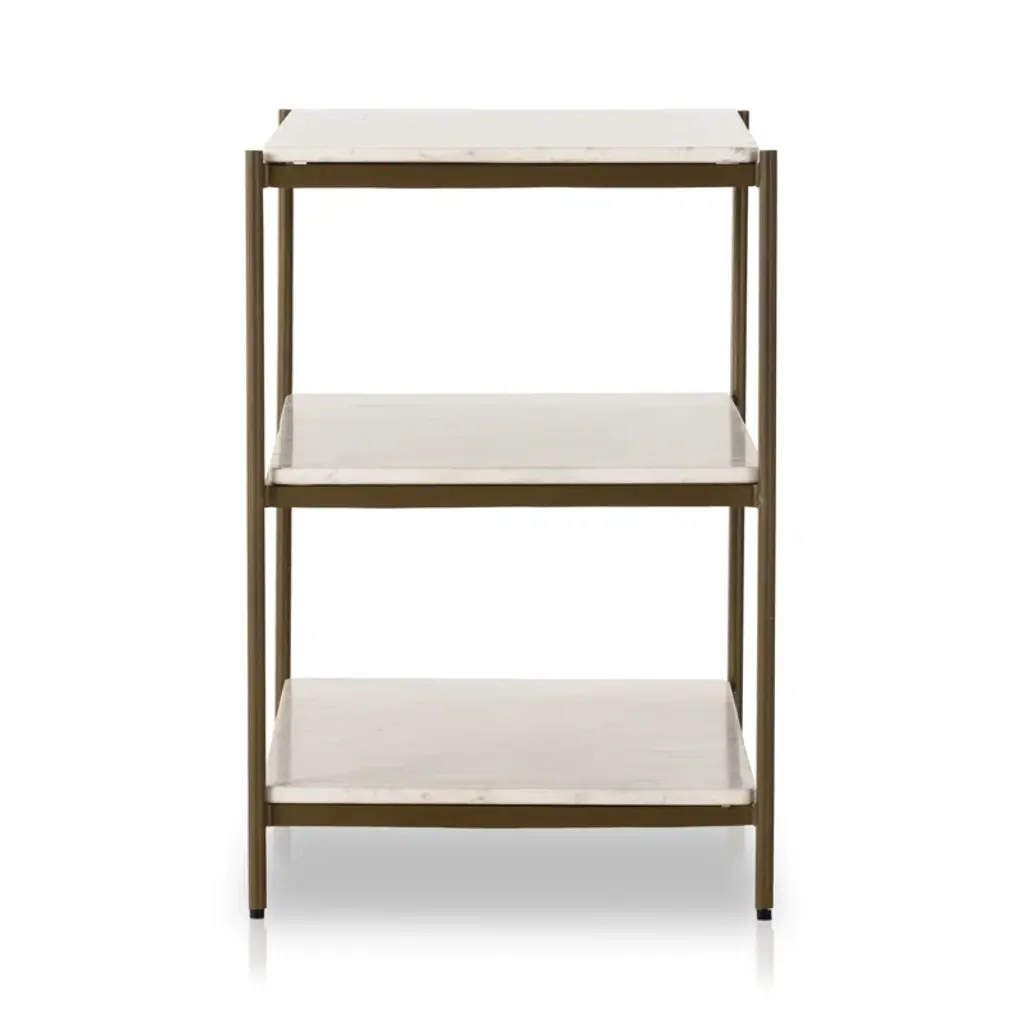 Add a pop of sophistication to any space. Classic white marble lays three spacious tiers of smooth shelving for generous surface area, while antique brass-finished iron framing places a feminine spin on bedside storage.