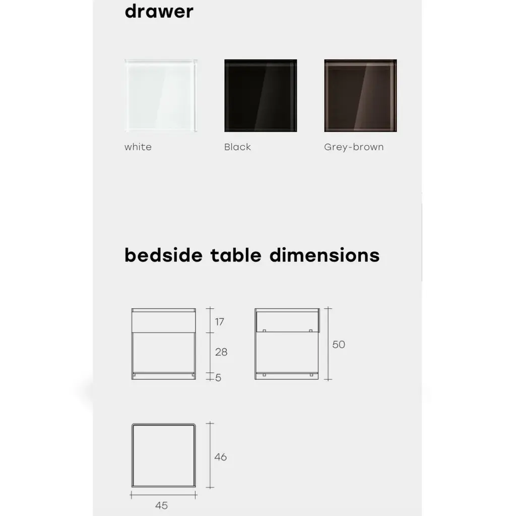 Dino was born from the desire to redefine the furnishing accessory par excellence of the bedroom, with the use of the core material of Fiam, the curved glass.A bedside table both simple and elegant, protagonist of the bedroom, that plays with light and color thanks to the succession of transparencies and lacquers.An handy drawer is hidden by a linear and clean glass front panel, which reveals the material of which it is made of, thanks also to a portion of the top part that remains naturally transparent: an invitation to use it and, at the same time, a safe embankment for the objects placed on it. load capacity on top: 20 kgload capacity on shelf: 20 kgBedside table in 8 mm-thick curved glass with lacqueredwood drawer white, black or brown-grey. Front panel in 8 mmglass painted in matching colours.Optional lower glass shelf, 8mm. thick.