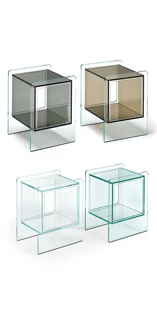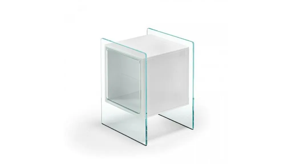 Bedside table with cubic inner compartment in 10-mm thick glass. Available in various finishes. Extralight glass structure, opal white glass inner compartment.