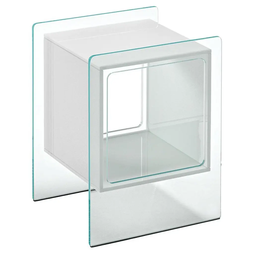 Bedside table with cubic inner compartment in 10-mm thick glass. Available in various finishes. Extralight glass structure, smoked glass inner compartment.