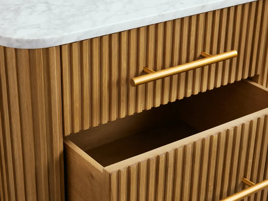 Our Finnley Bedroom Collection showcases a stunning mixed-material design, inviting elevated style into your bedroom oasis. Hand-finished pine from Finland or white oak wood is luxuriously accented by reeded oak detailing complemented by stone tops. The result is an eclectic-yet-chic bedroom suite that easily fits into the aesthetic of your home.
