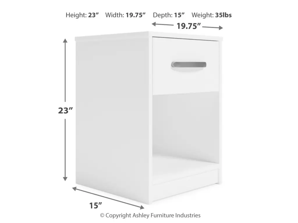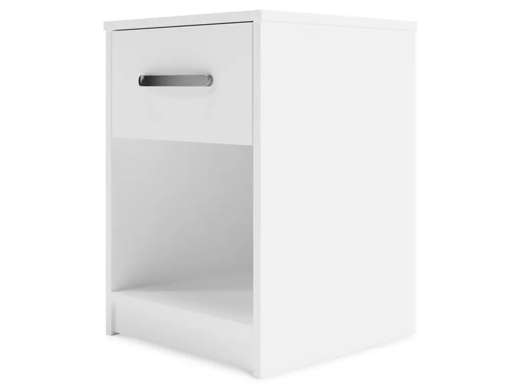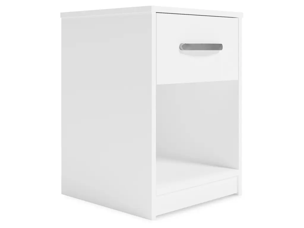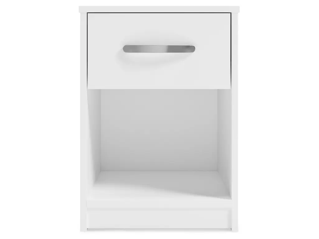 The Flannia nightstand has simple lines and contemporary styling, allowing it to blend seamlessly with any decor Its smooth-gliding drawer on metal ball bearings is ideal for bedside essentials. An open cubby provides a nice place for a storage basket or vase. The sleek metal pull in a brushed nickel-tone finish adds to the streamlined aesthetic. Combine with other units in the collection to create a room that’s sleek and stylish.