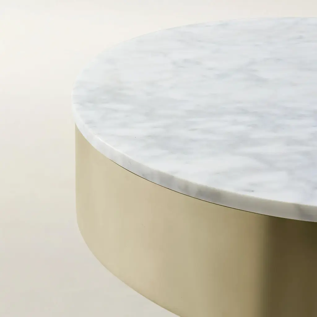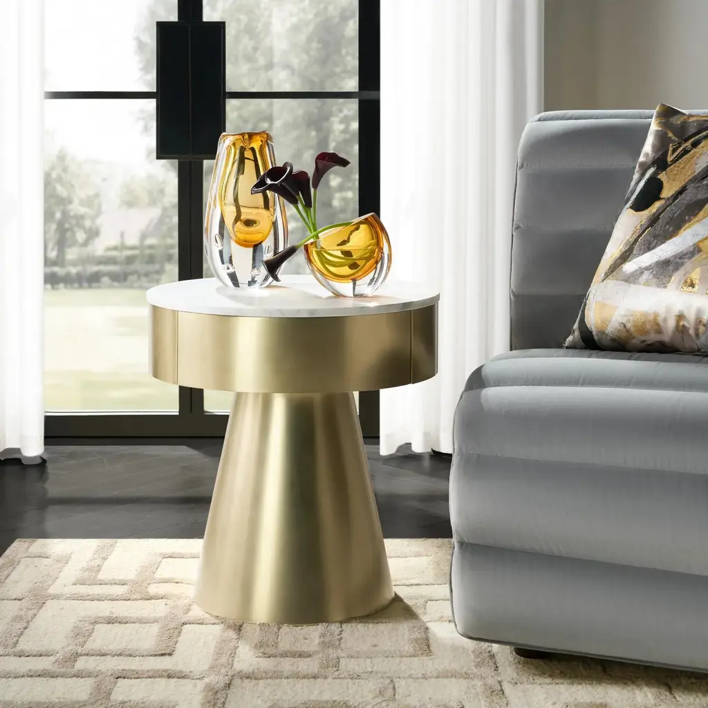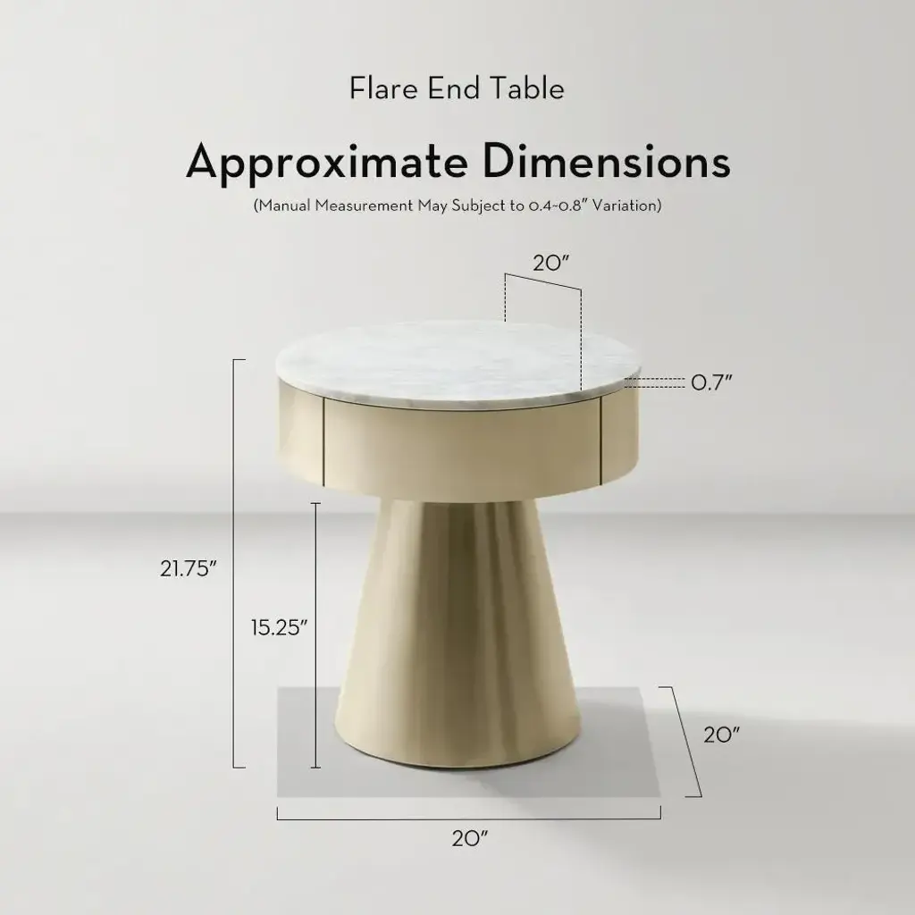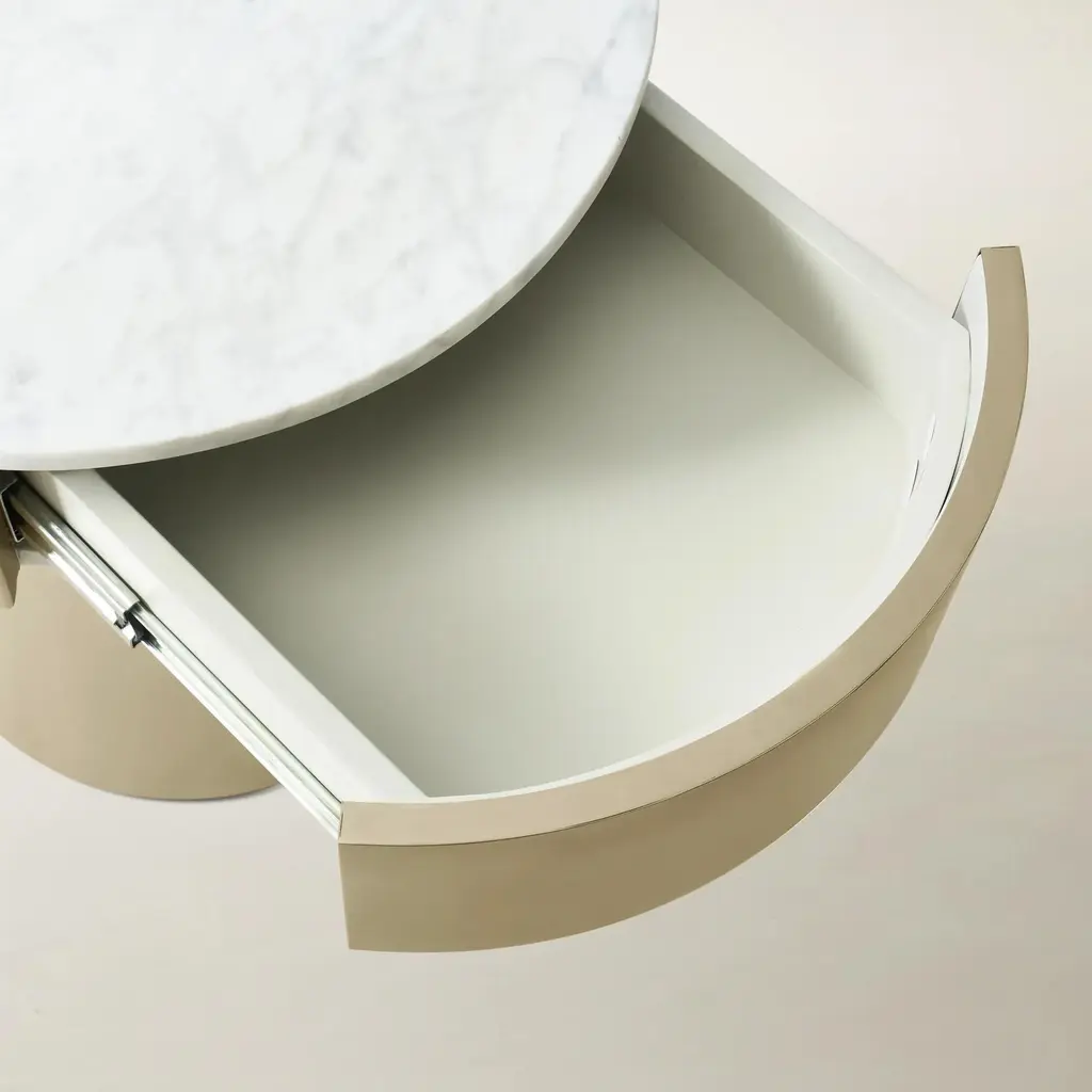 The Flare End Table/Nightstand in White brings an air of refinement to your home. Its crescent-shaped natural white marble top rests on a gleaming gold-plated stainless steel base, creating a balance of beauty and functionality. The soft-close drawer ensures convenient storage while maintaining its clean, timeless look.ZG Exclusive