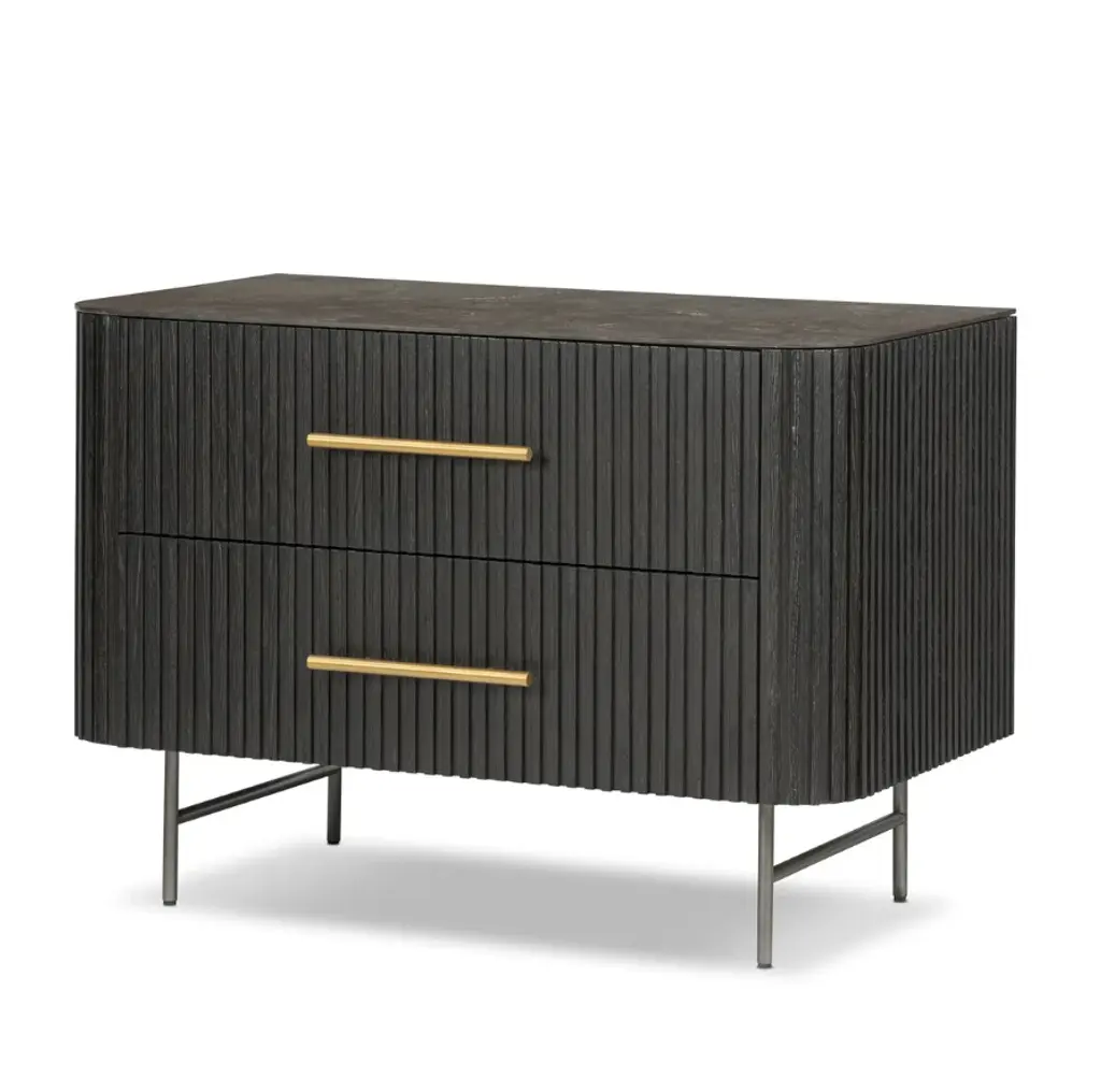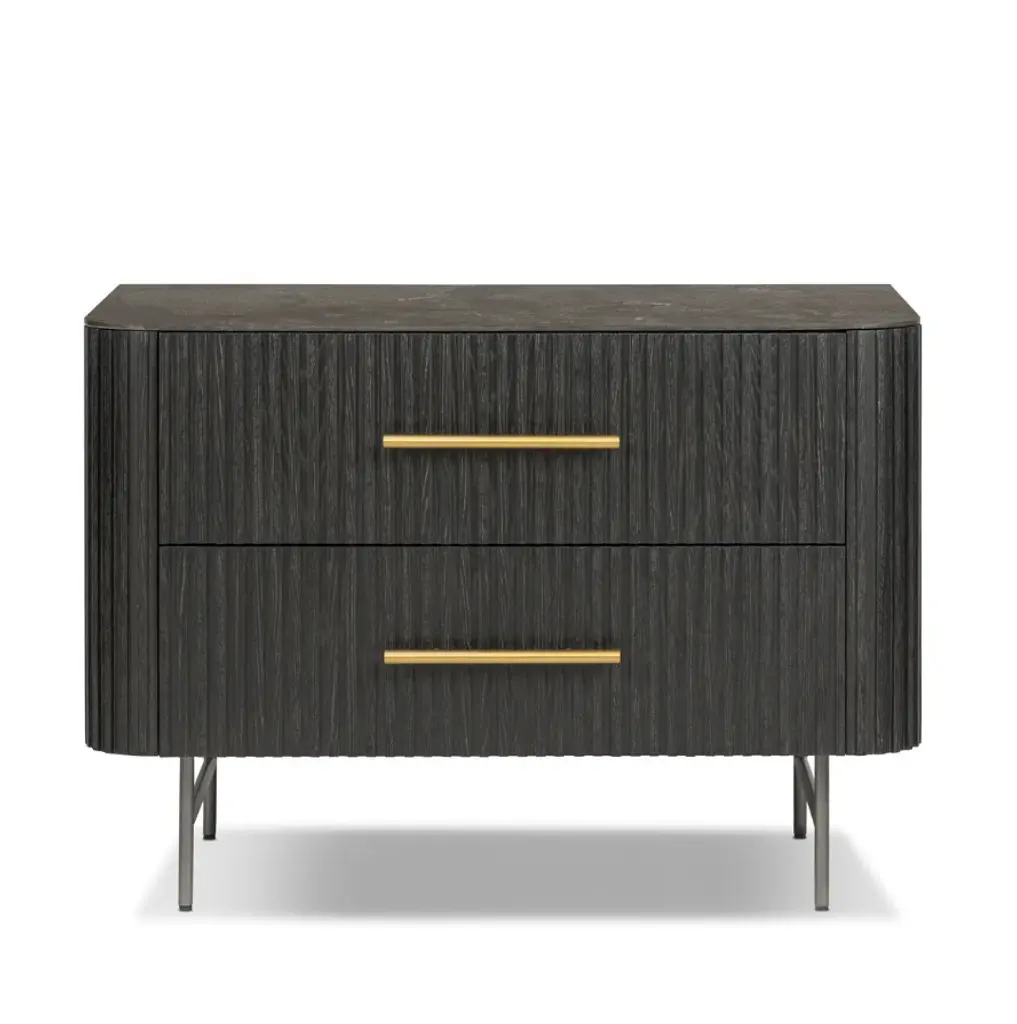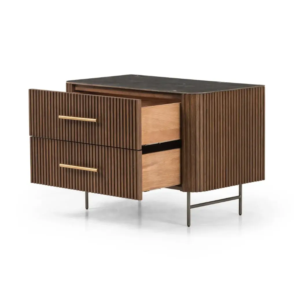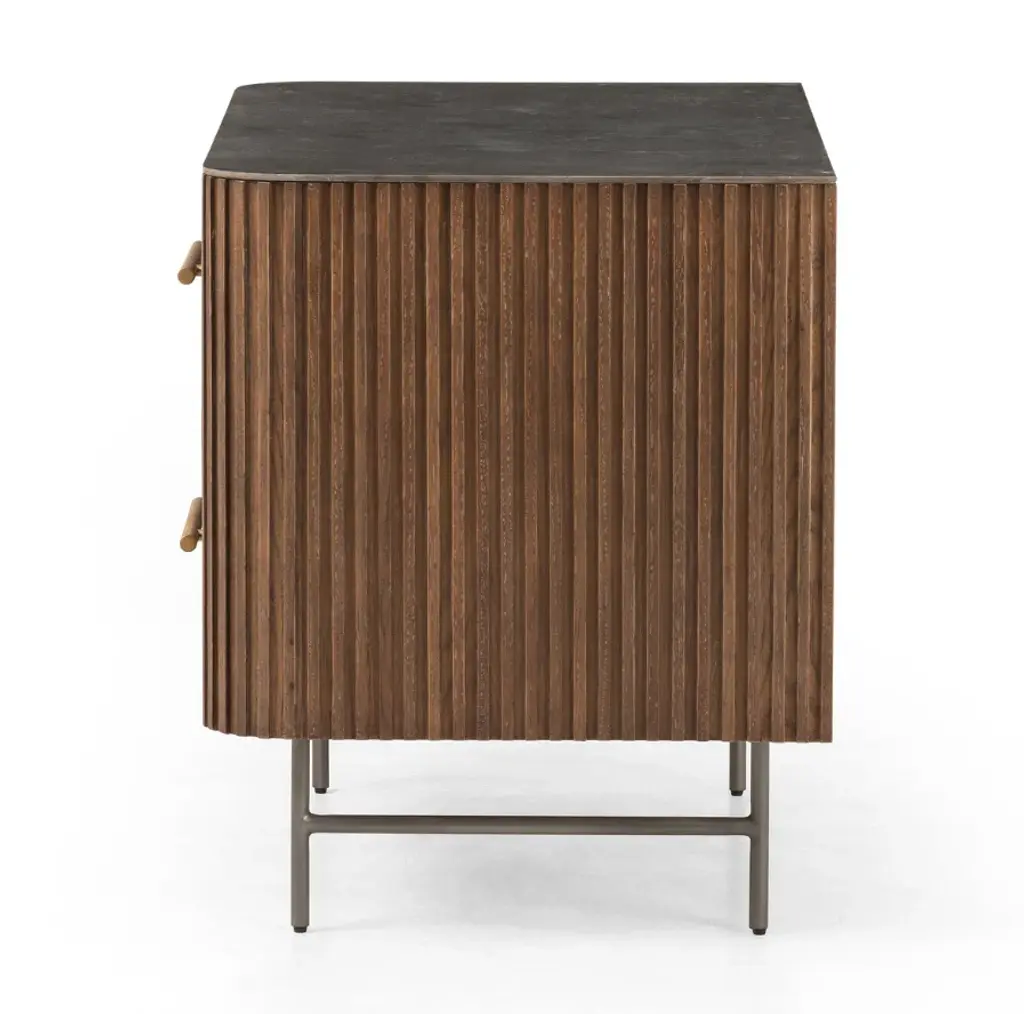 Constructed from solid oak with a bluestone tabletop, the Fletcher nightstand flaunts two roomy drawers with polished brass hardware, curved corners, and reeding for great texture.
