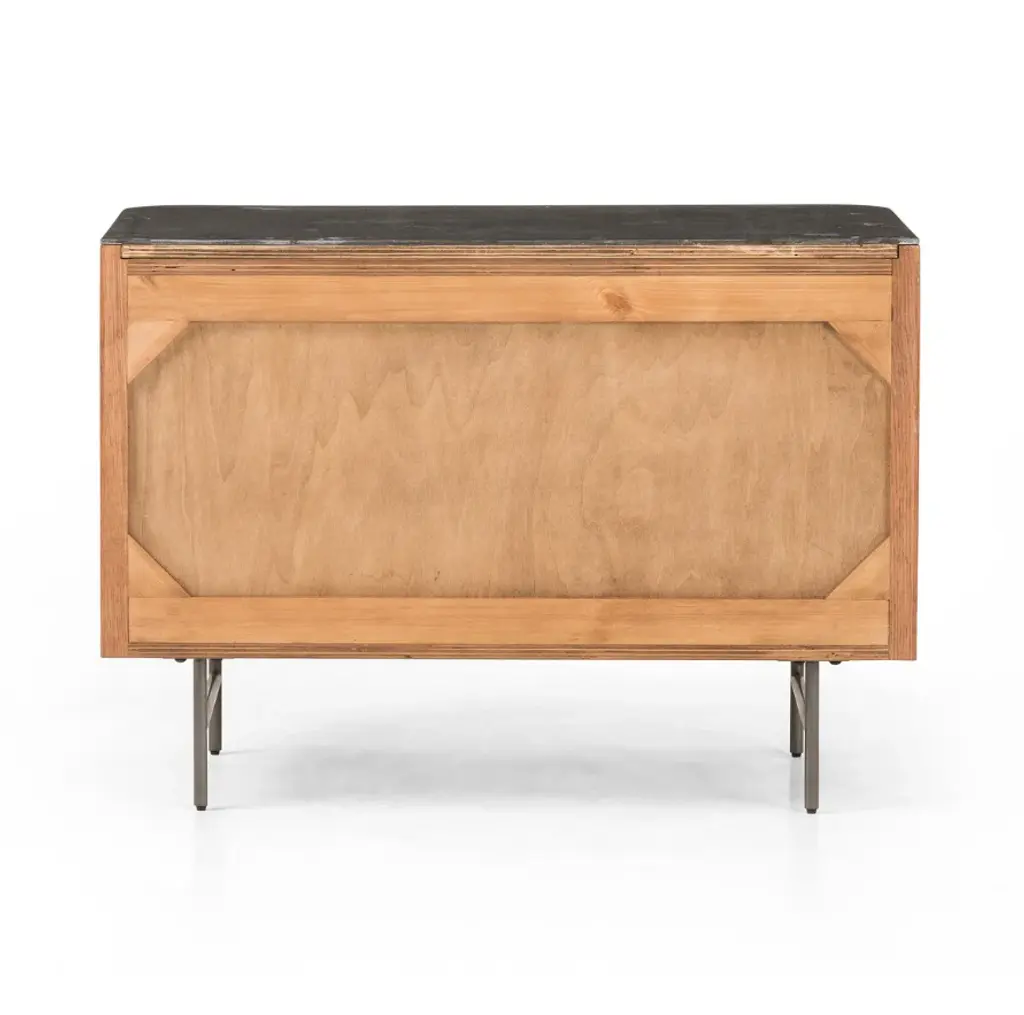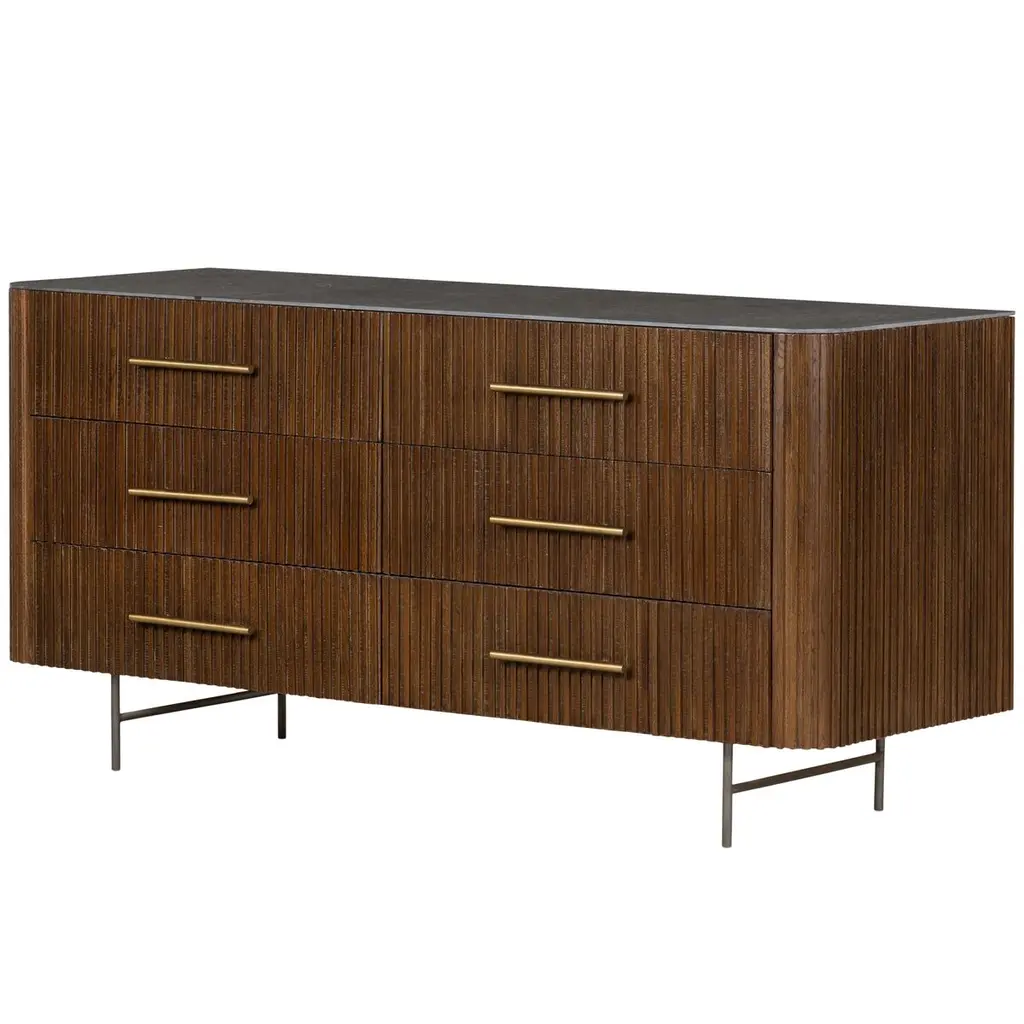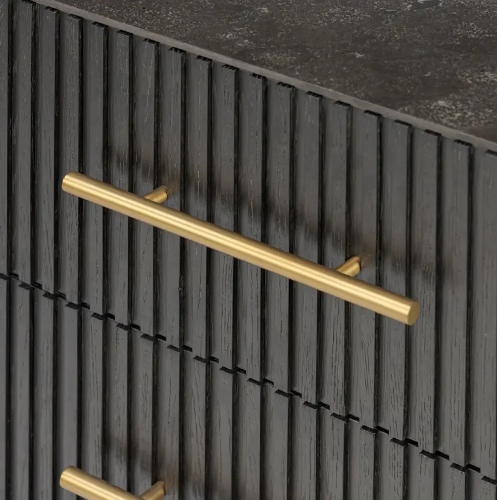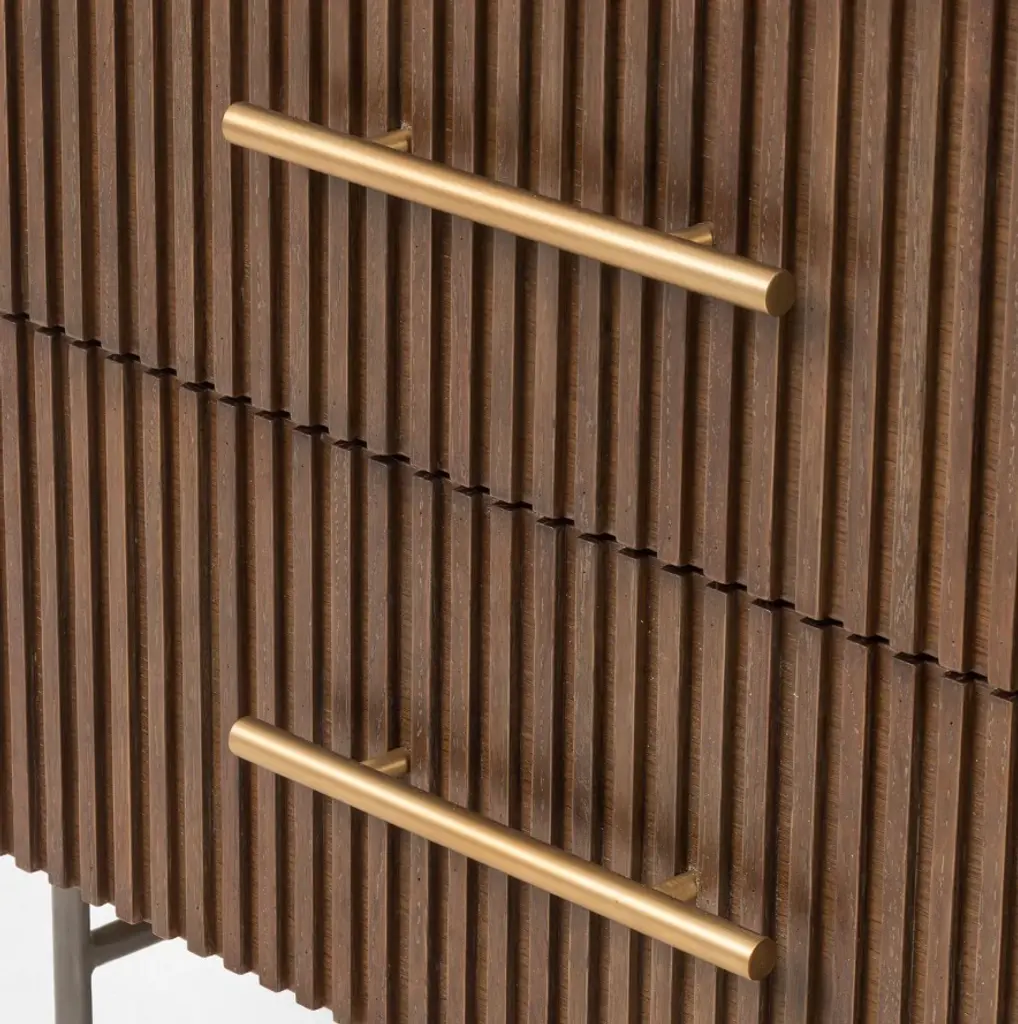 Constructed from solid oak with a bluestone tabletop, the Fletcher nightstand flaunts two roomy drawers with polished brass hardware, curved corners, and reeding for great texture.