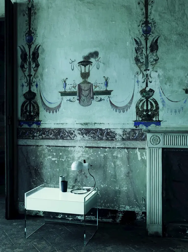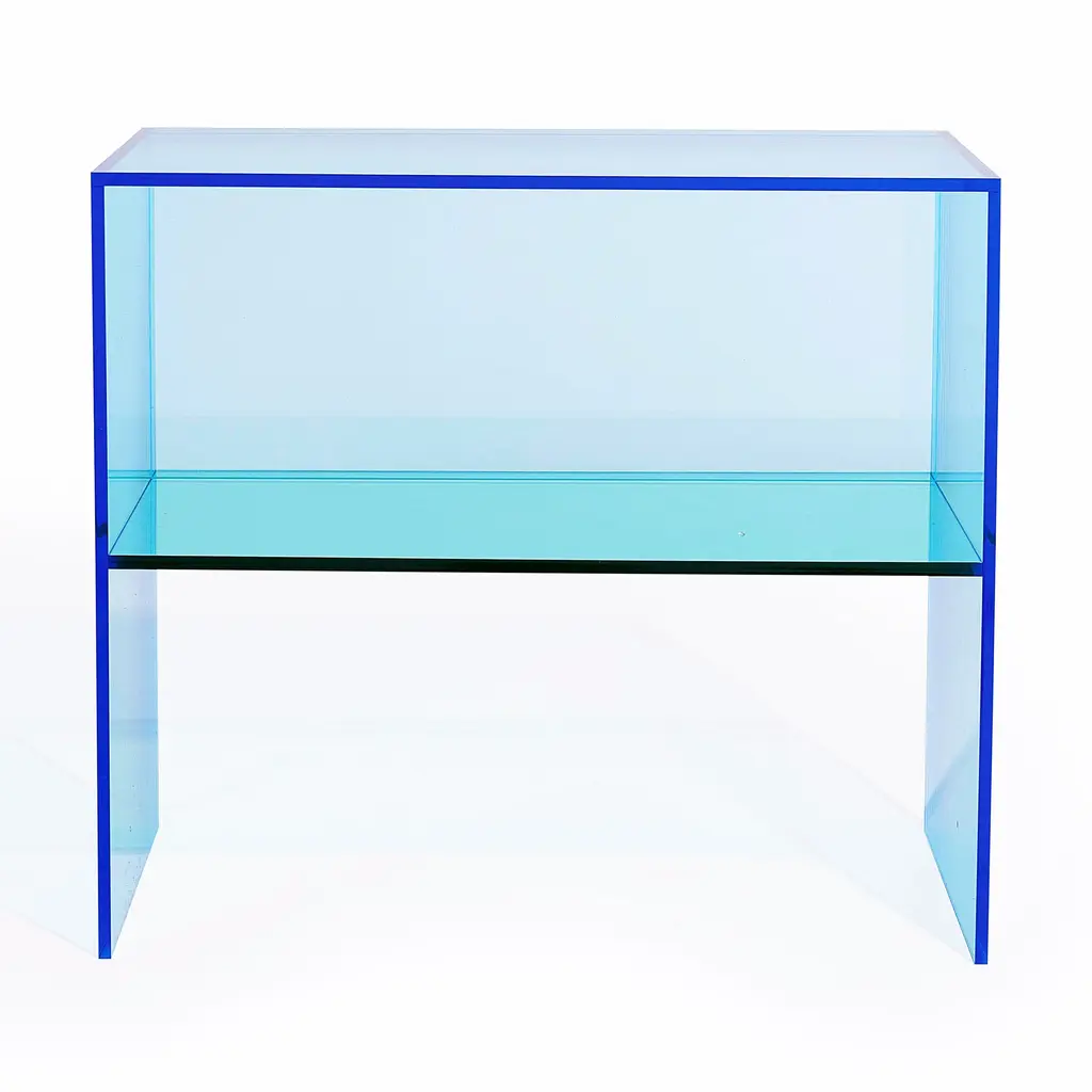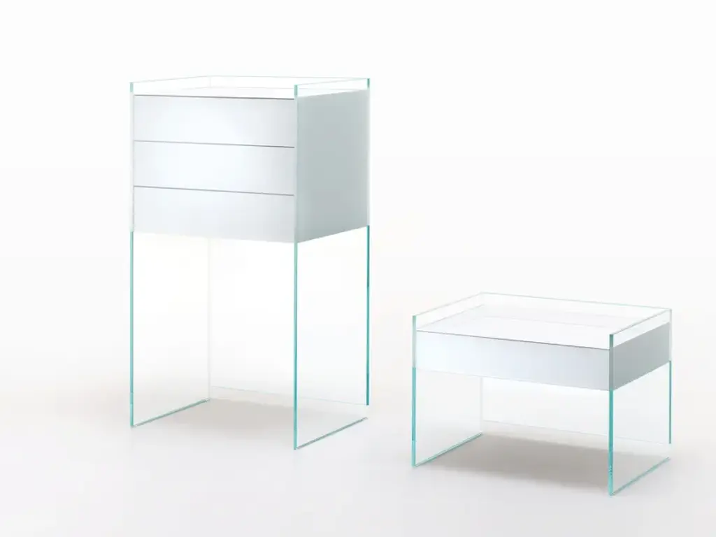 Float is a series of glass chest of drawers of different types and sizes with a pressure opening system. The sides and the back, realized in 12 mm thick glued 45° transparent extralight glass, support drawers in wengé covered on the outside with tempered glass, lacquered in different colours.The bottom of the drawers is in glass in the same finish as the outside.Finishes:- Glossy lacquered glass