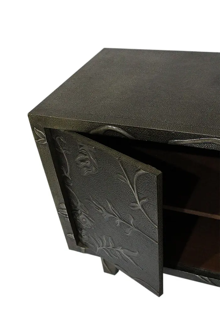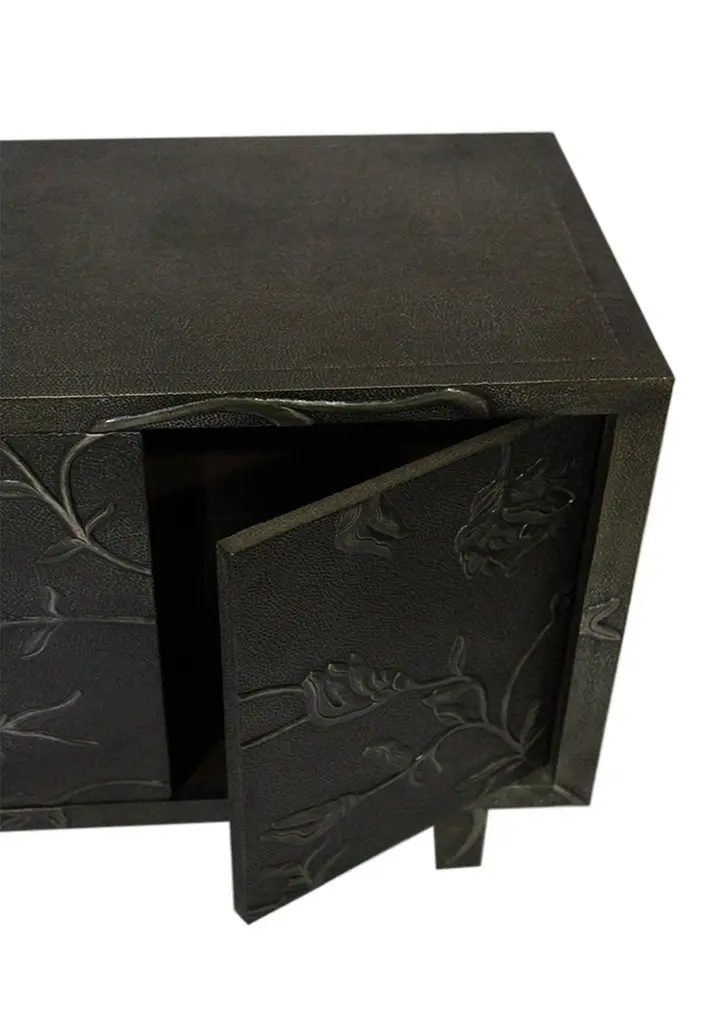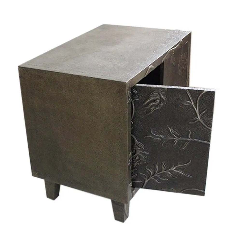 Inspired by the floral motifs used in the paintings of palaces of Rajasthan. One of the best selling pieces of Stephanie Odegard collection. This elegant piece is hand made from solid teak which is joined to form the clean and elegant outline. Our master craftsmen carve the floral forms which is meticulously encased in a tight-fitting metal skin. The available options for metal cladding are brass, white bronze, antiqued bronze, silver and copper. Both silver and copper will tarnish over time. Regular non-abrasive household metal polishes can be used to restore the original finish. Floral Nightstand in Antiqued White Metal Over Wood and MDFSize- 24"x18"x28"HMaterials - Antiqued White Metal, Wood and MDF, Hand Hammered , Hand Carved, Polished.Please note that moisture in air, sudden change in temperature and natural movement of wood over time causes the metal to wrinkle or bubble up. We use well seasoned, reclaimed teak and high quality marine grade MDF (wherever technically possible) to avoid and delay the above mentioned changes. However a perfect stability of metal cannot be guaranteed.Buyer Cancellation-The cancellation charge is 25% which increases to 50% if the production is started.Prices do not include shipping from India (for custom orders) or our MN warehouse (items from stock). That will be additional.
