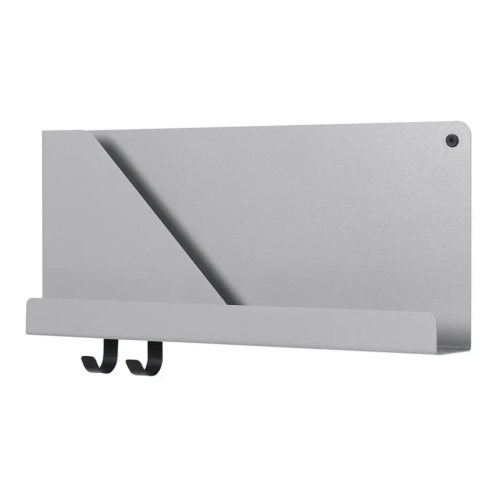 "Inspired by the shadow-play of layers, Folded is based on a seemingly simple bending technique of a single sheet of metal to create pockets which hold and separate your items. Featuring a subtle bolt and hooks for hanging objects, it is a versatile wall mount that can be used in both a practical and a decorative manner - suitable for organizing anything from mail to books, perfumes or spices, or just displaying your favorite belongings, in the hallway, bathroom, bedroom or kitchen." - Johan Van Hengel, Designer Made from a single piece of bended steel, the Folded Shelves have a graphically modern expression. To be mounted on wall. Each shelf comes with two bolts for mounting and two hooks for hanging objects on. Use it as a nightstand, in the hallway, kitchen, living room or office.