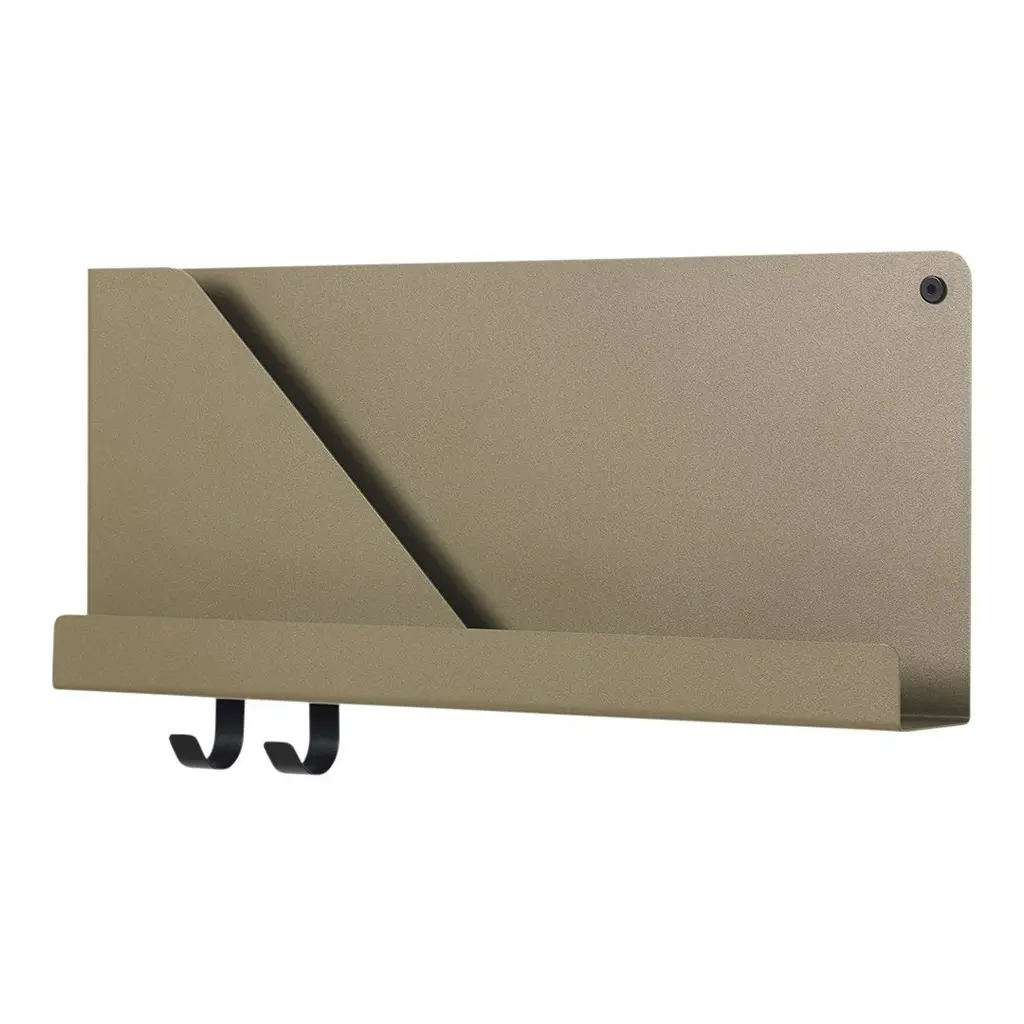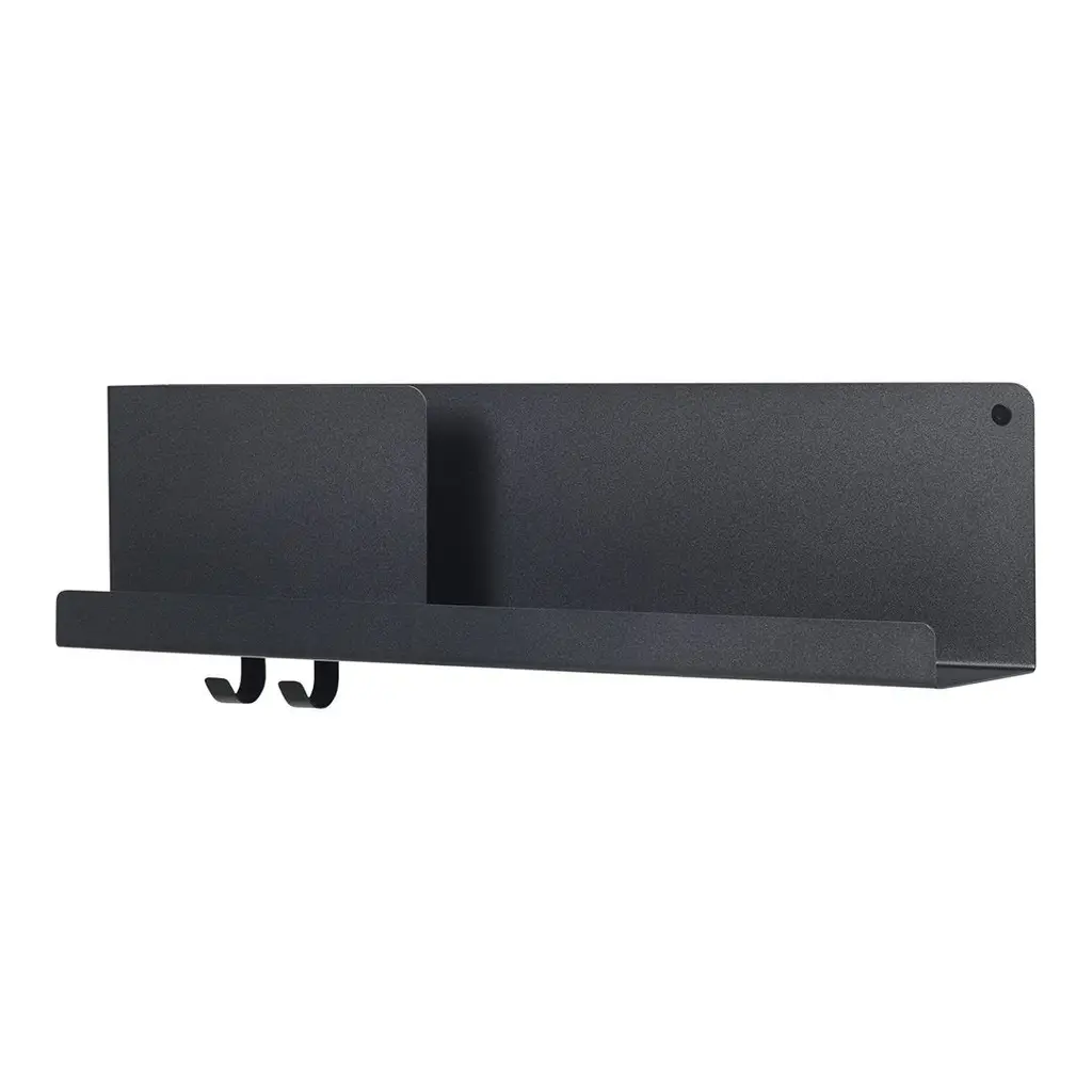 "Inspired by the shadow-play of layers, Folded is based on a seemingly simple bending technique of a single sheet of metal to create pockets which hold and separate your items. Featuring a subtle bolt and hooks for hanging objects, it is a versatile wall mount that can be used in both a practical and a decorative manner - suitable for organizing anything from mail to books, perfumes or spices, or just displaying your favorite belongings, in the hallway, bathroom, bedroom or kitchen." - Johan Van Hengel, Designer Made from a single piece of bended steel, the Folded Shelves have a graphically modern expression. To be mounted on wall. Each shelf comes with two bolts for mounting and two hooks for hanging objects on. Use it as a nightstand, in the hallway, kitchen, living room or office.
