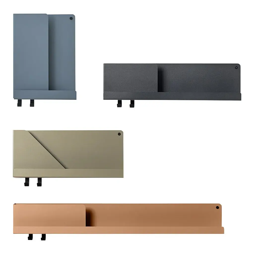 "Inspired by the shadow-play of layers, Folded is based on a seemingly simple bending technique of a single sheet of metal to create pockets which hold and separate your items. Featuring a subtle bolt and hooks for hanging objects, it is a versatile wall mount that can be used in both a practical and a decorative manner - suitable for organizing anything from mail to books, perfumes or spices, or just displaying your favorite belongings, in the hallway, bathroom, bedroom or kitchen." - Johan Van Hengel, Designer Made from a single piece of bended steel, the Folded Shelves have a graphically modern expression. To be mounted on wall. Each shelf comes with two bolts for mounting and two hooks for hanging objects on. Use it as a nightstand, in the hallway, kitchen, living room or office.