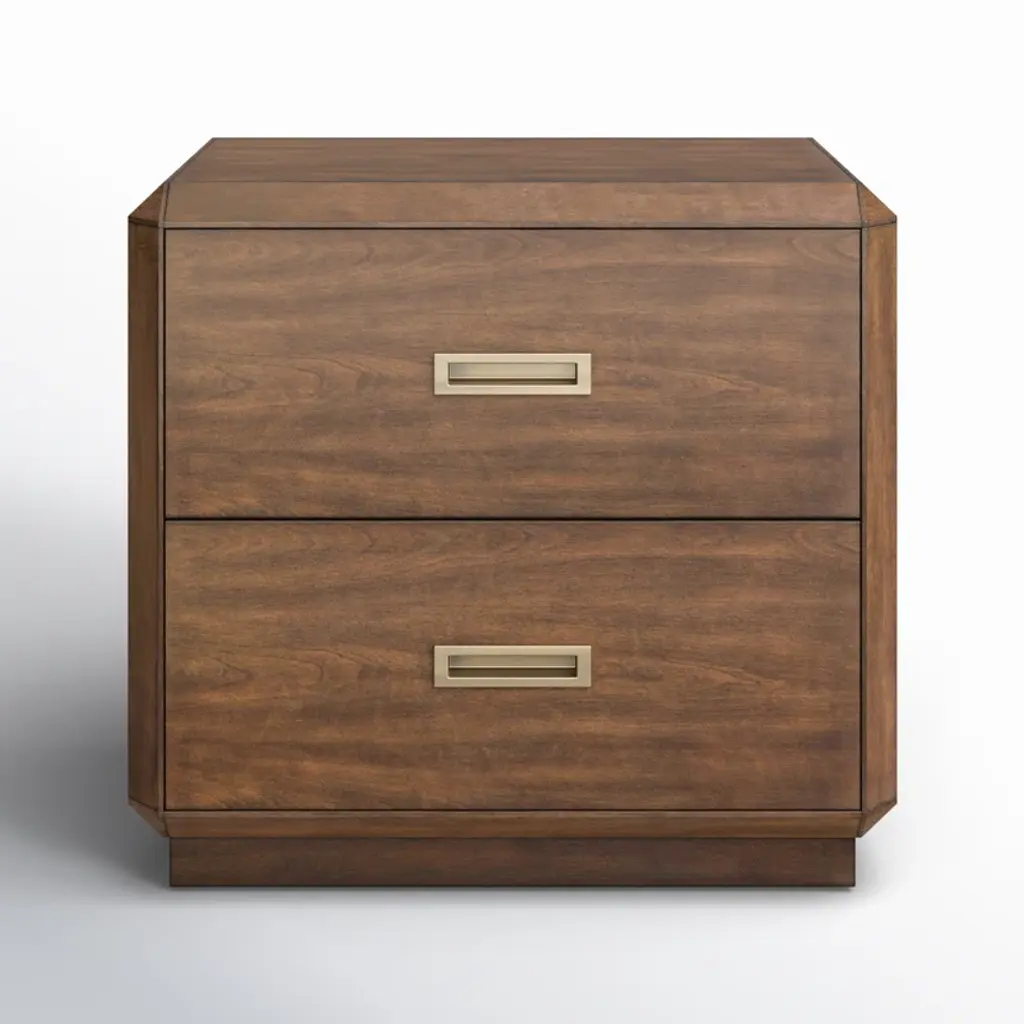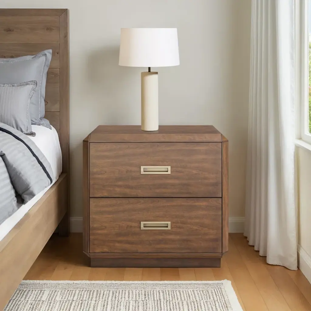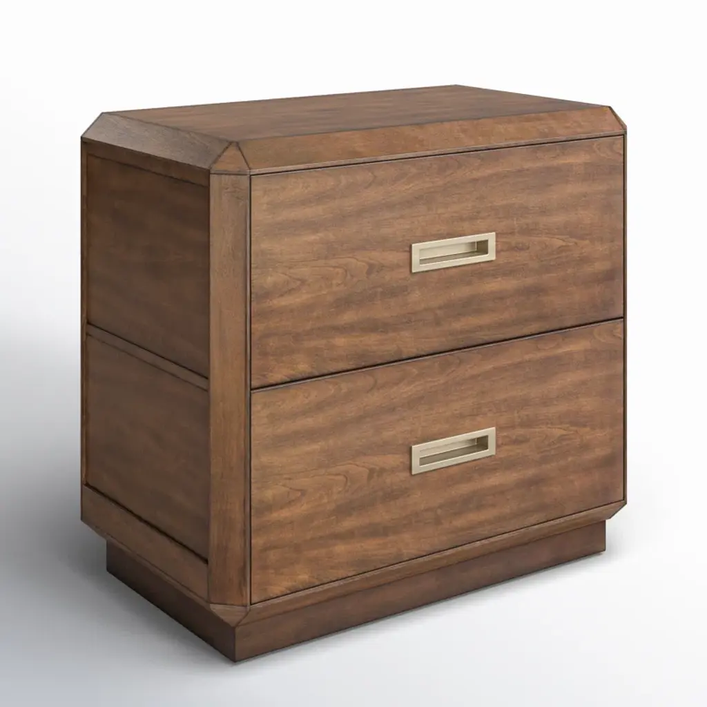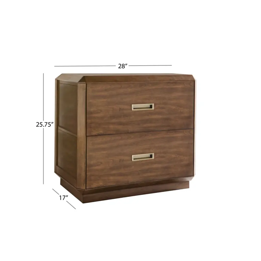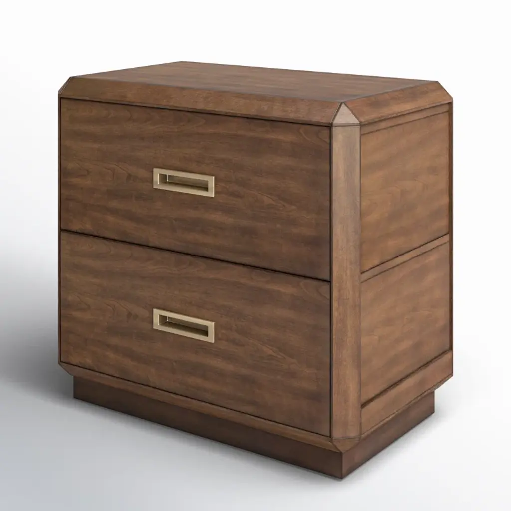 This two-drawer nightstand boasts a masculine silhouette with bold, hand-carved details. Crafted of solid rubberwood, this collection is finished in a rich mahogany brown with beautiful blonde hang-ups throughout, enhancing its classic charm. Featuring two soft-closing drawers, this dust-free nightstand's brass hardware enhances the multi-dimensional finish for a striking final look. Complete your collection with the matching mirror, bed, and dresser.