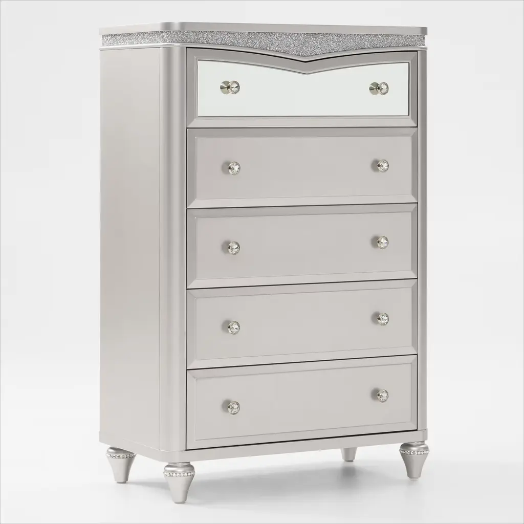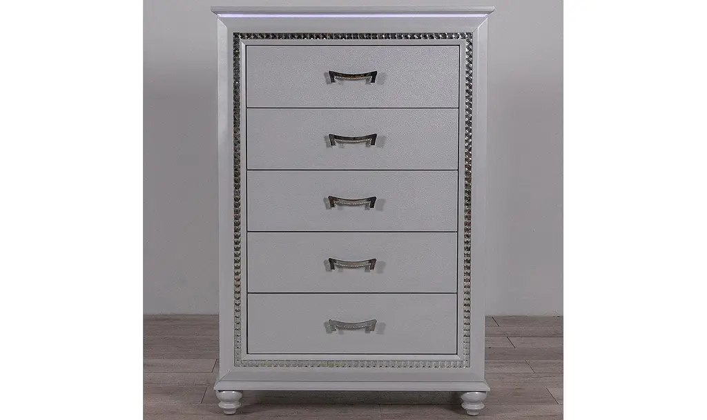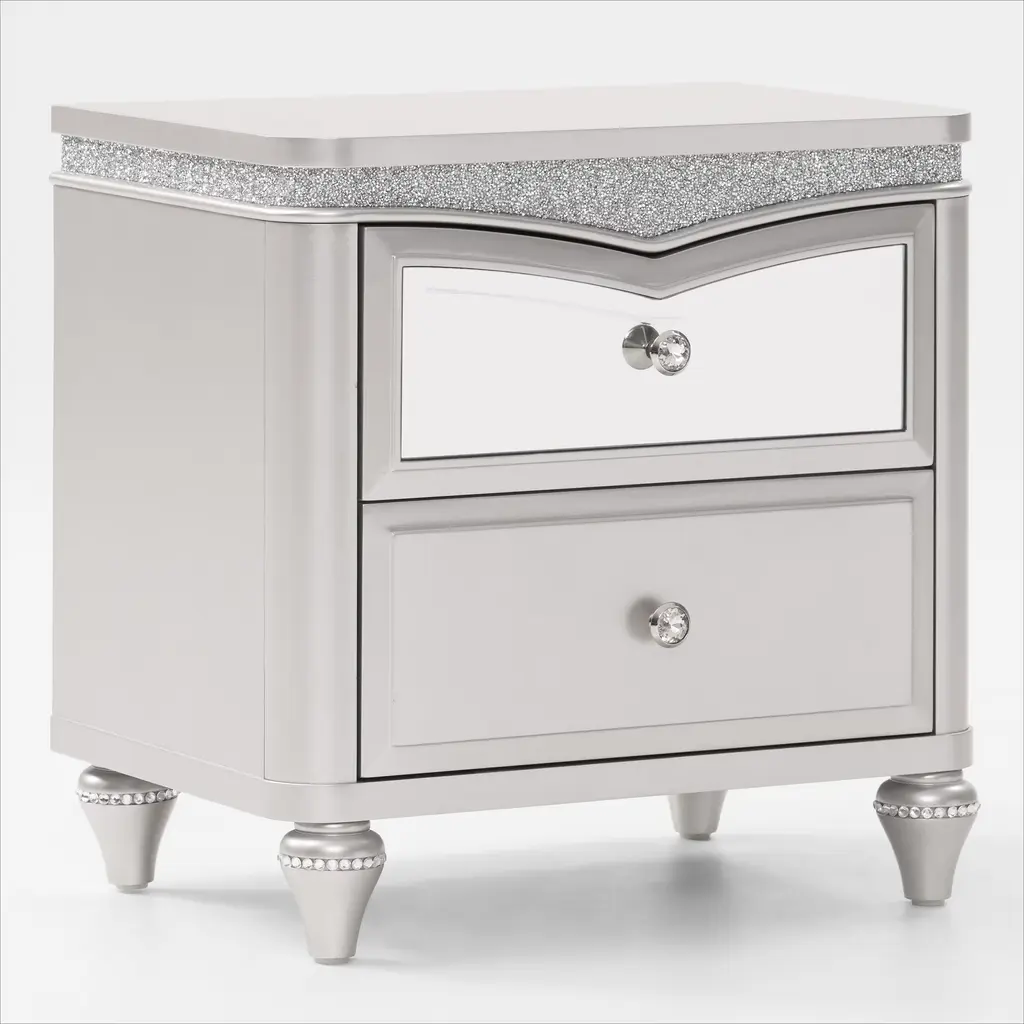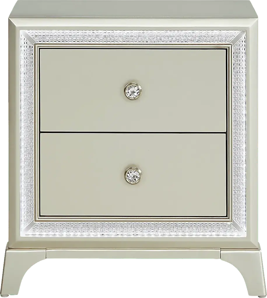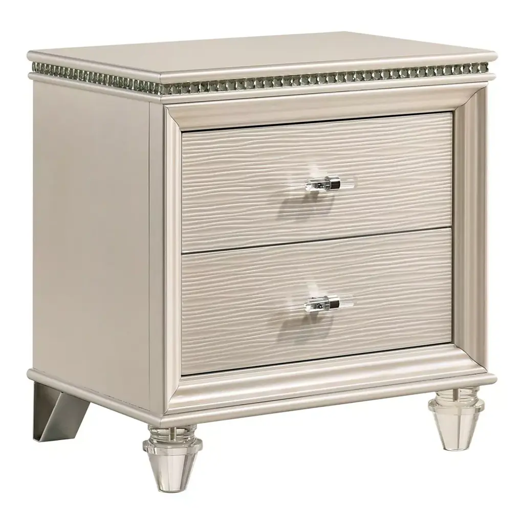 With lustrous and pearlescent white this nightstand from the Fosset collection adds a glamorous look to any space. Exquisite touches such as acrylic turned-style feet and matching acrylic knobs grasped by a silver mount would make a pair of these nightstand the center of attention as flanked on each side of a bed. Perfect for a transitional style bedroom, this nightstand also provides ample space for storing sleepwear and keeping handheld devices close at hand.
