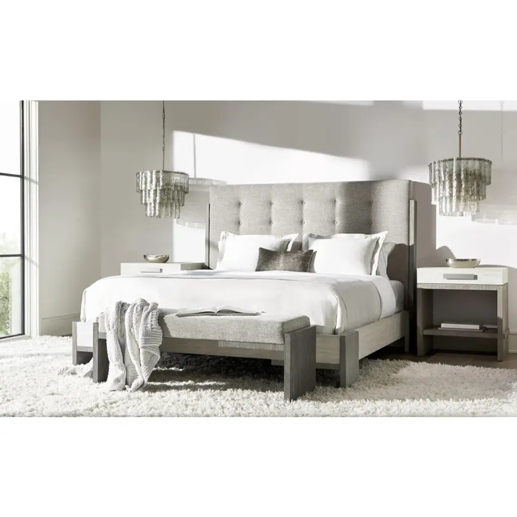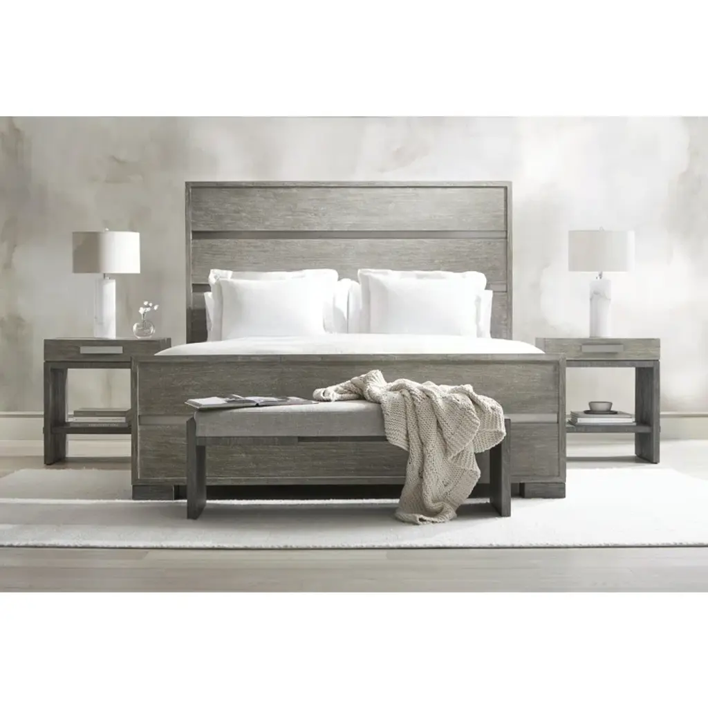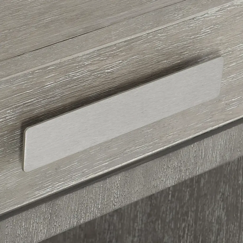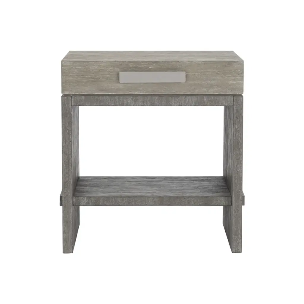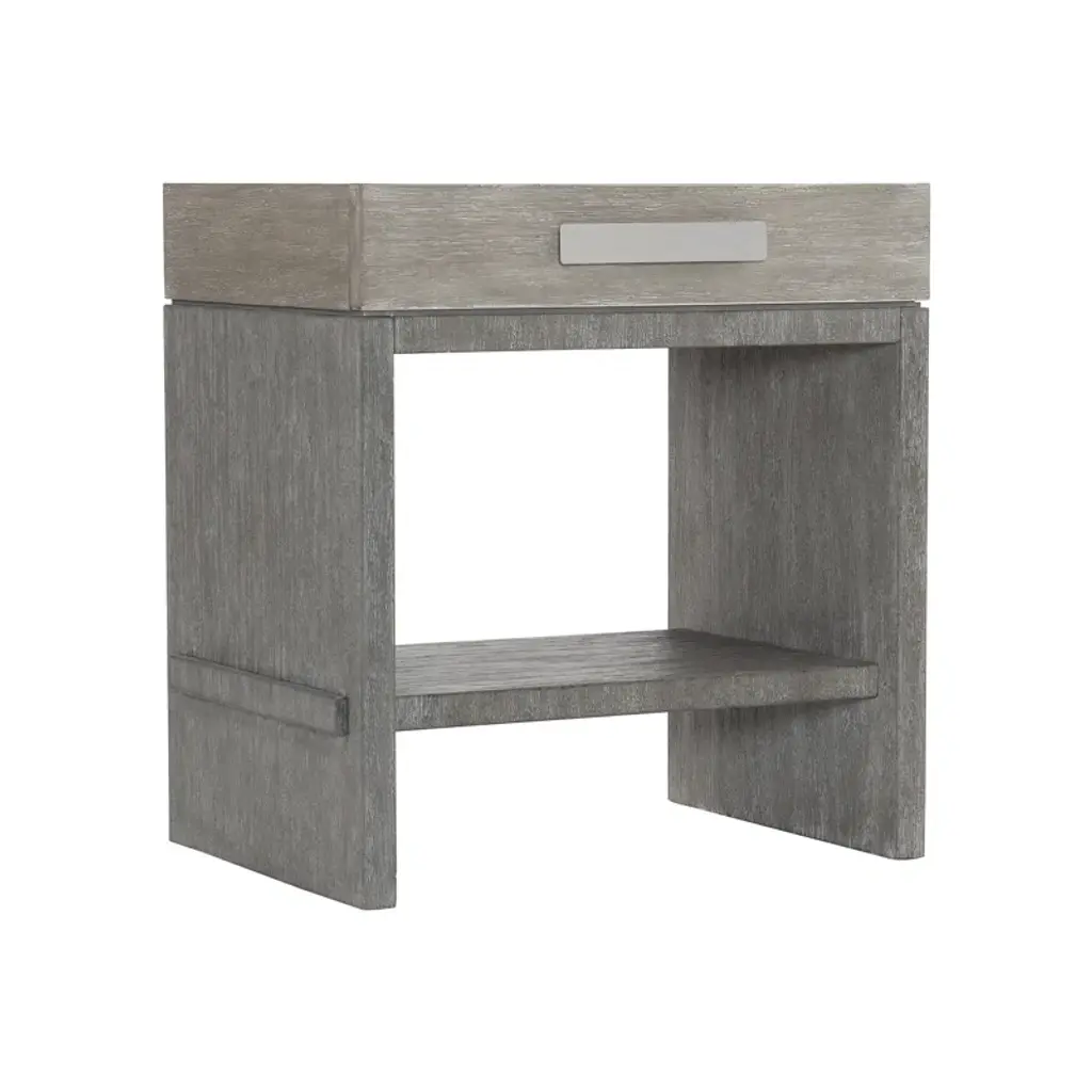 Foundations is a new, refined expression of modern rustic, defined by a minimalist style and relaxed finishes. Crafted from cerused, wire-brushed acacia, the nightstand offers a rustic style with a contemporary touch. Clean lines and intersecting planes create a sophisticated design aesthetic, softened by a palette of oyster and driftwood grays. A brushed stainless steel pull on its single drawer adds a subtle accent to the simple form.
