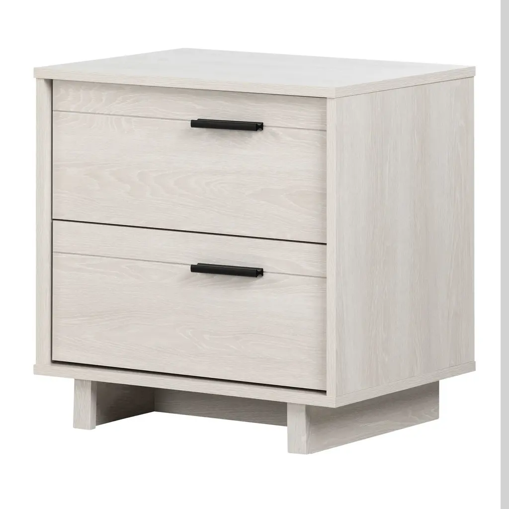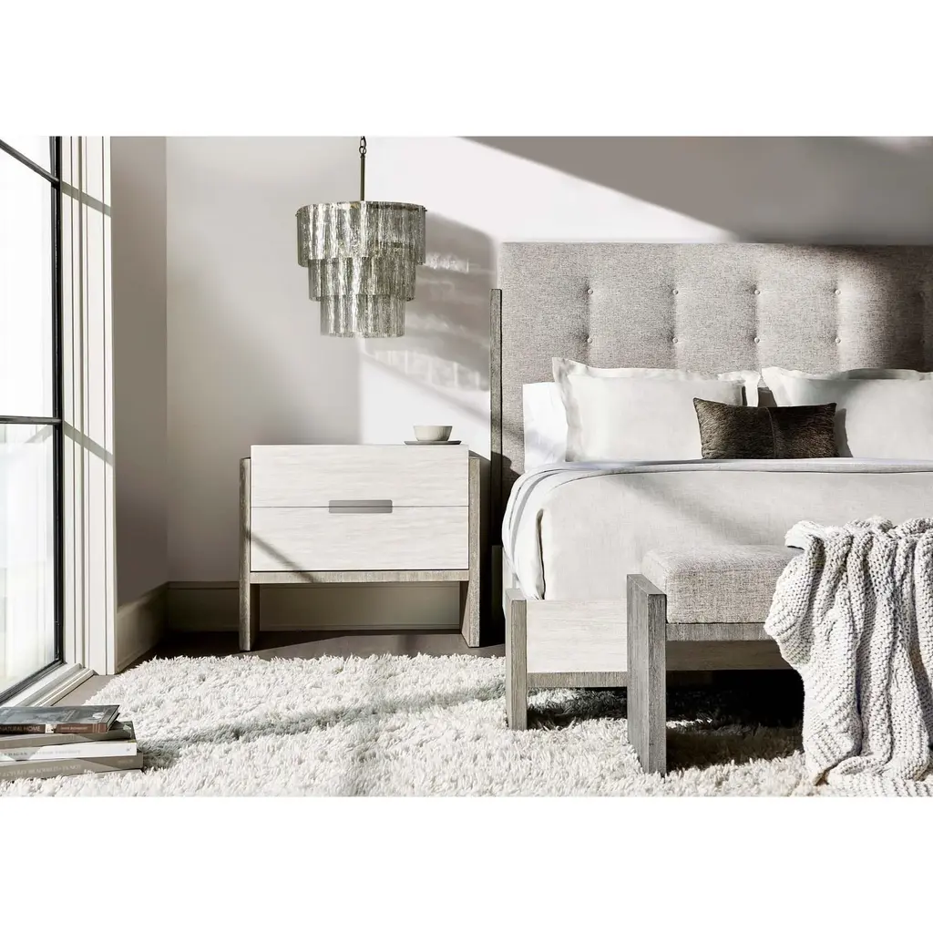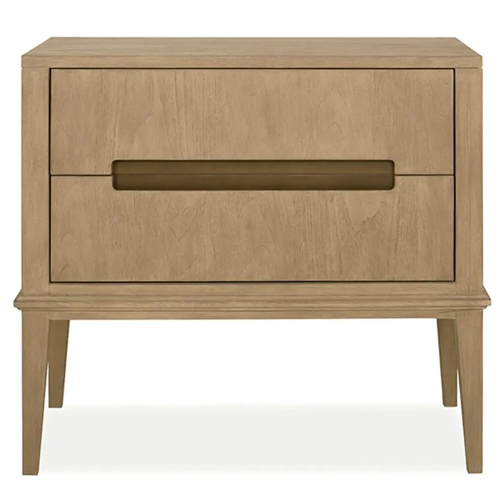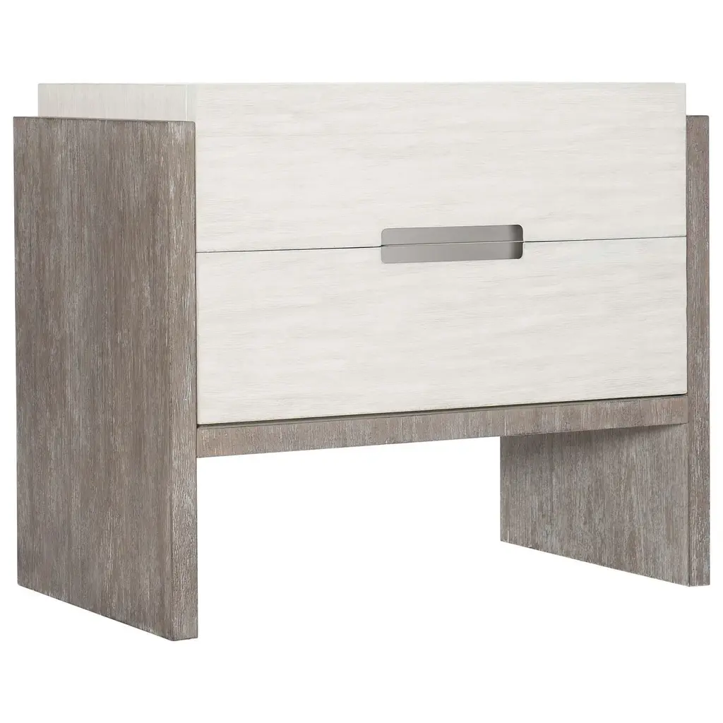 Foundations is a new, refined expression of modern rustic, defined by a minimalist style and relaxed finishes. The Foundations nightstand offers tranquility and balance with its two-tone design. Two soft-closing drawers feature a Linen finish, while the support panels and rails are finished in Light Shale. Cerused, wire-brushed acacia reveals a deep, tactile grain. Brushed stainless steel pulls add a subtle accent to the clean, simple form. From the Manufacturer Two-tone finish - Drawer box in Linen finish, and support panels and rails in Light Shale finish Two soft-closing drawers with finger pull with inset brushed stainless steel plate Dual Port/USB charger on back of drawer box Adjustable glides Anti-tip kit Note: Not designed to support TV &/or other media