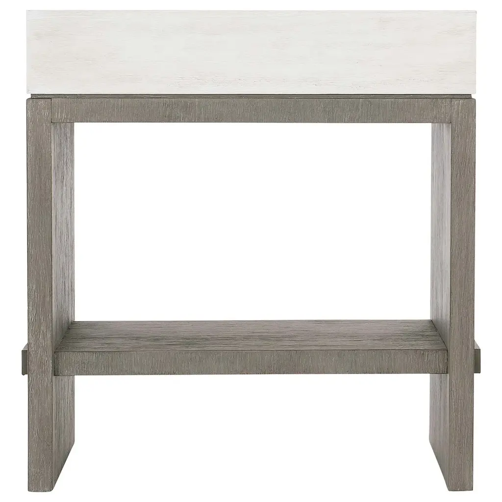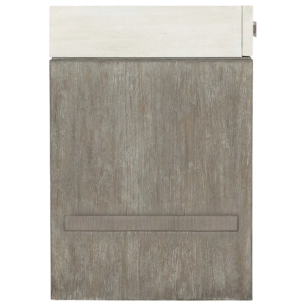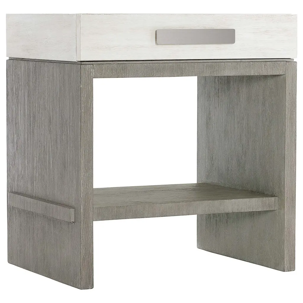 Foundations is a new, refined expression of modern rustic, defined by a minimalist style and relaxed finishes. Crafted from cerused, wire-brushed acacia in two-tone finish, the Foundations nightstand offers rustic style with a contemporary touch. Clean lines and intersecting planes create a sophisticated design aesthetic, softened by a palette of gray and white. A brushed stainless steel pull on its single drawer adds a subtle accent to the simple form.