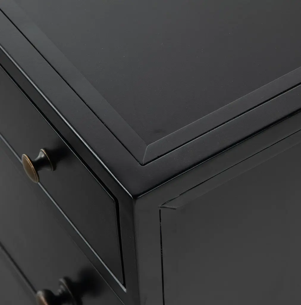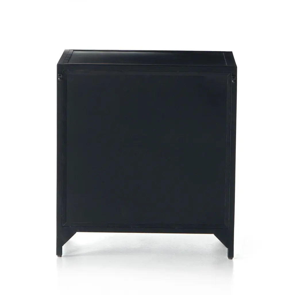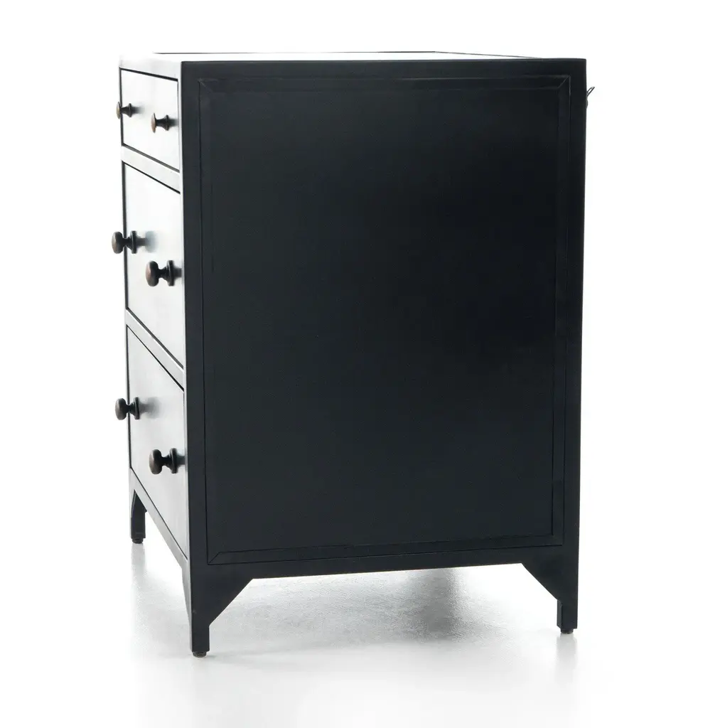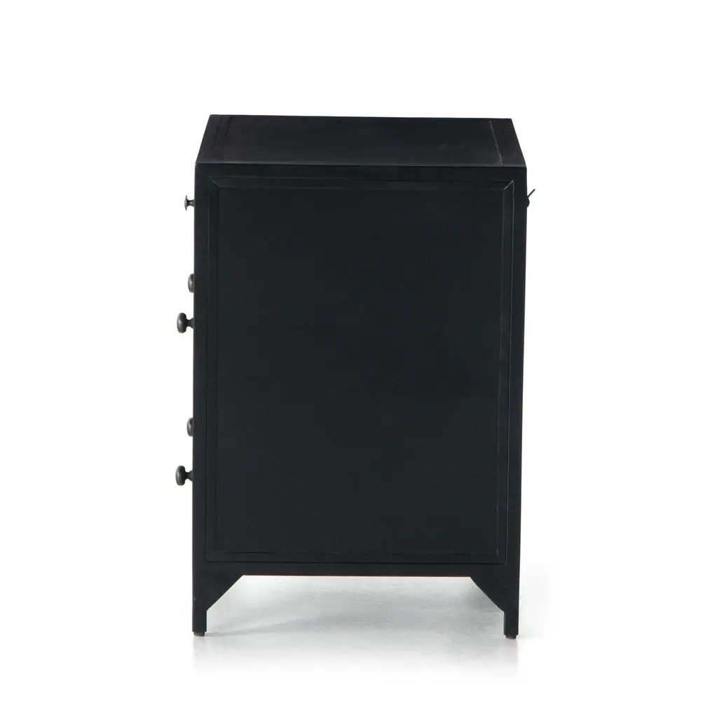 Industrial-inspired, a black-finished iron nightstand pairs with bronzed knobs for contrast.