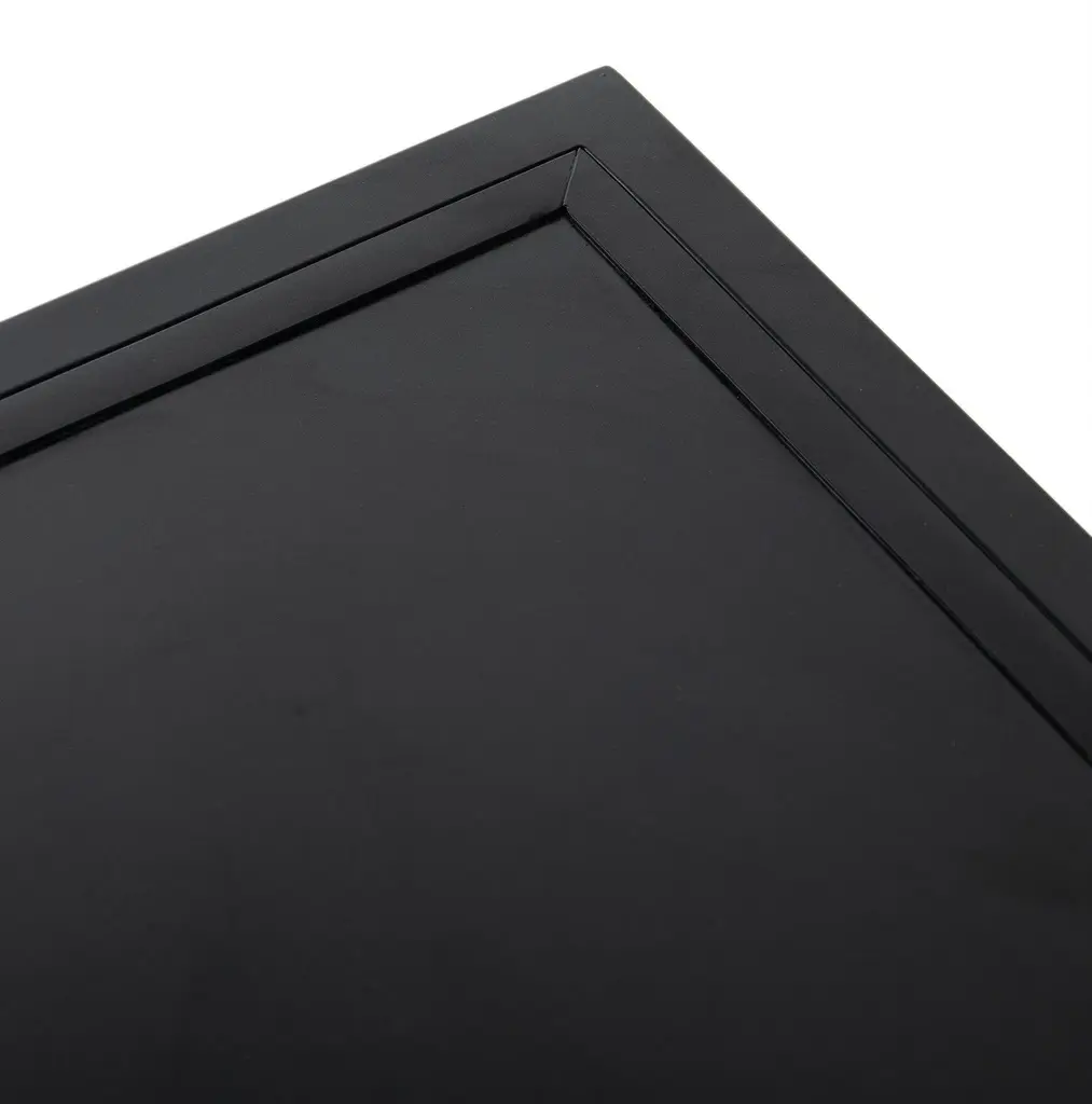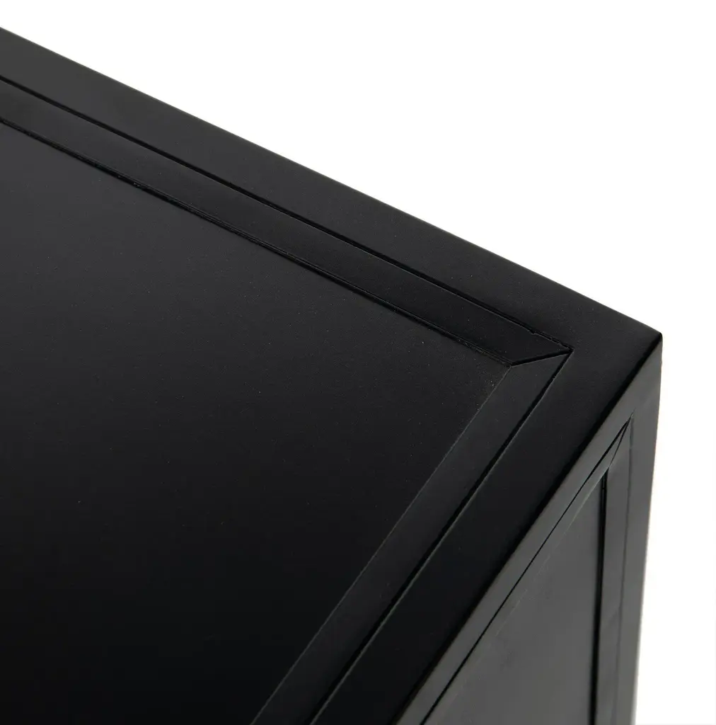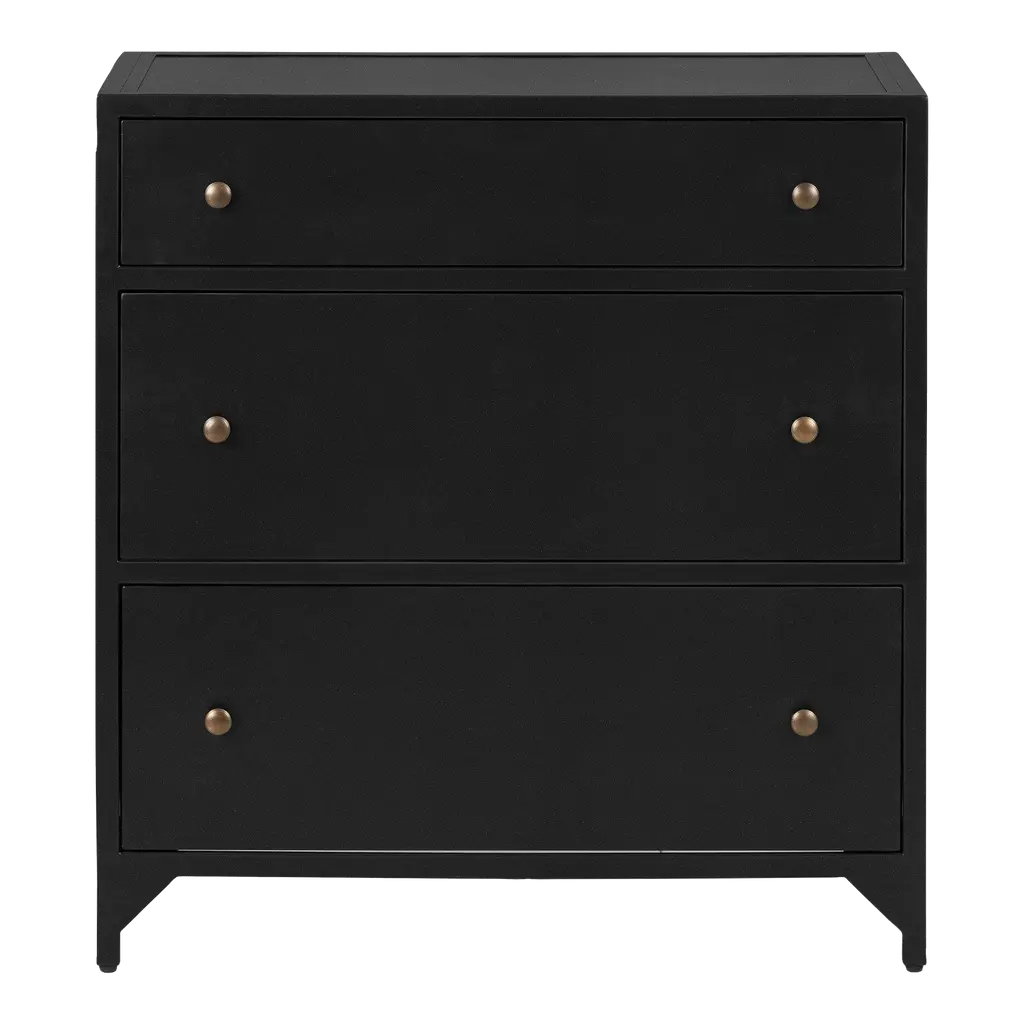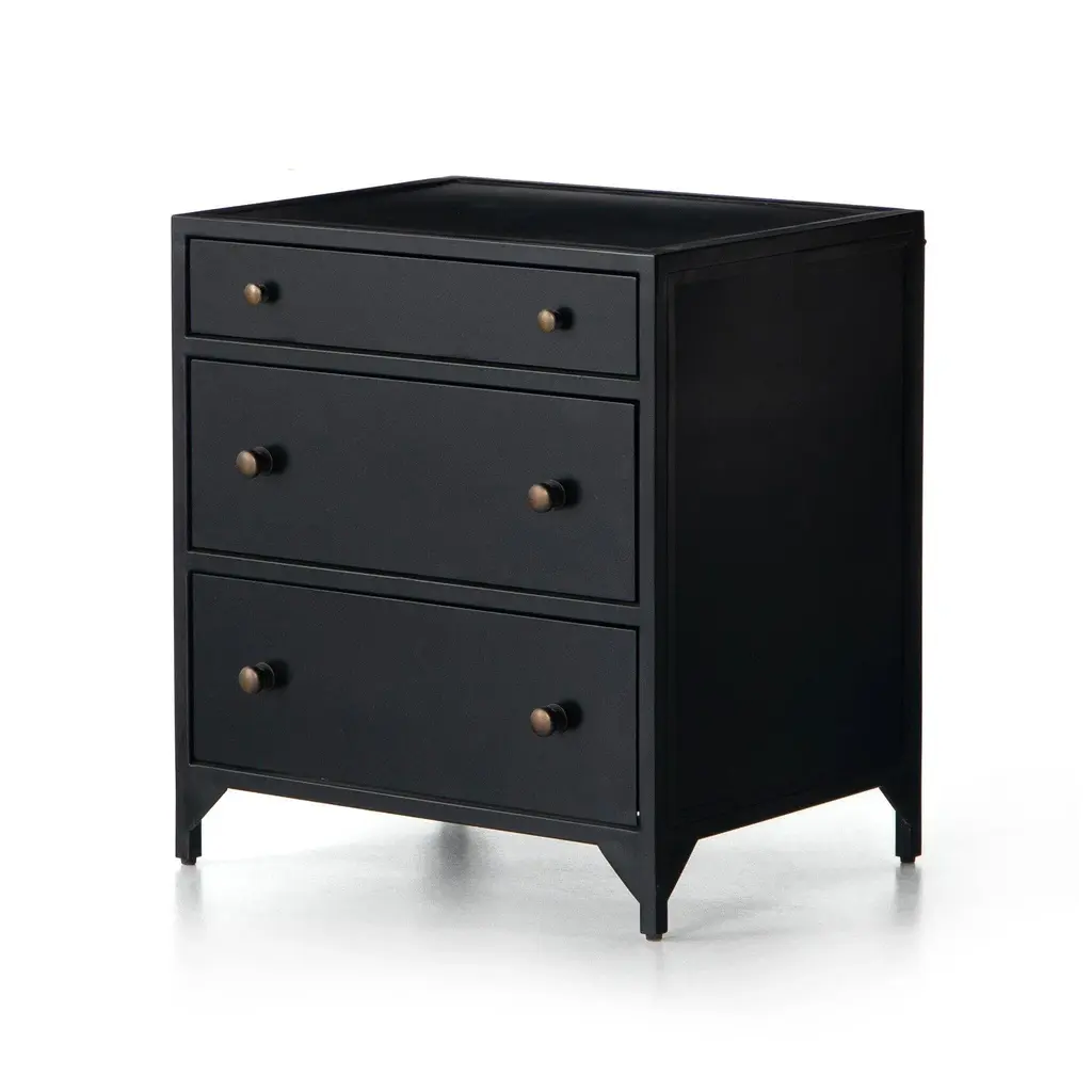 Industrial-inspired, a black-finished iron nightstand pairs with bronzed knobs for contrast.