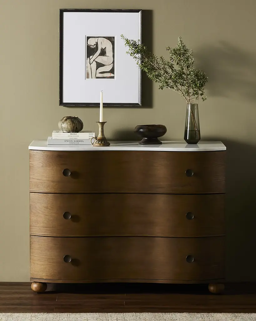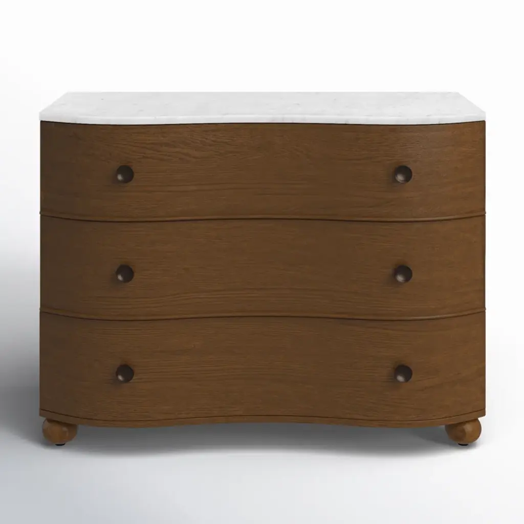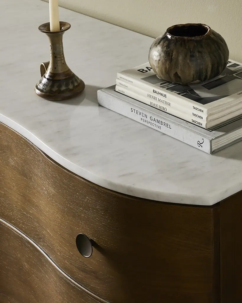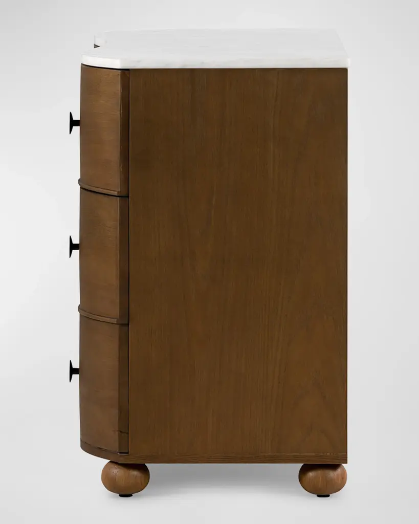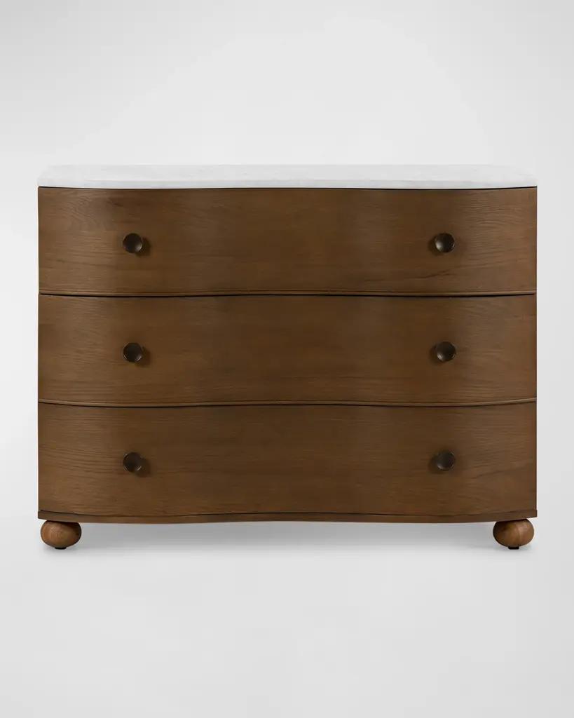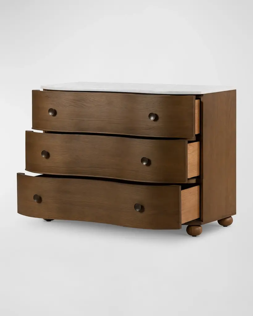 Featuring a Toasted Oak finish, this three-drawer nightstand is inspired by European antiques to bring both style and storage space to the bedroom. Handcrafted of oak wood, oak veneers, and marble Overall, approx. 47.5"W x 21.75"D x 35.5"T Assembly required; includes hardware Wipe clean Weight, 222.0 lbs Imported Boxed weight, approximately 293.65 lbs Shipping Direct from Vendor, usually ships within 50 business days. About Four Hands: Four Hands is a dynamic lifestyle brand that offers a diverse range of furniture and home decor items. With a focus on innovative design and quality craftsmanship, Four Hands creates pieces that blend modern aesthetics with traditional craftsmanship. From stylish sofas and chairs to unique accent pieces and accessories, each product is thoughtfully designed to inspire and elevate any living space. With a commitment to sustainability and ethical practices, Four Hands is dedicated to creating beautiful, functional, and responsibly made products for the modern home.