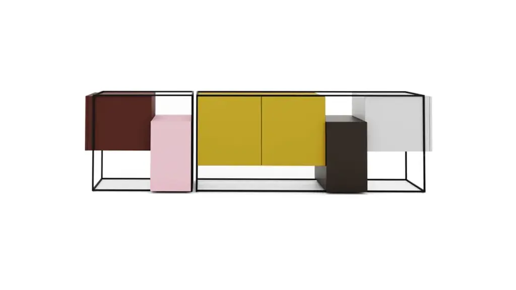 This colourful buffet stands lovely in a room.All the boxes are at different levels, the frame seems to keep all boxes together but doesn't succeed.This, in combination with the colors, is the eyecatcher of the concept. The end result is a rigid designed sideboard with a pleasant character. Framed is available in 4 basic forms and is for sale in specialized design shops.