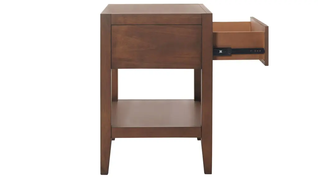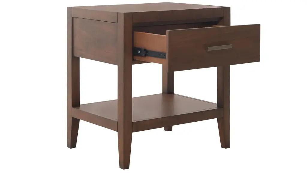 Add style and storage to your bedroom with the Fremont nightstand. You'll appreciate the drawer space, and the tabletop surface is a convenient platform for a lamp or other items you may need close by. There's also a lower shelf for things like books that you don't mind having tucked away. With natural markings and bar drawer pulls with an antique finish, your bedroom style will be elevated right away with the addition of this treasured piece.