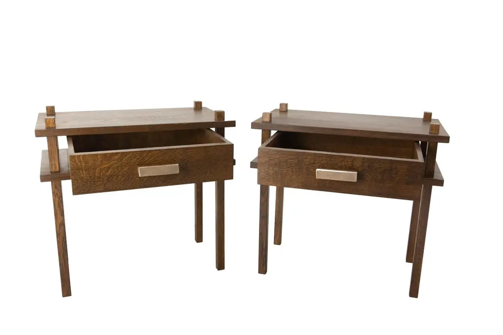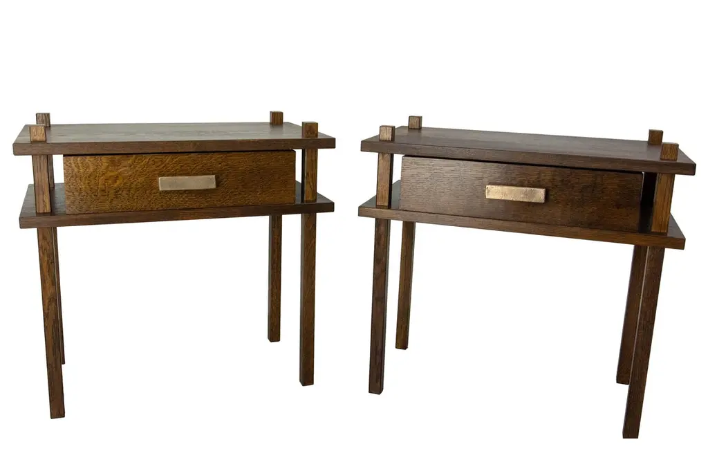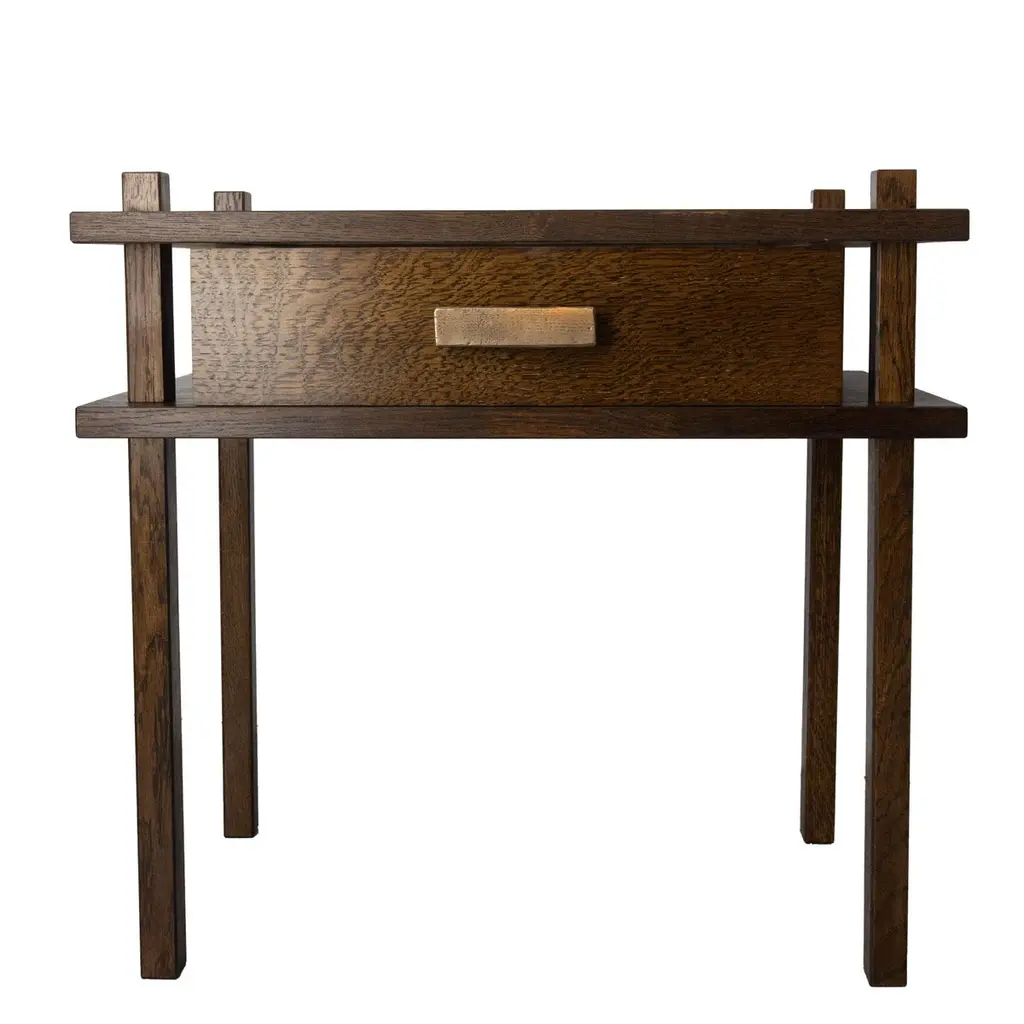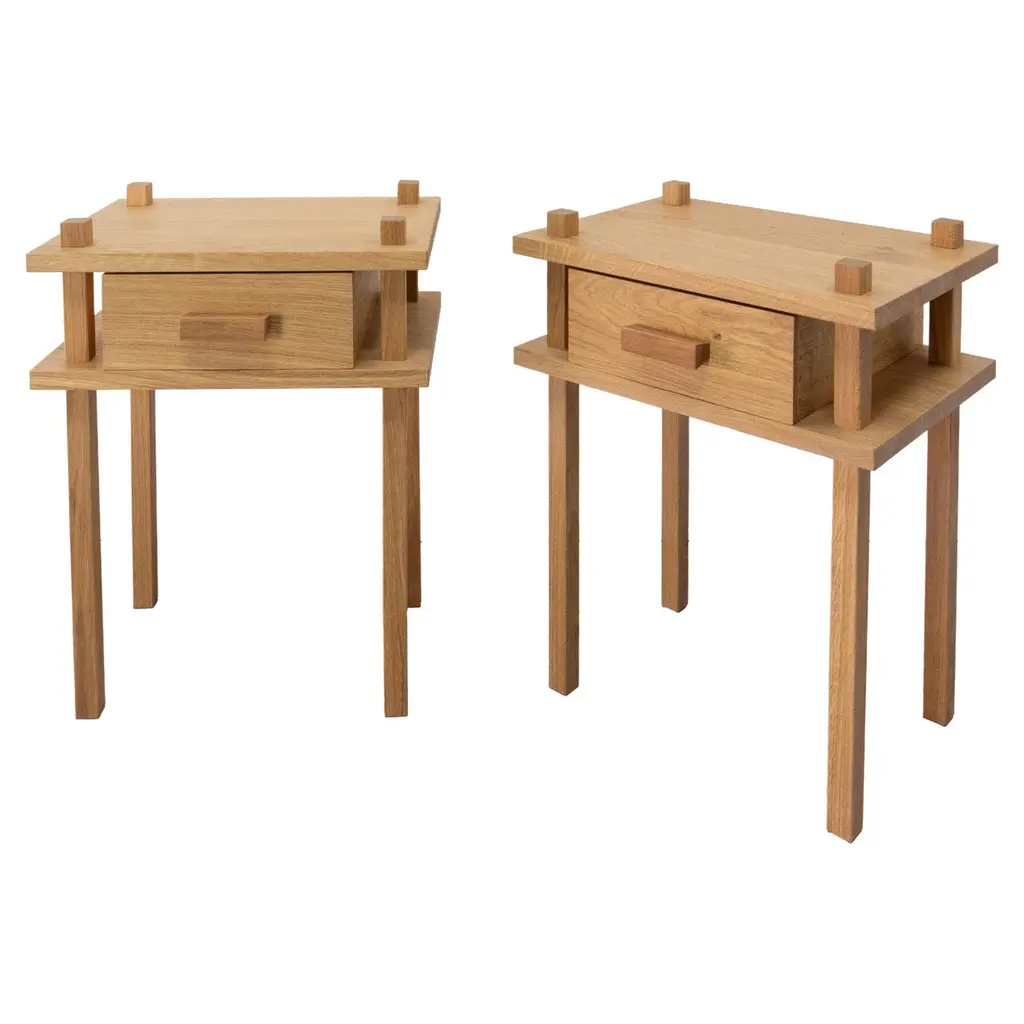 This bedside cabinet cabinet with the traditional technique is chalet chic style thanks to its simple aesthetic and its bronze handle.This pair of oak nightstands of the "Pyrénées" series is signed by Sébastien Lamarre for Maison Marie Anne. The creator chose for the Pyrénées model an invisible sliding system for the drawers.Waxed finish.Top height:23.62 in. (60 cm)New and can be made on demand. If you wish other dimensions just tell us.