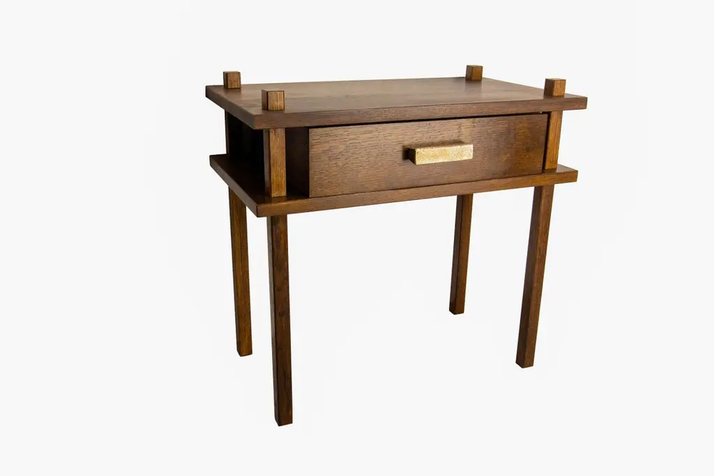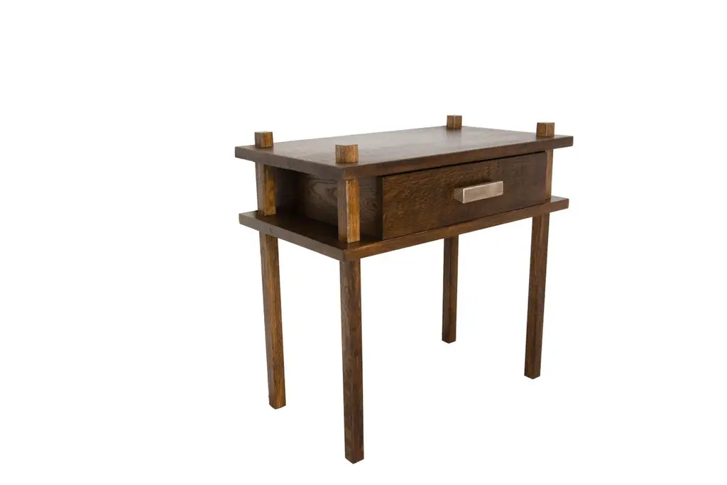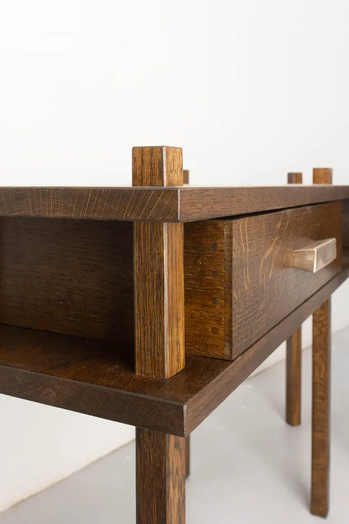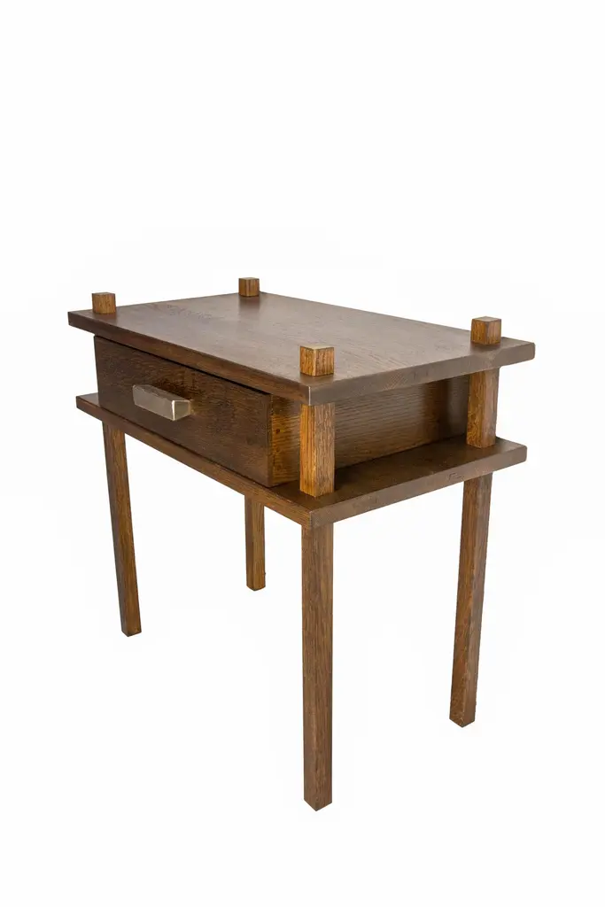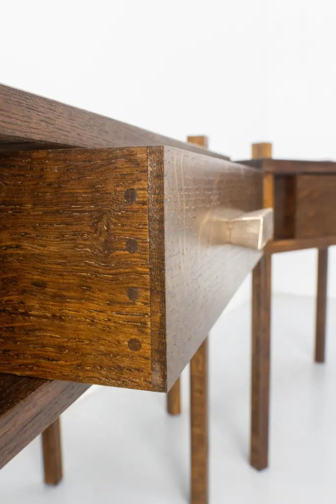 This bedside cabinet cabinet with the traditional technique is chalet chic style thanks to its simple aesthetic and its bronze handle.This pair of oak nightstands of the "Pyrénées" series is signed by Sébastien Lamarre for Maison Marie Anne. The creator chose for the Pyrénées model an invisible sliding system for the drawers.Waxed finish.Top height:23.62 in. (60 cm)New and can be made on demand. If you wish other dimensions just tell us.