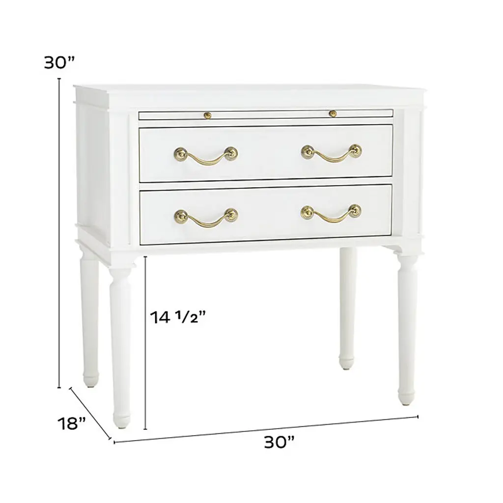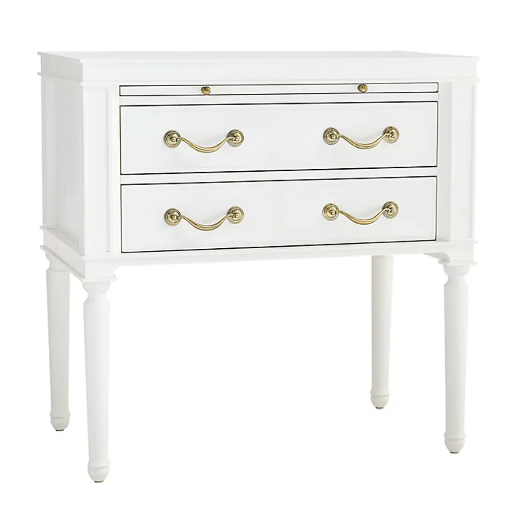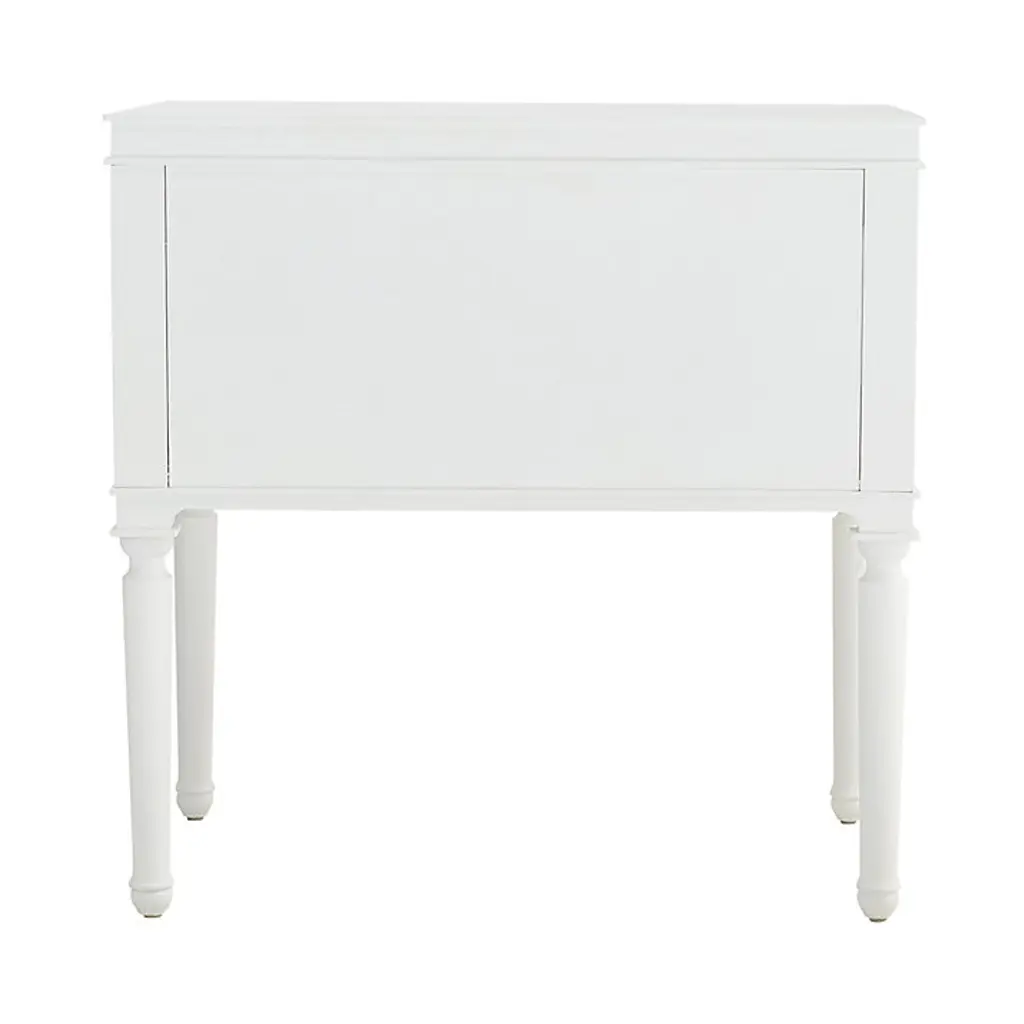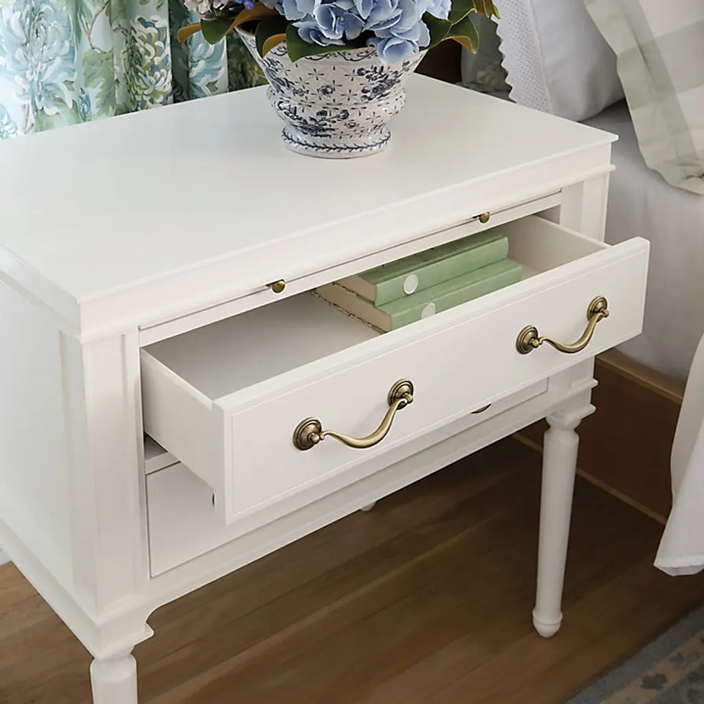 Inspired by classic Louis XVI styling, our Gabriella Bedroom Collection rekindles the dream of old world romance. The subtly feminine silhouettes are hand crafted of hardwood with fresh white finish and inset panels framed in smooth pencil molding. Slow-close drawers open with swooped antique brass pulls. Slender tapered, turned legs elevate each piece in this timeless bedroom ensemble for a light, elegant look. The 2-Drawer Nightstand features a hidden shelf just beneath the top that pulls out with petite brass knobs to create extra space for a glass or nighttime reading. Gabriella 2-Drawer Nightstand features: