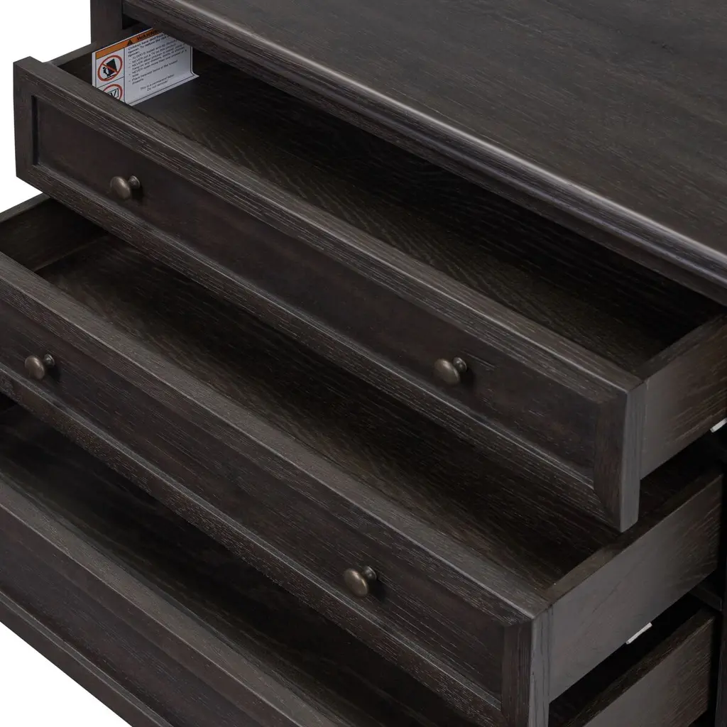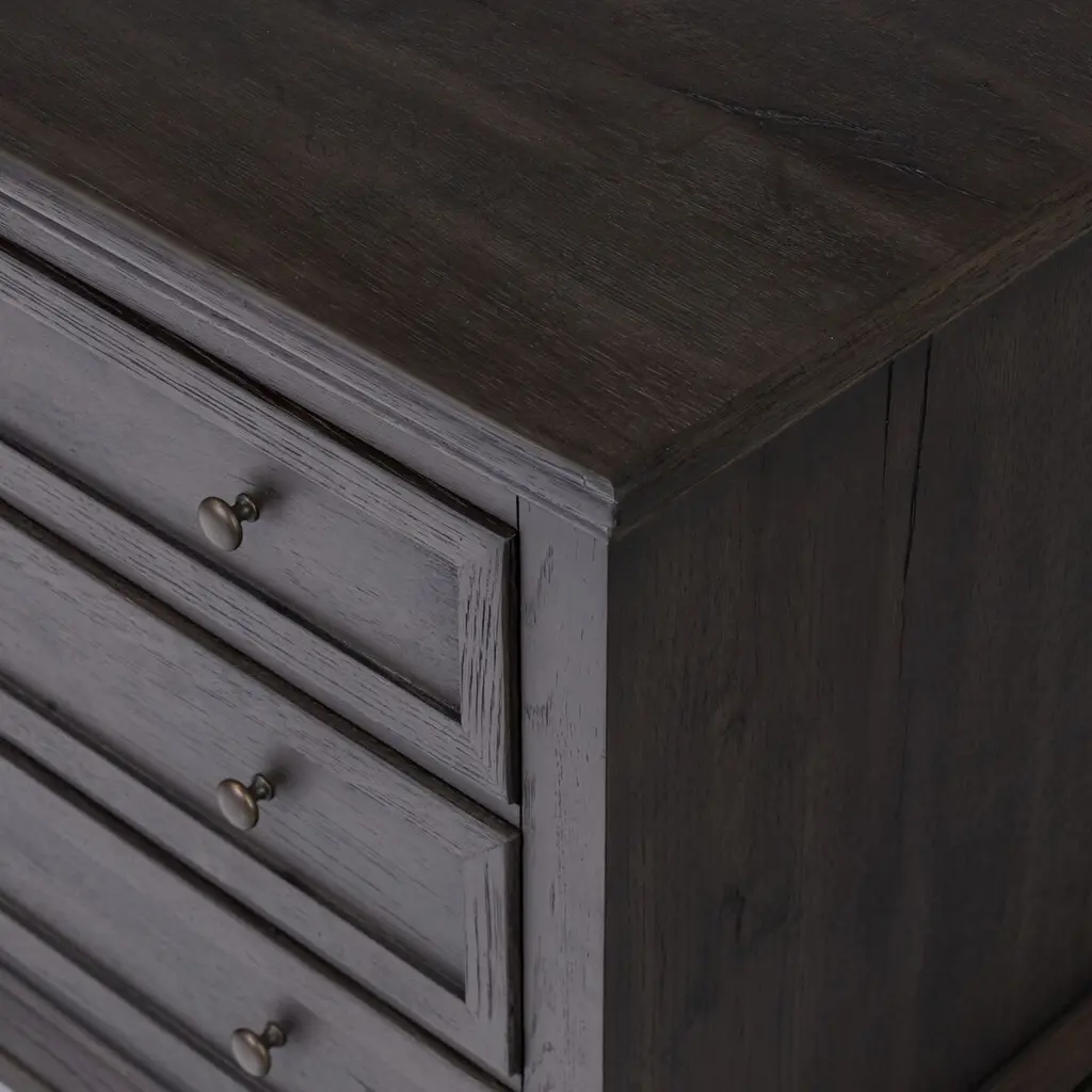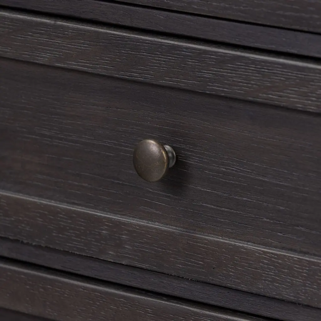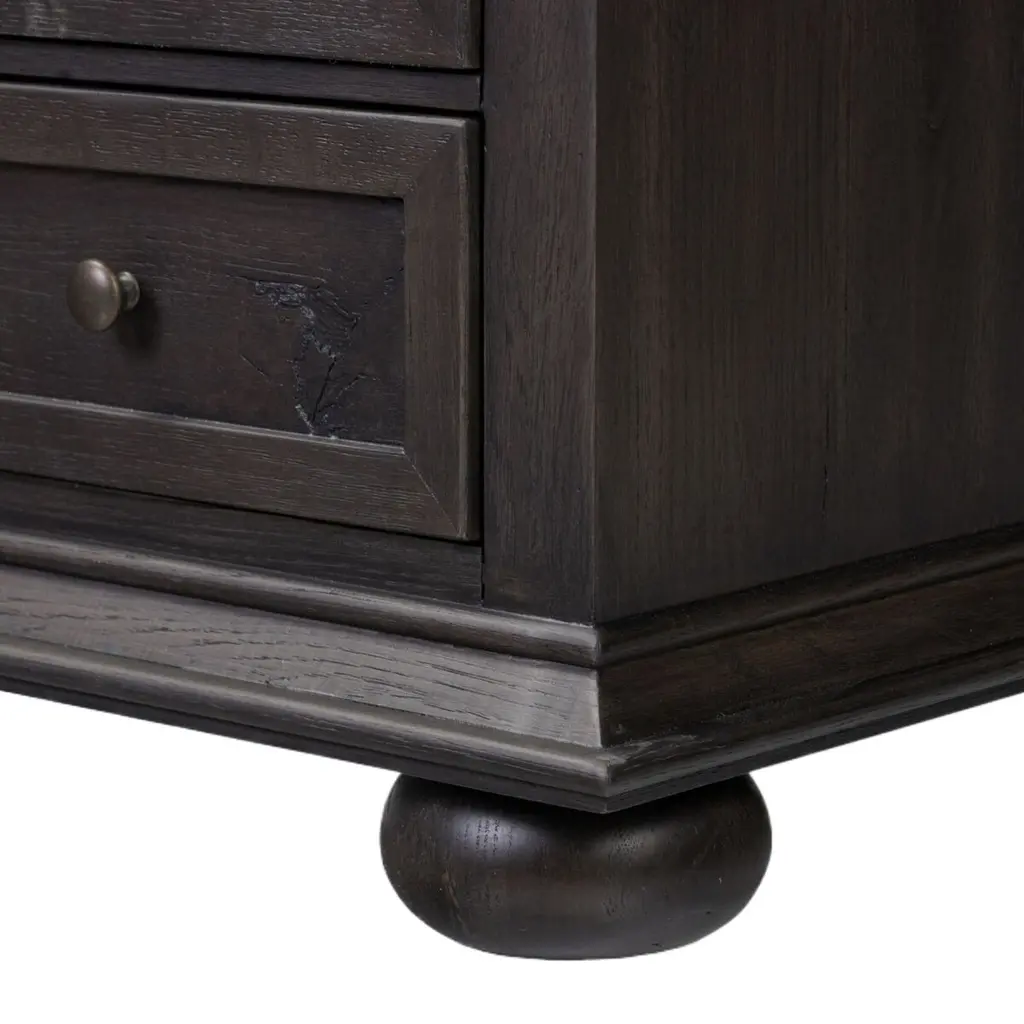 Oak veneer with natural marks and graining reflect the heritage inspiration behind this versatile piece. Intricate molding, bun feet, and brushed brass hardware complete the look. A design collaboration by Amber Lewis and Four Hands.